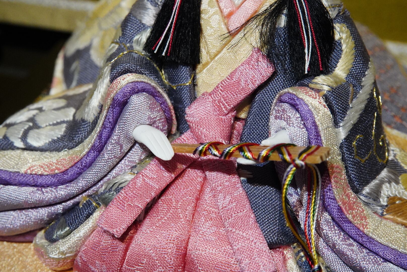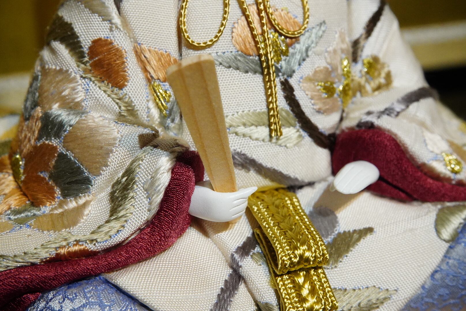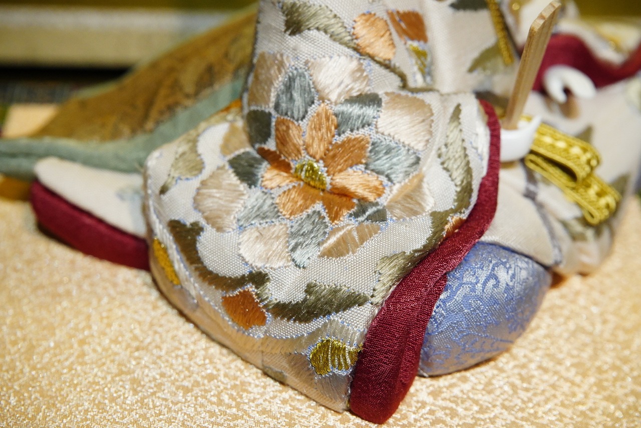 お内裏様は白と淡い金を基調とした装束に、赤紫の差し色を添えて凛とした印象に。お雛様は優美な藤色と桜色の衣を幾重にも重ね、柔らかな華やぎを漂わせています。衣裳の一針一針には、伝統の木目込技法ならではの繊細な美が息づいています。