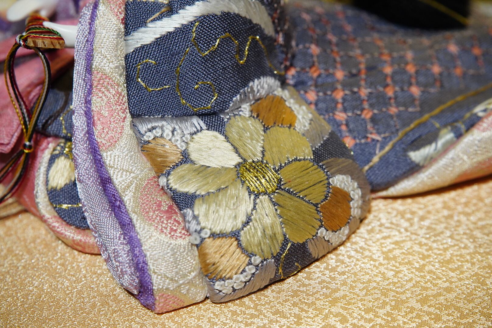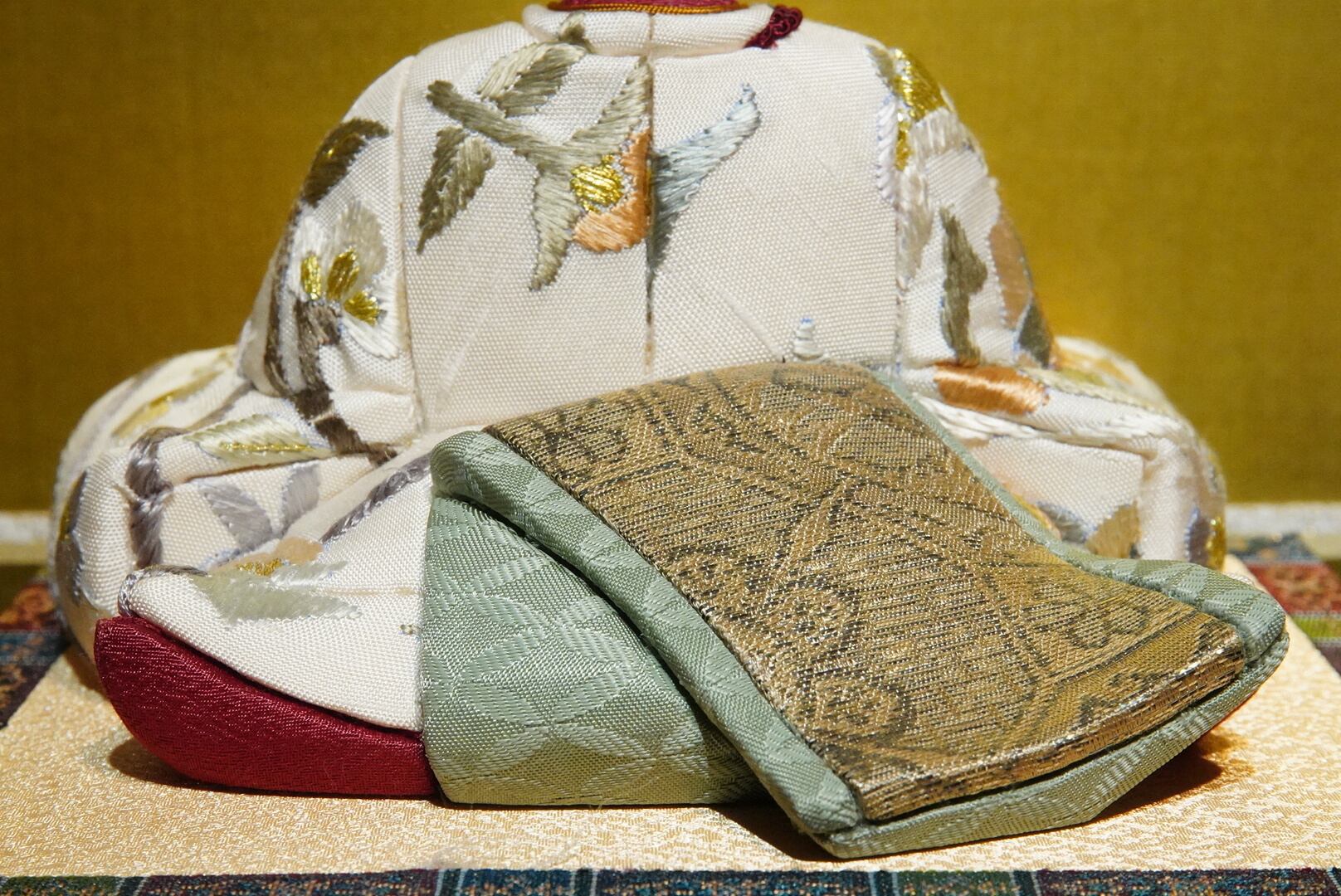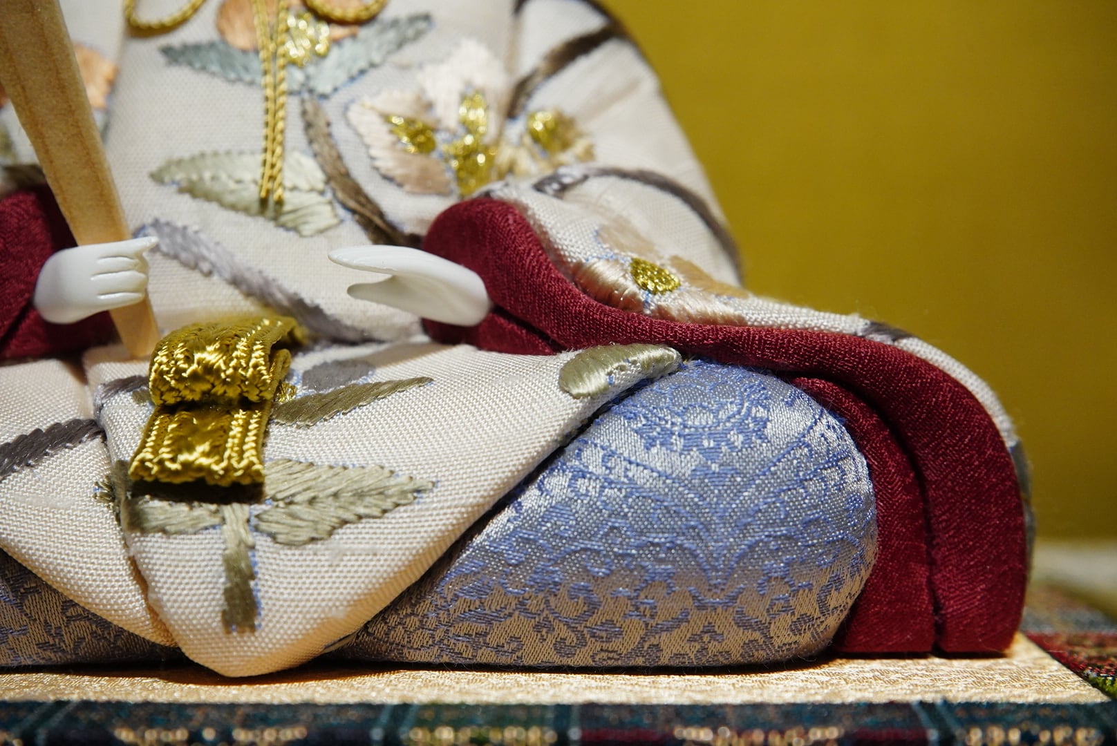 お内裏様は白と淡い金を基調とした装束に、赤紫の差し色を添えて凛とした印象に。お雛様は優美な藤色と桜色の衣を幾重にも重ね、柔らかな華やぎを漂わせています。衣裳の一針一針には、伝統の木目込技法ならではの繊細な美が息づいています。