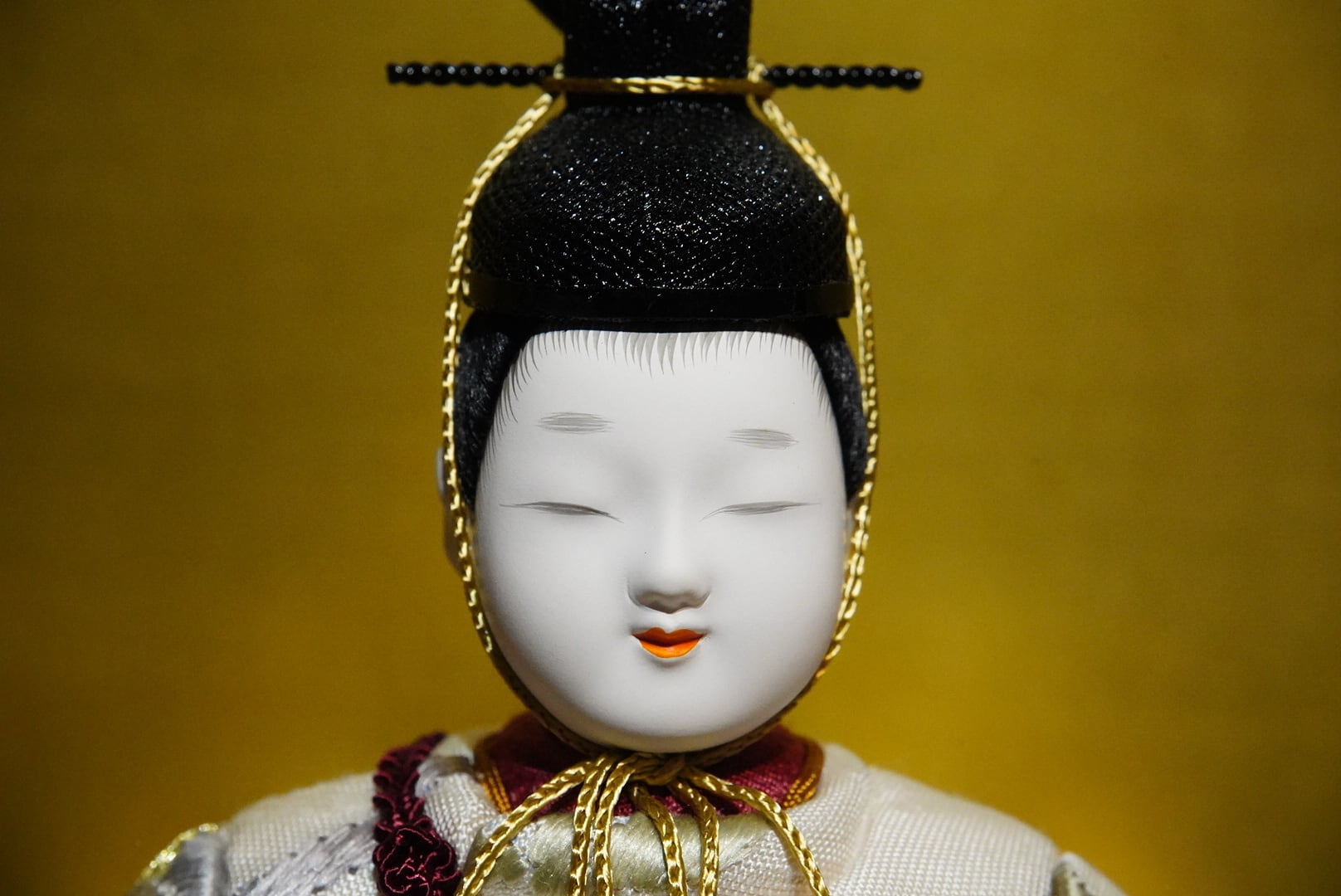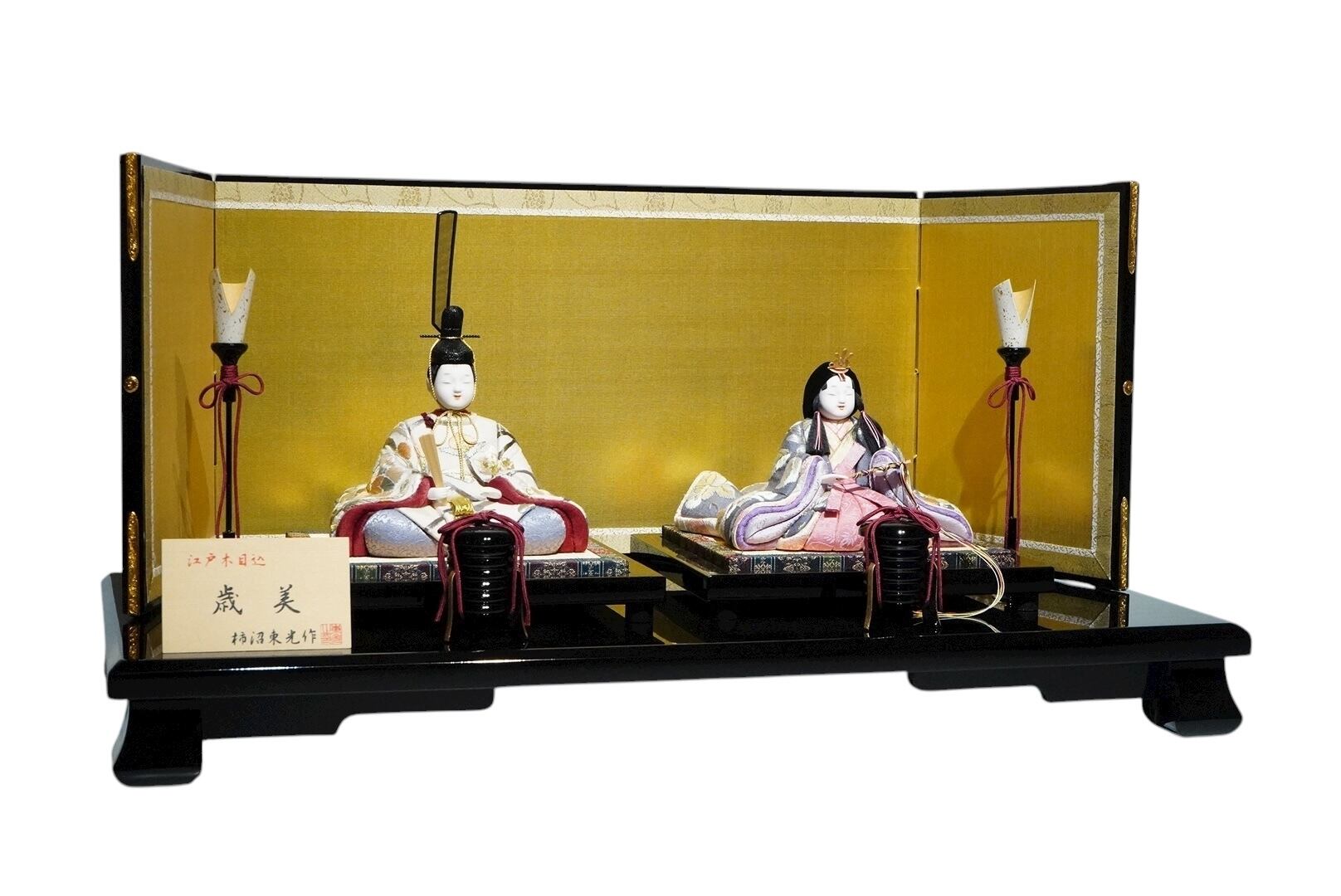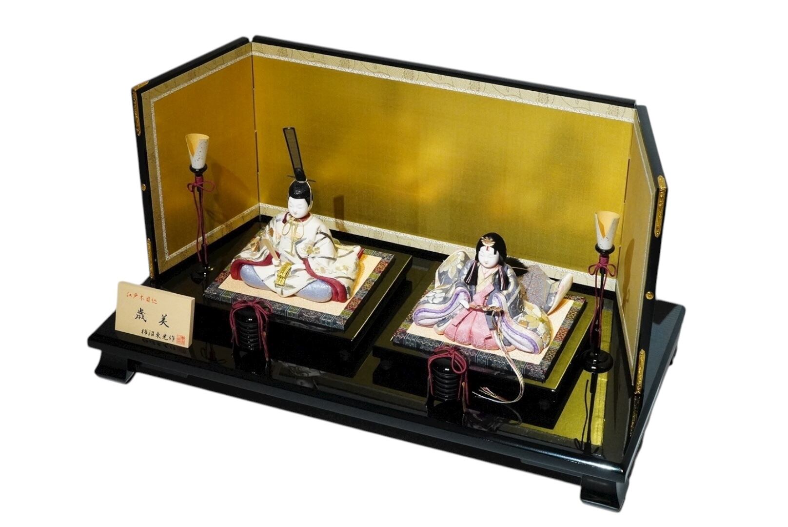背景の金屏風が柔らかな光を受けて人形の表情を引き立て、黒塗りの台座が全体を上品にまとめ上げます。落ち着いた色調の中に、格別の存在感と格調を感じさせる一飾りです。