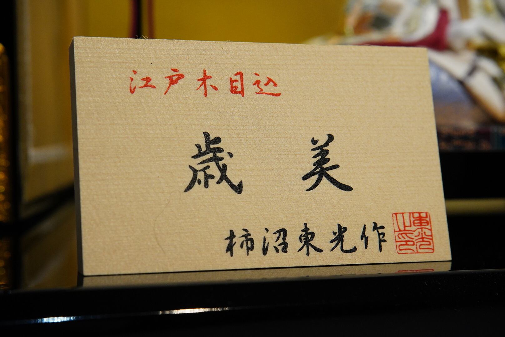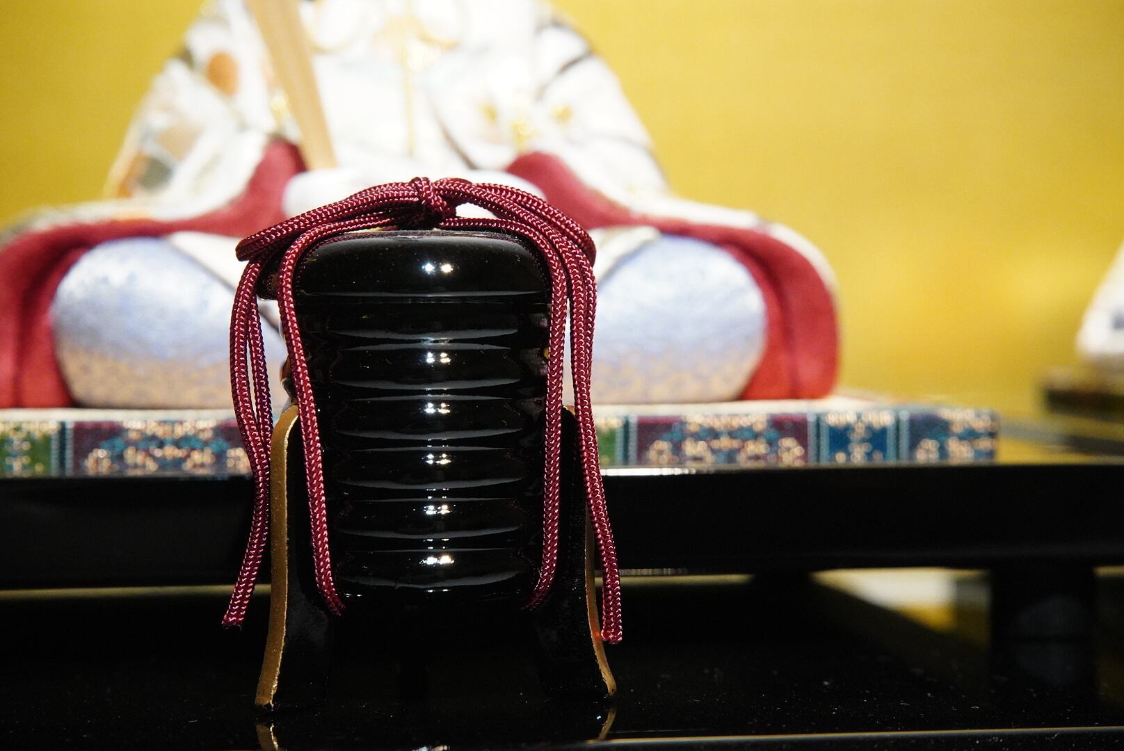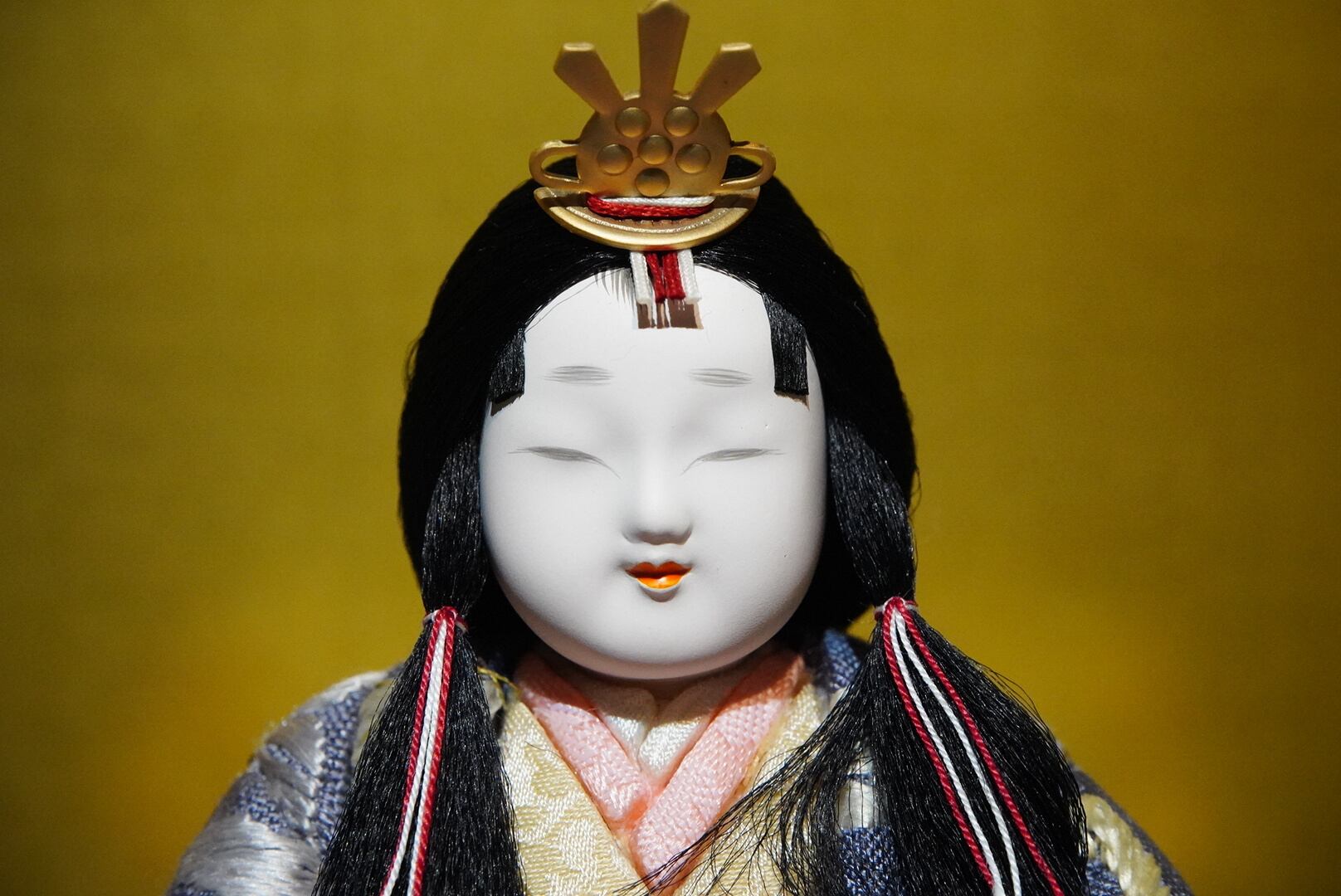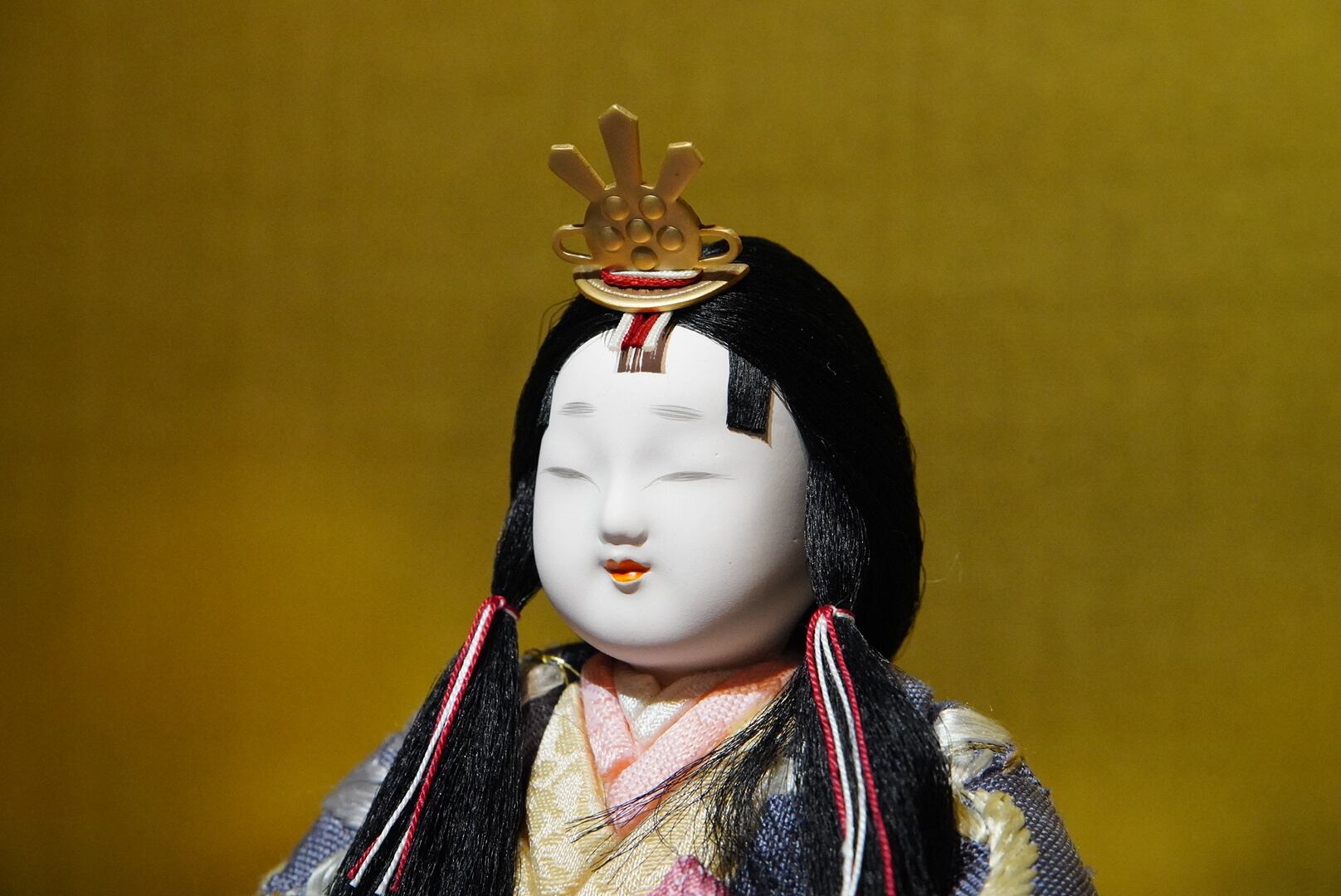 背景の金屏風が柔らかな光を受けて人形の表情を引き立て、黒塗りの台座が全体を上品にまとめ上げます。落ち着いた色調の中に、格別の存在感と格調を感じさせる一飾りです。