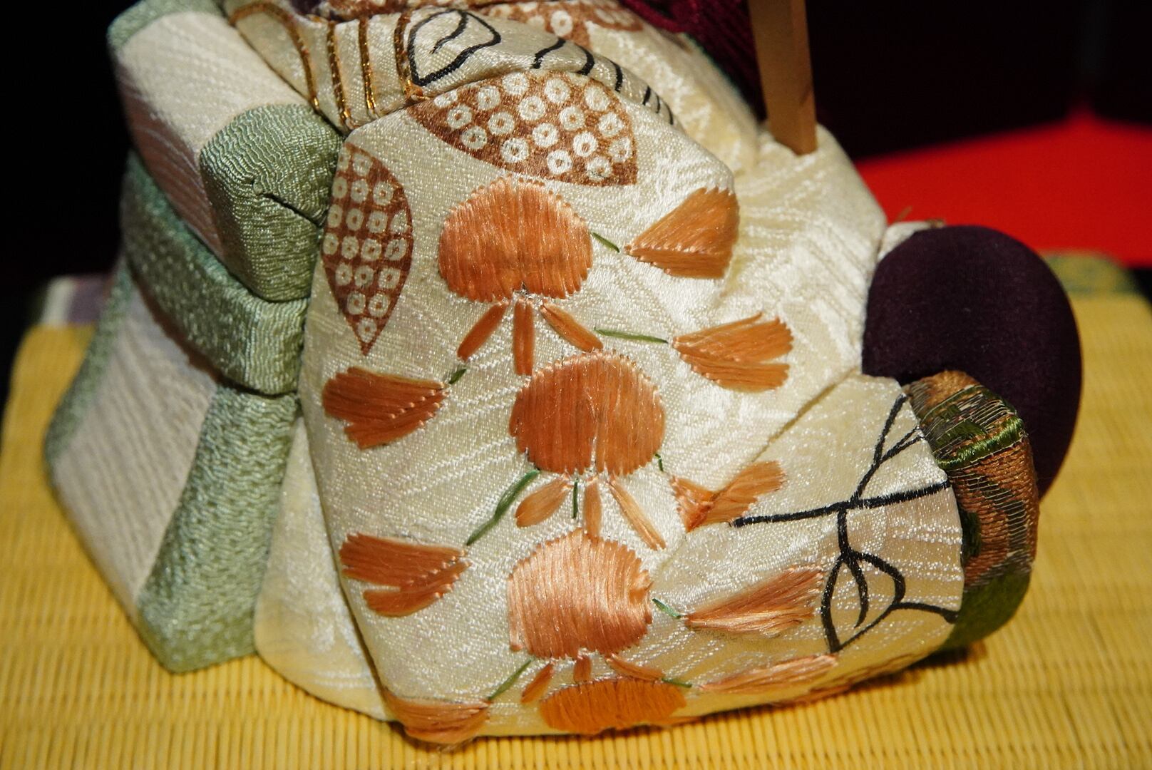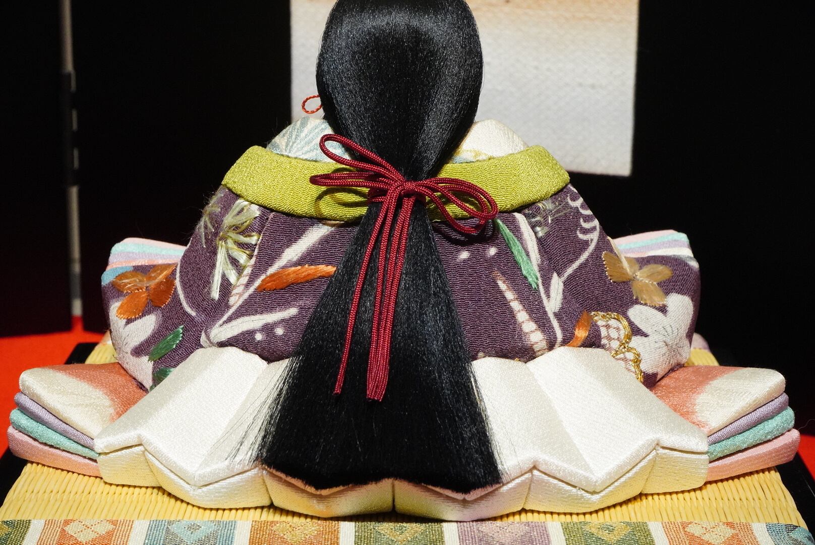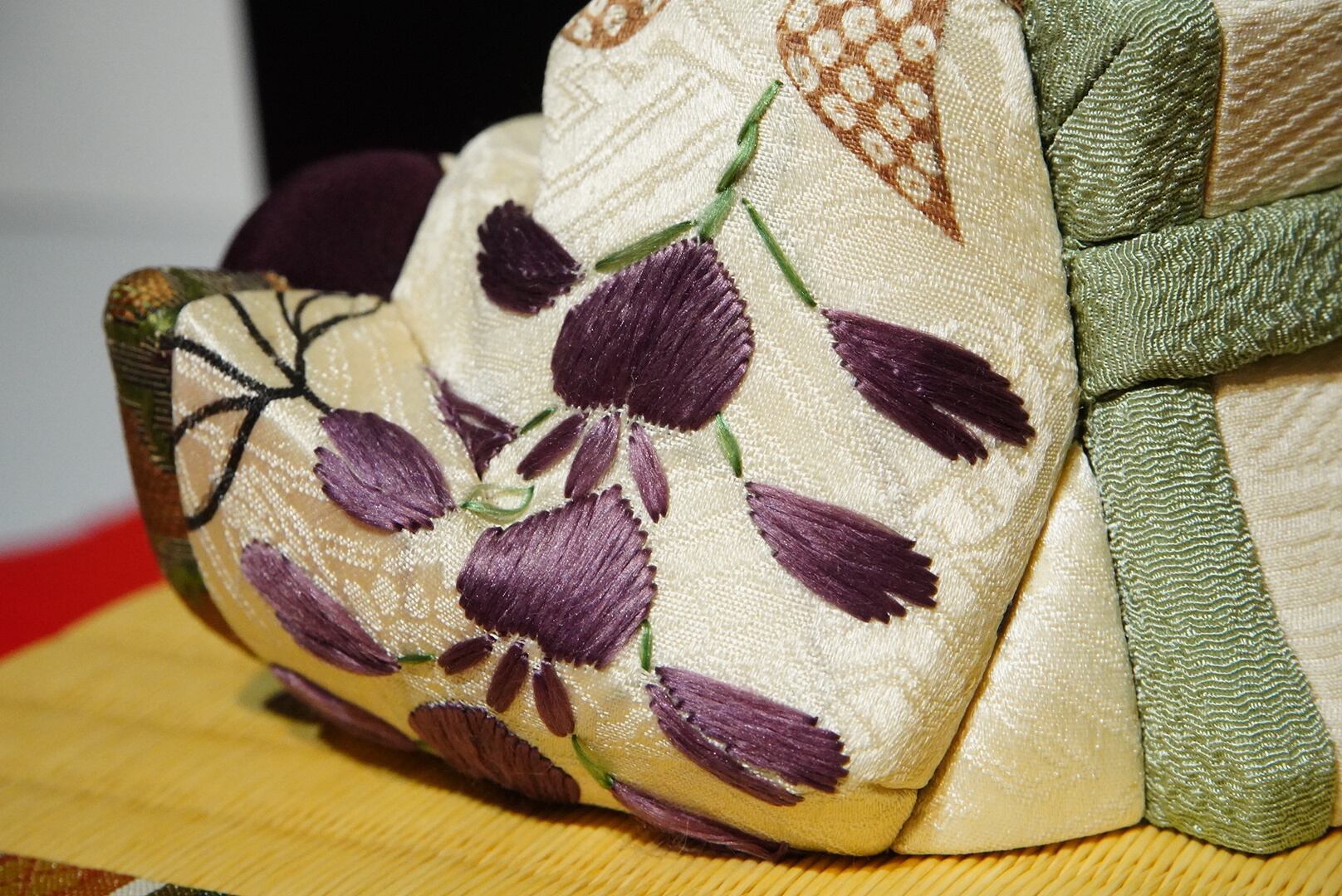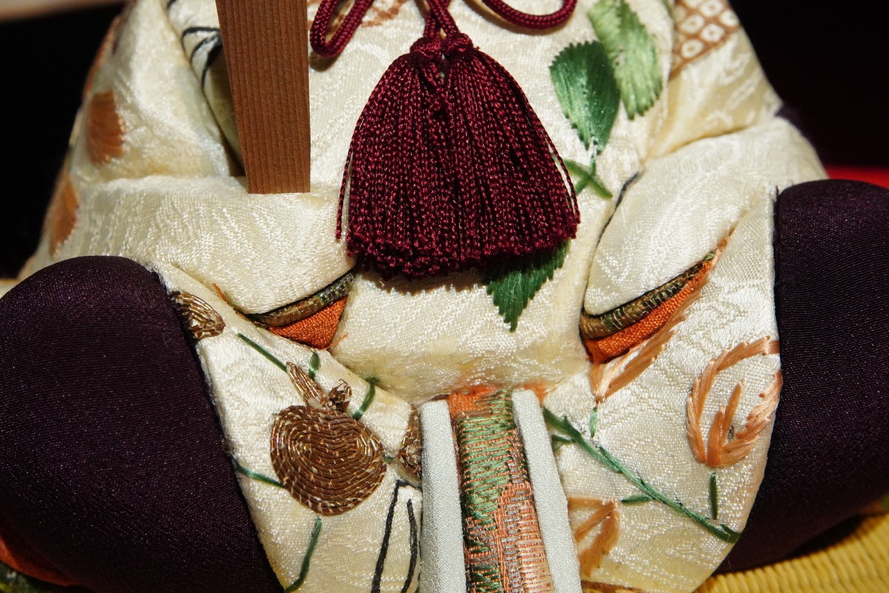 お殿様の衣裳には、江戸時代後期の綸子刺繍の裂を使用。絹糸が織りなす上品な光沢と、時を超えて受け継がれた文様が、気品と深みを漂わせます。お雛様には同じく江戸後期の縮緬刺繍の裂を纏わせ、柔らかな風合いと繊細な色合いが優美な調和を生み出しています。
