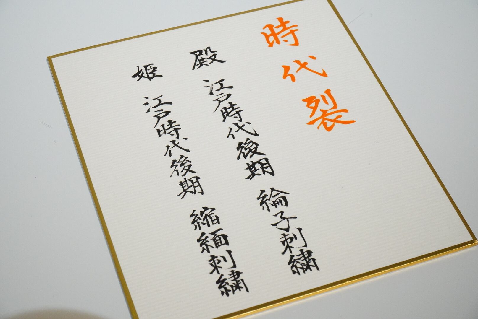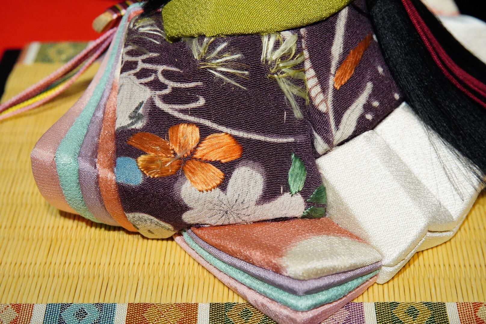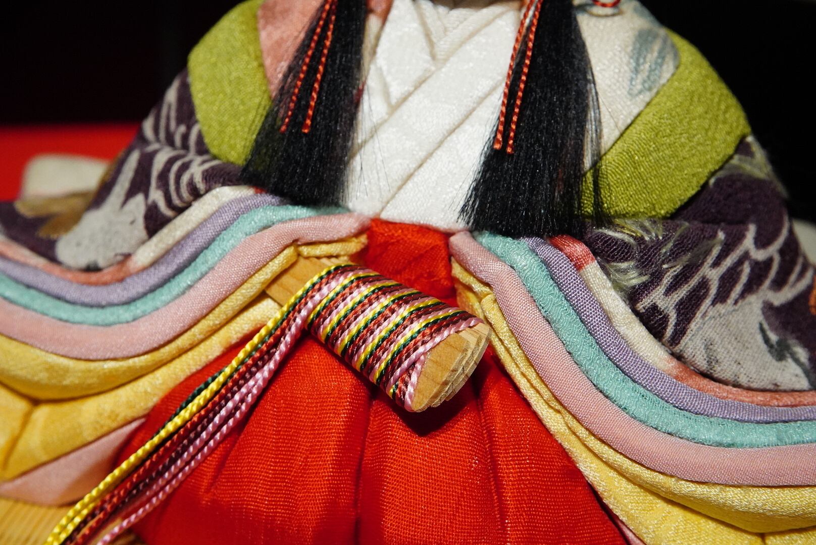 お殿様の衣裳には、江戸時代後期の綸子刺繍の裂を使用。絹糸が織りなす上品な光沢と、時を超えて受け継がれた文様が、気品と深みを漂わせます。お雛様には同じく江戸後期の縮緬刺繍の裂を纏わせ、柔らかな風合いと繊細な色合いが優美な調和を生み出しています。