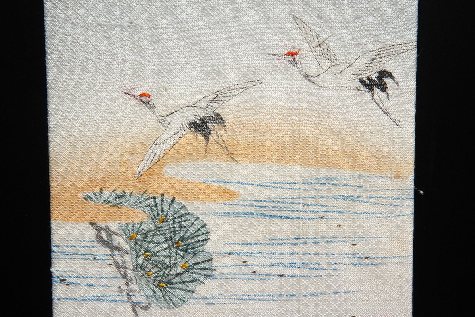 屏風には、松と鶴が描かれた雅な意匠を配し、吉祥の象徴としてお二人を優しく引き立てます。漆黒の台と屏風が生地の美しさを際立たせ、古典の風格と現代の洗練が見事に融合。