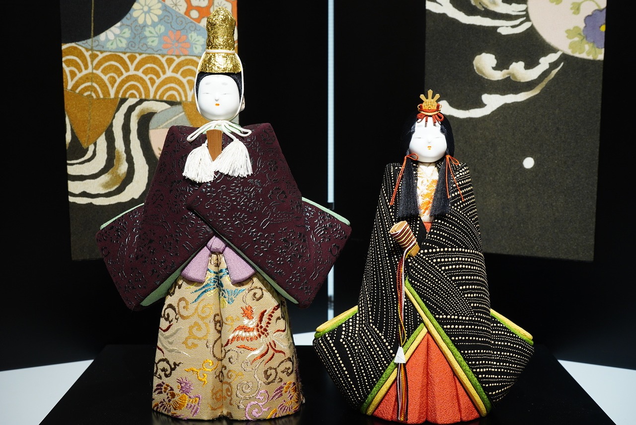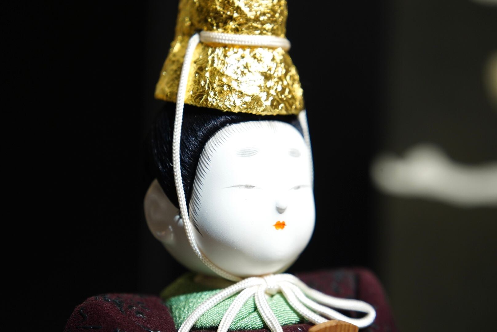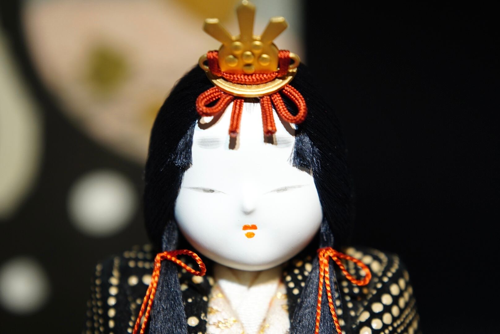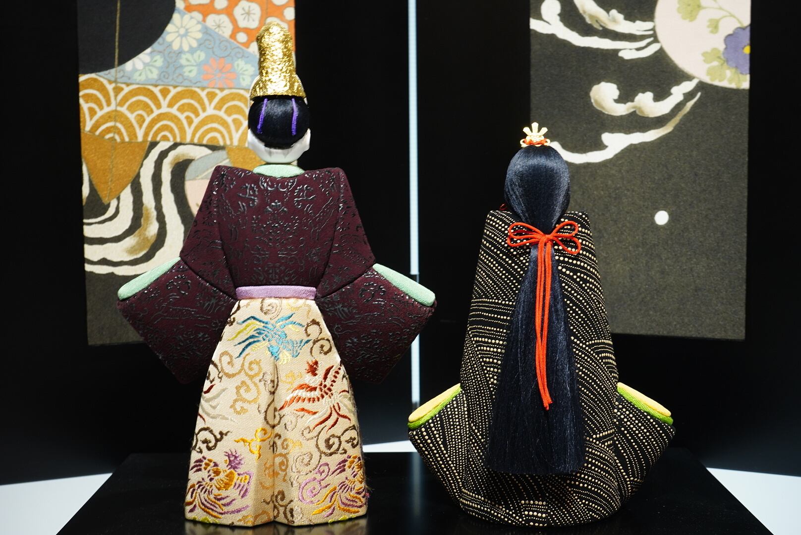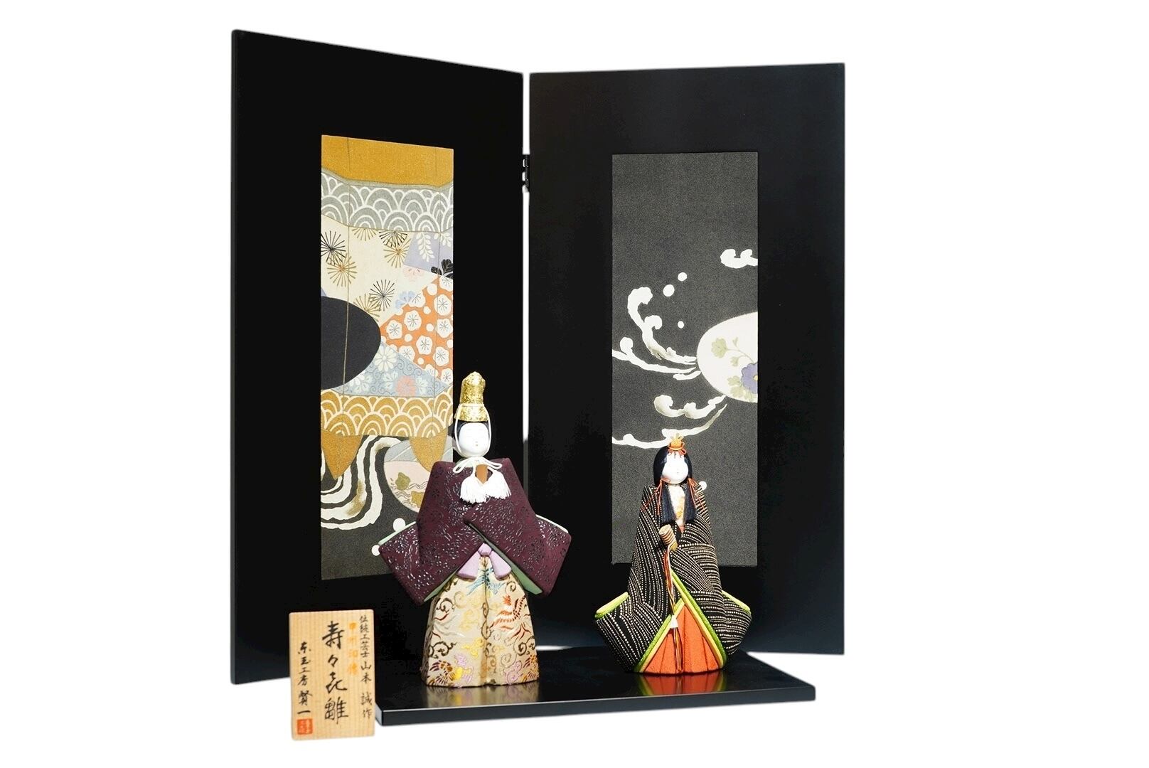 伝統技法「甲州印伝」の上質な質感が際立つ、唯一無二の逸品。落ち着いた空間に静かな華を添える、格調高いひな飾りです。