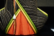 お内裏様は気品漂う葡萄色の印伝衣裳に金彩をあしらい、重厚感の中にも温かみを感じさせる佇まい。お雛様は繊細な黒地の印伝模様に鮮やかな朱と若草色を重ね、凛とした中に華やぎを添えています。