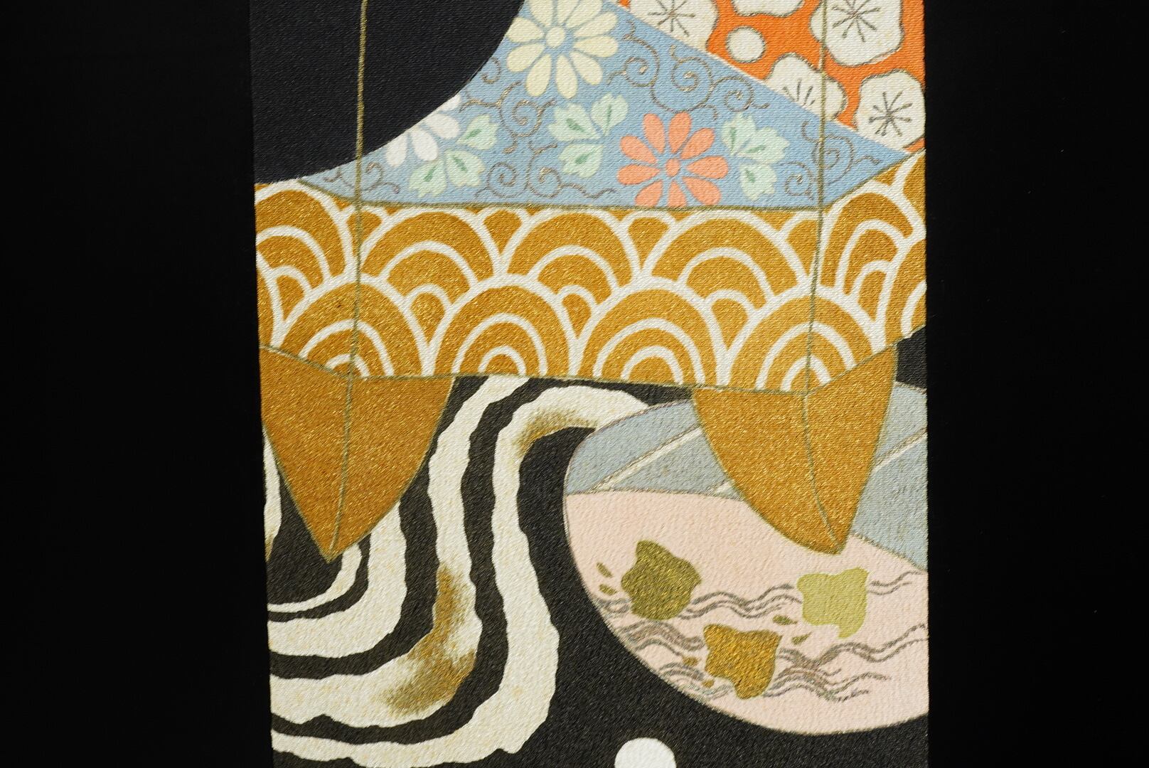 背後には、雅やかな和文様と月夜を思わせる意匠を配した黒屏風。シックな中にも洗練された印象を放ち、現代のインテリアにも美しく調和します。