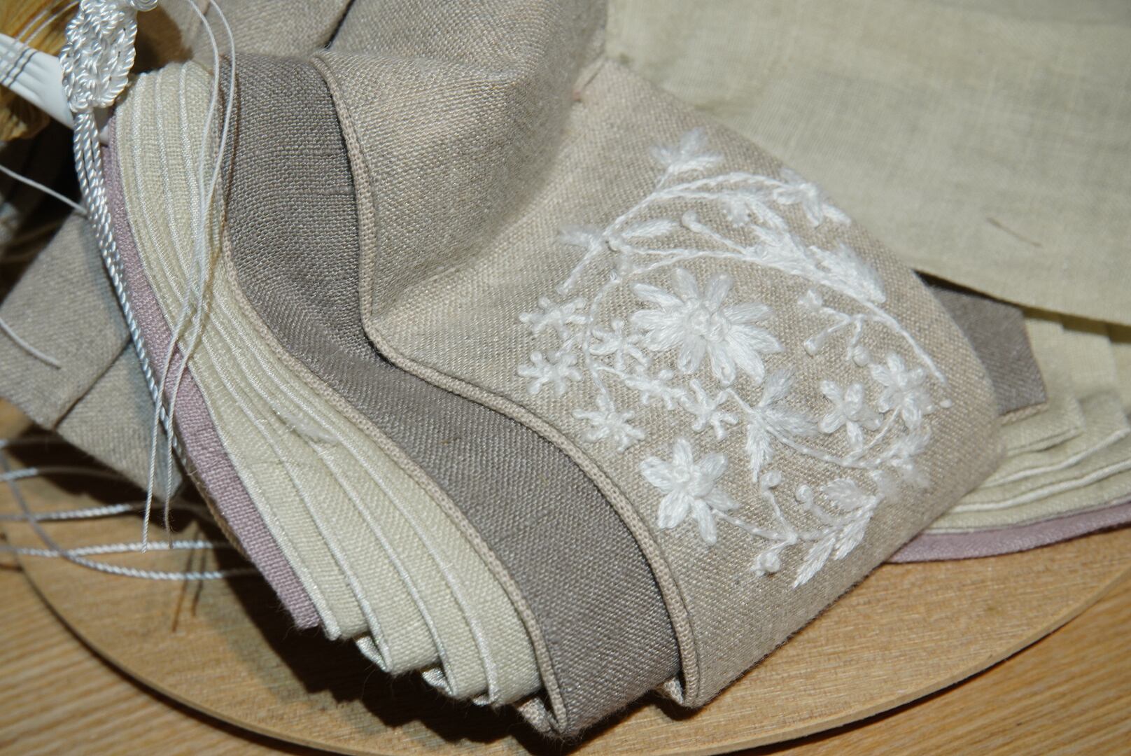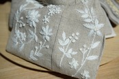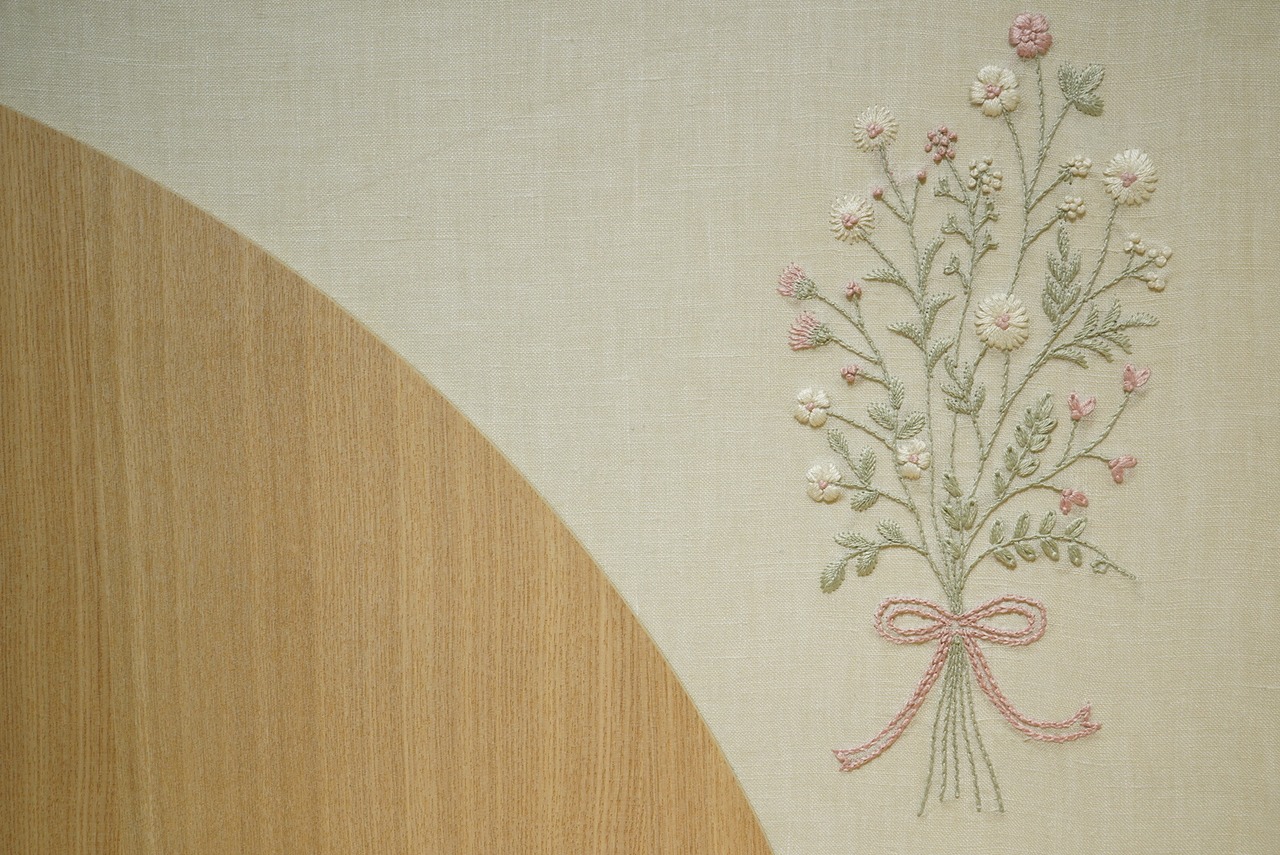 柔らかな木目が美しい屏風は、片側に穏やかな弧を描くデザインを取り入れ、奥行きと静けさを感じさせる仕上がり。中央には繊細な刺繍で描かれた花々が彩を添え、そっと春の息吹を表現しています。
