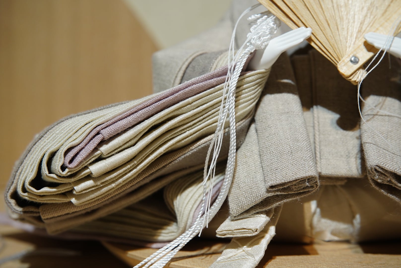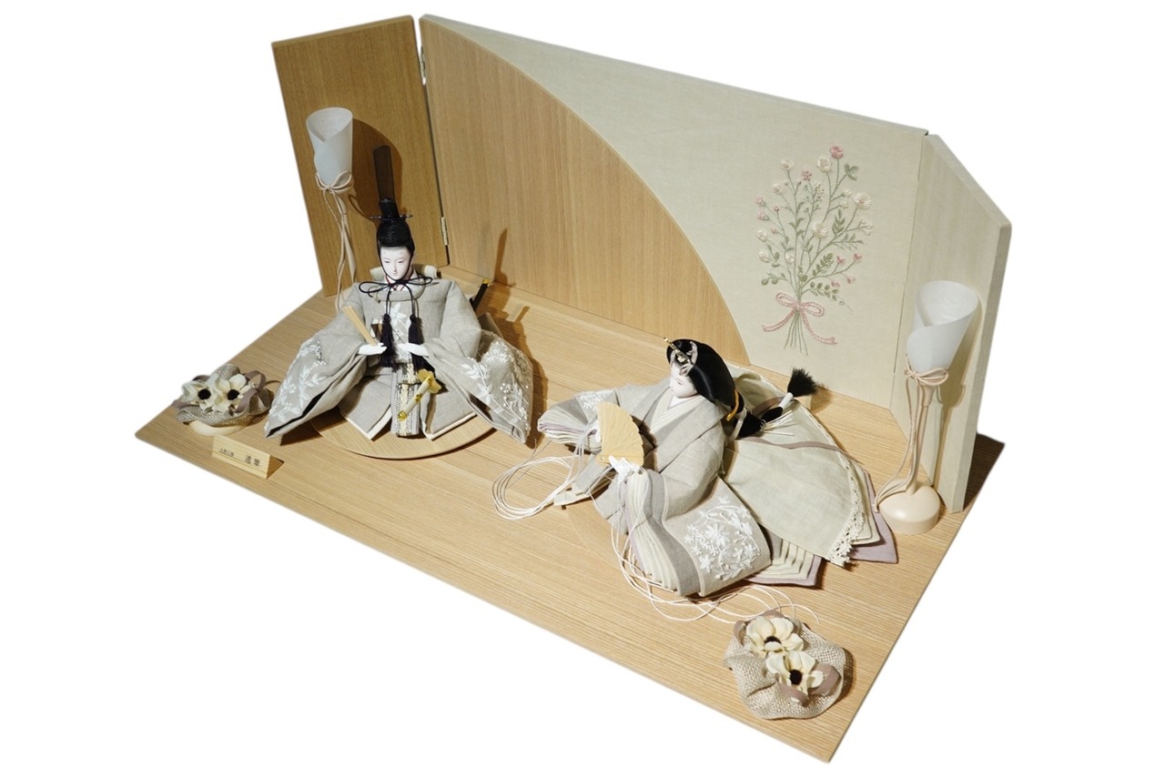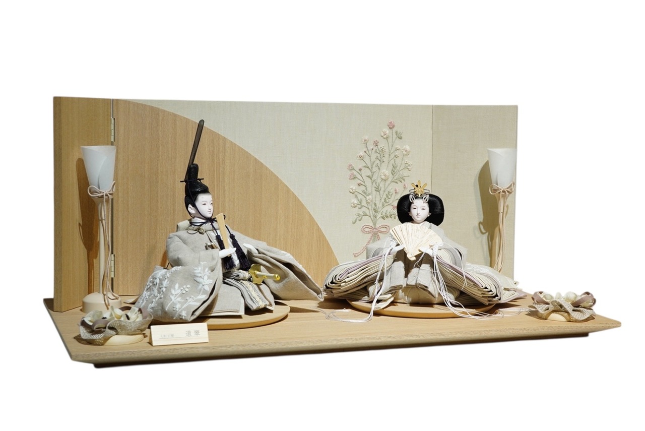 自然素材の温もりと上品な色合いが調和した、優雅で落ち着いた佇まいの親王飾りです。