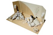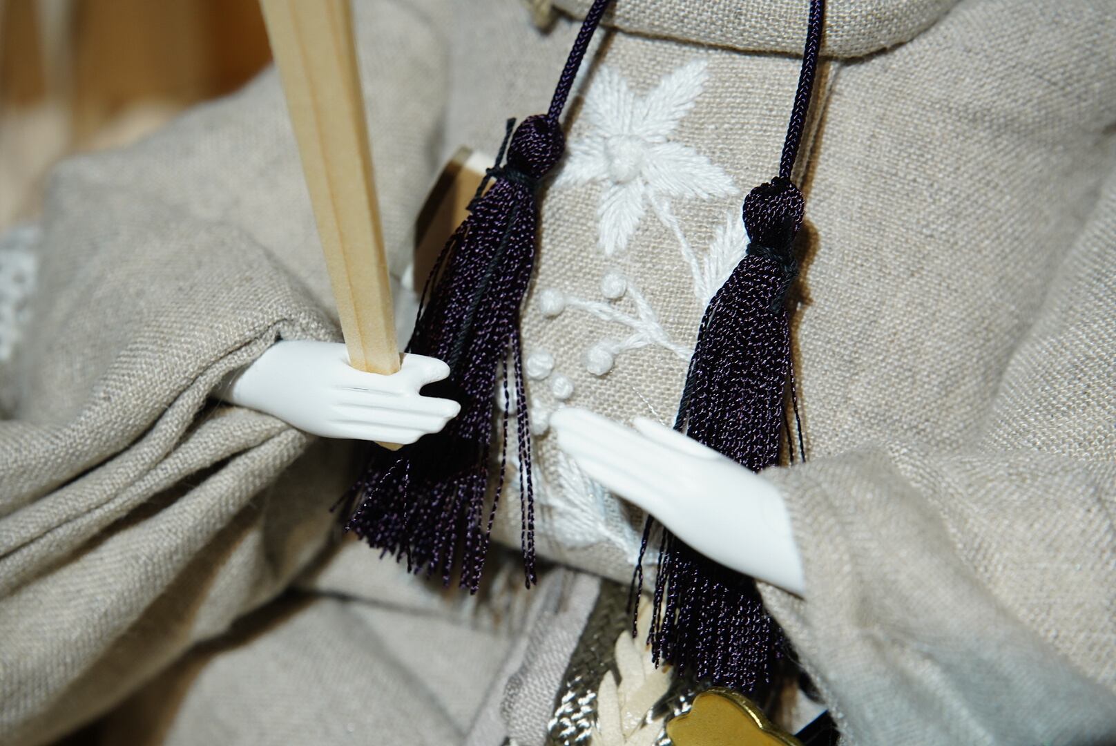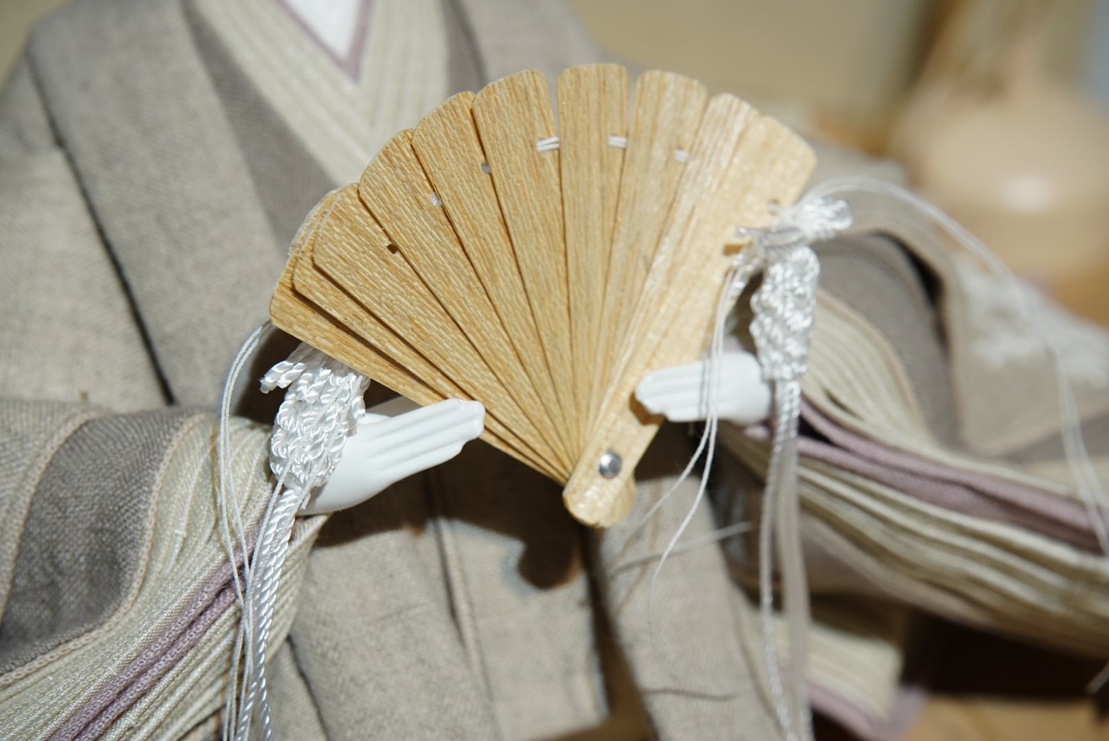 お殿様・お姫様の衣装は、生成りや淡いベージュを基調とした上質な色合わせ。やさしい風合いの布地に、控えめながら丁寧な紋様があしらわれ、気品と温かみを併せ持つ佇まいを演出します。穏やかな表情の二人は、いつまでも寄り添いながらお子さまの健やかな成長を見守ってくれるようです。