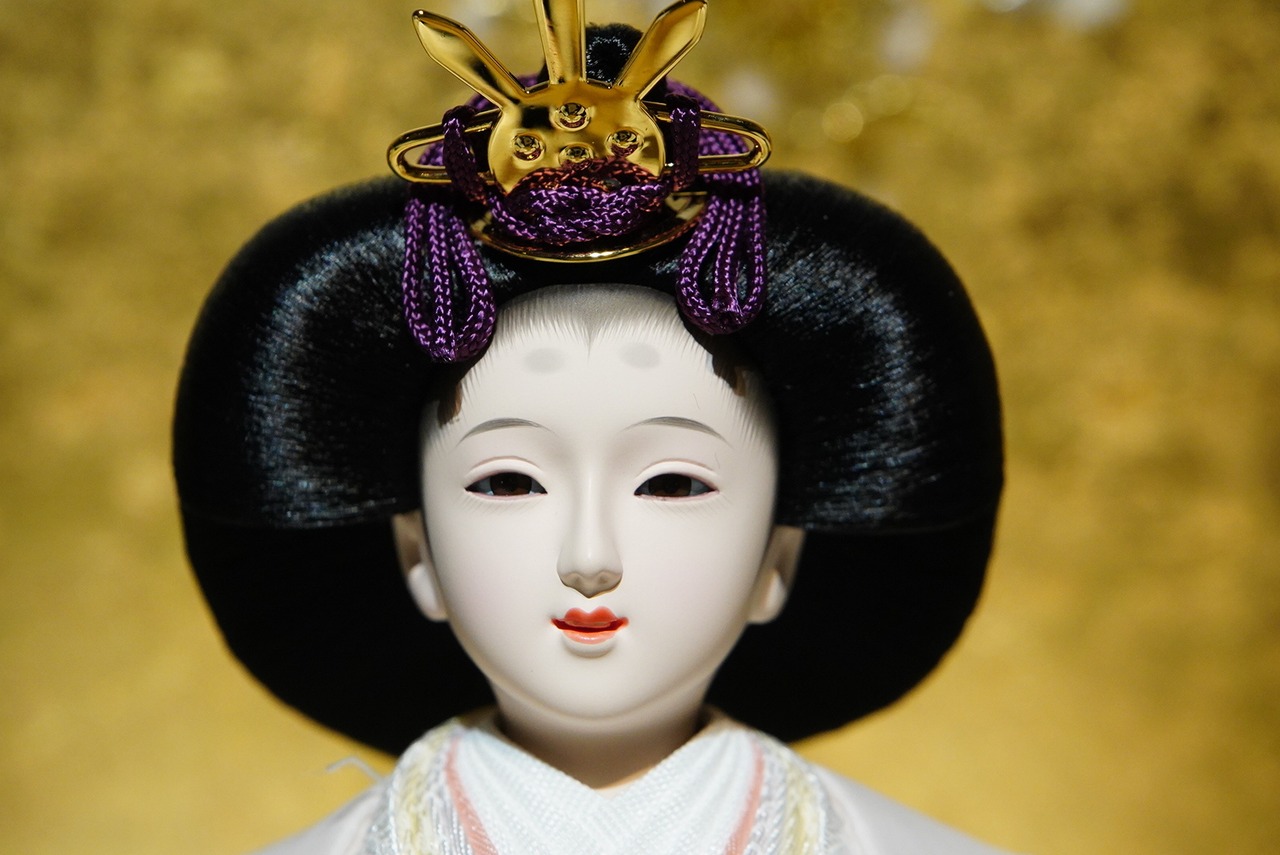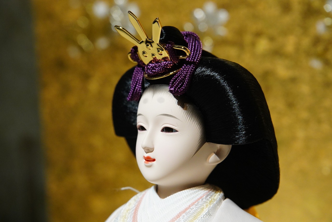 お姫様は白を基調に桃色を重ね、清楚さと華やぎを併せ持つ優美な姿に仕上がっています。ふたりの穏やかな表情は、そっと成長を見守るような温かみを感じさせます。