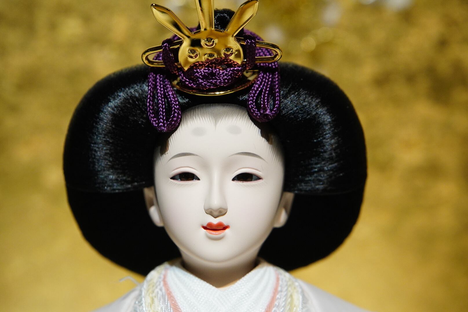 屏風には温かみのある金色の背景を用い、繊細な桜文様が立体的に浮かび上がります。やわらかく光を受けて輝く金の表情が、ひな人形の存在感を上品に引き立てます。
