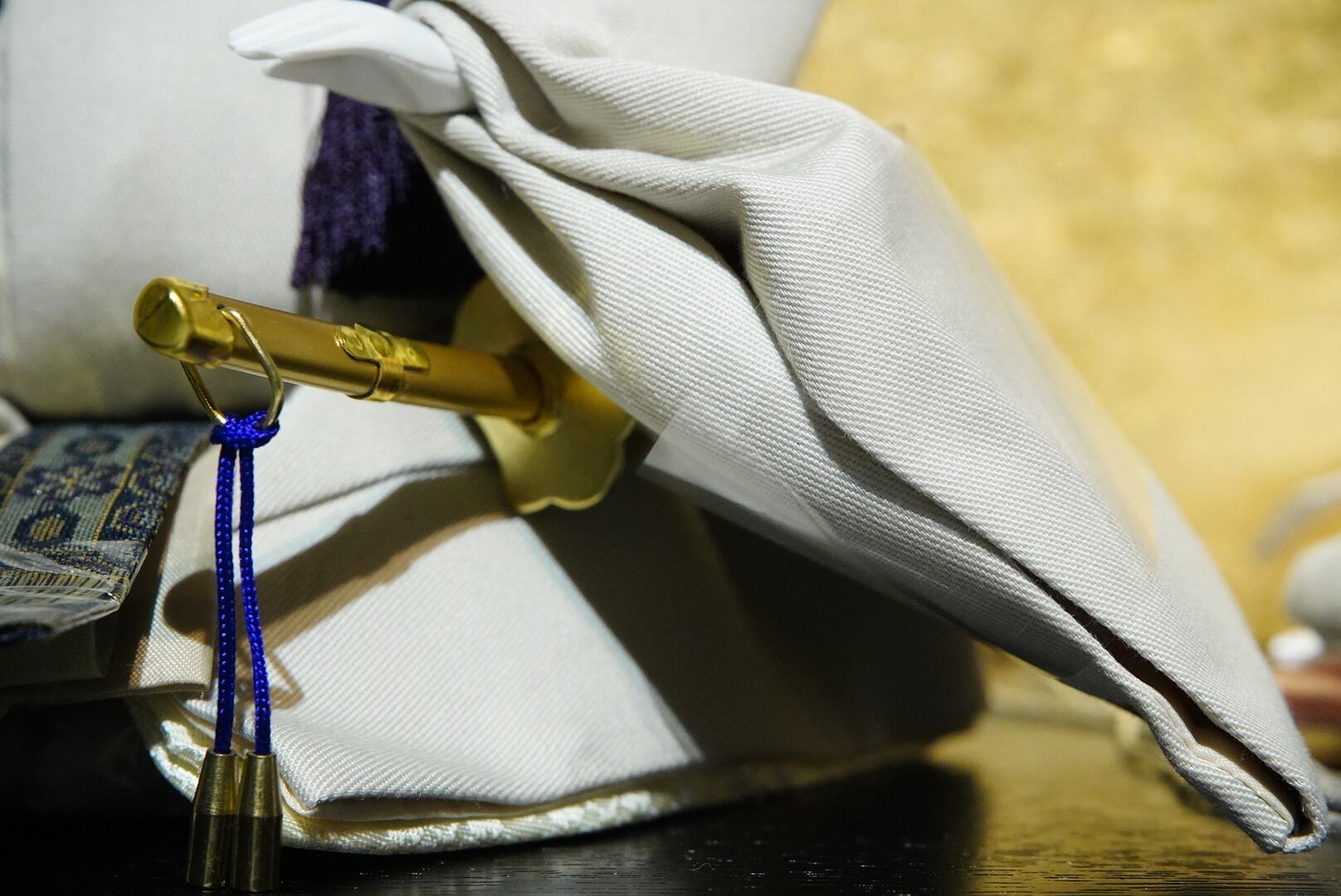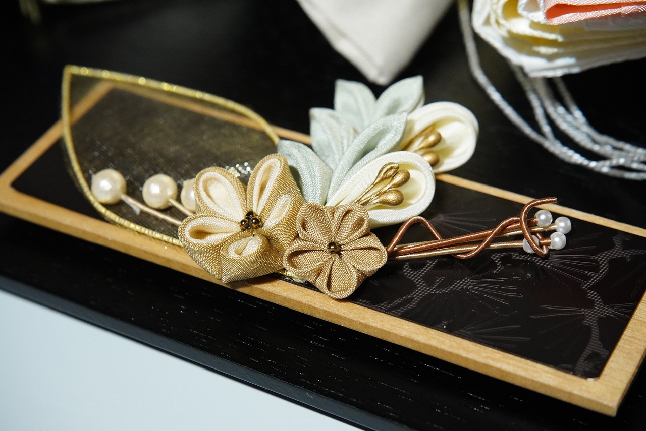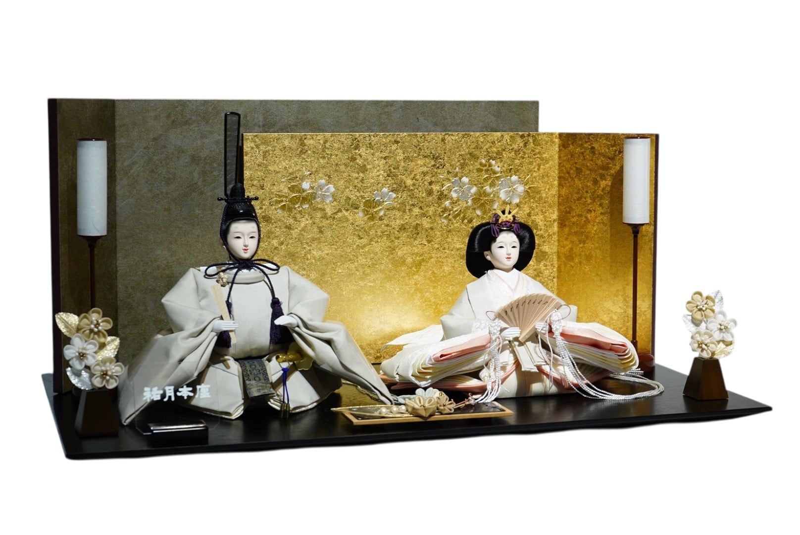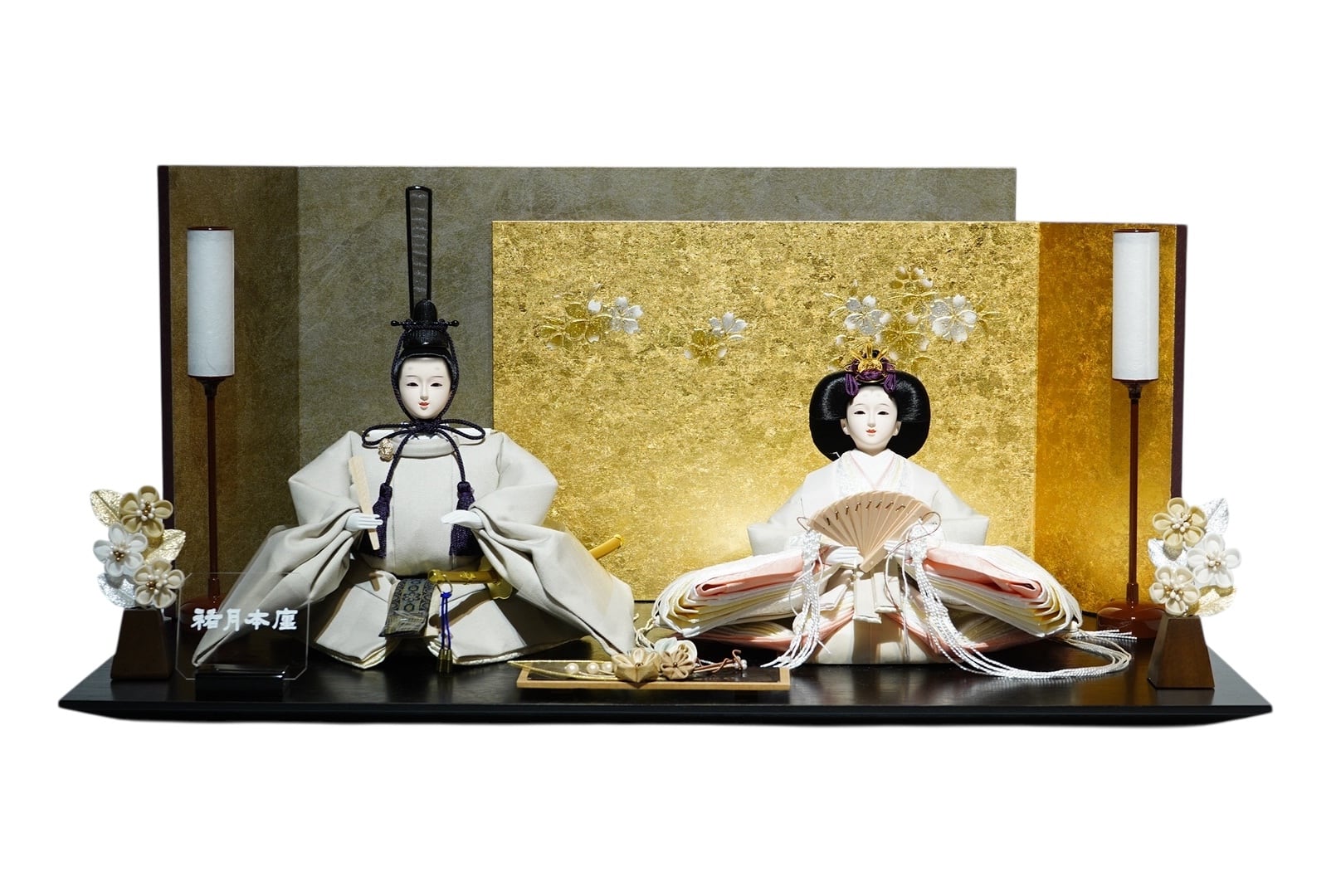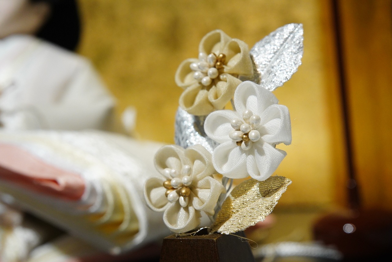 左右の花飾りは金色の背景と美しく調和し、セット全体に気品を添えます。行灯風の灯りが、空間に落ち着いた和の雰囲気をプラス。