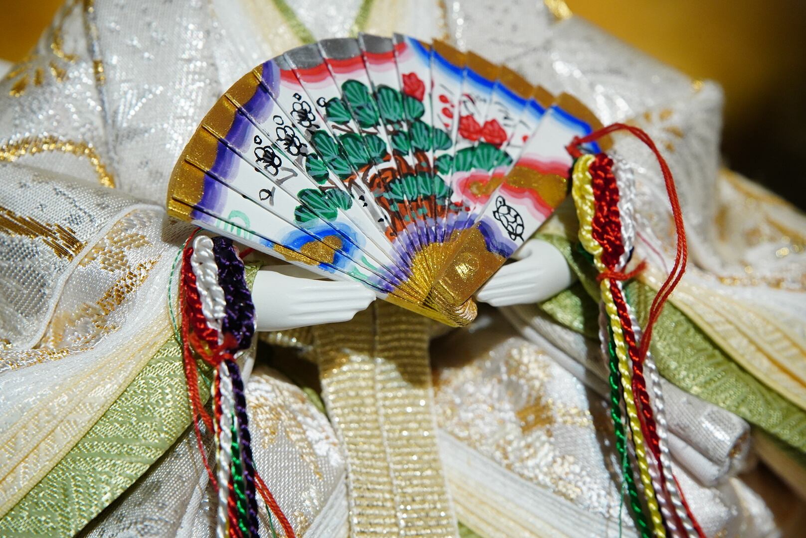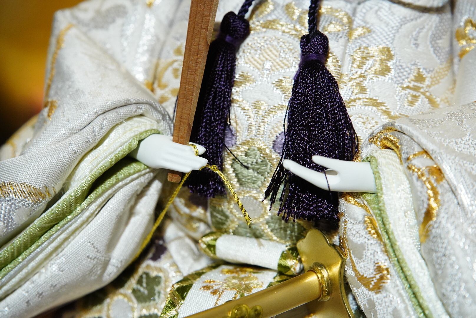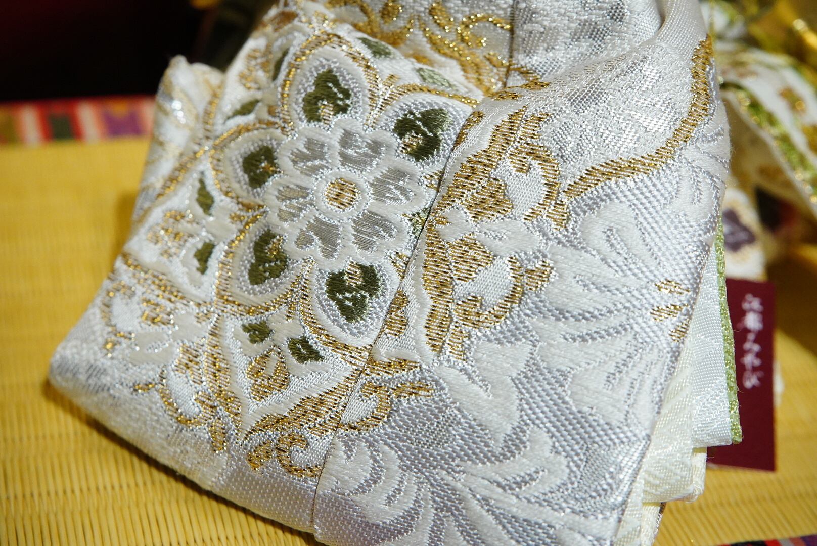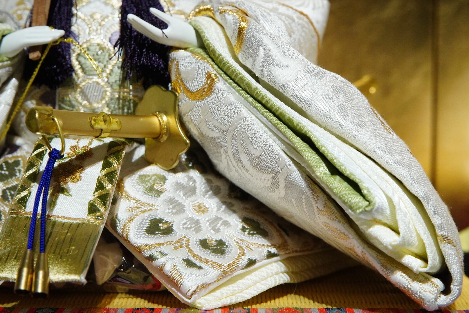 お殿様・お姫様の衣裳には、京都西陣織の帯地を贅沢に使用。細かな紋様と上品な光沢が重なり合い、格別の風格をまとっています。柔らかな色調でまとめられた衣裳は、華やかさの中に落ち着きを感じさせ、優雅な佇まいをより一層引き立てます。