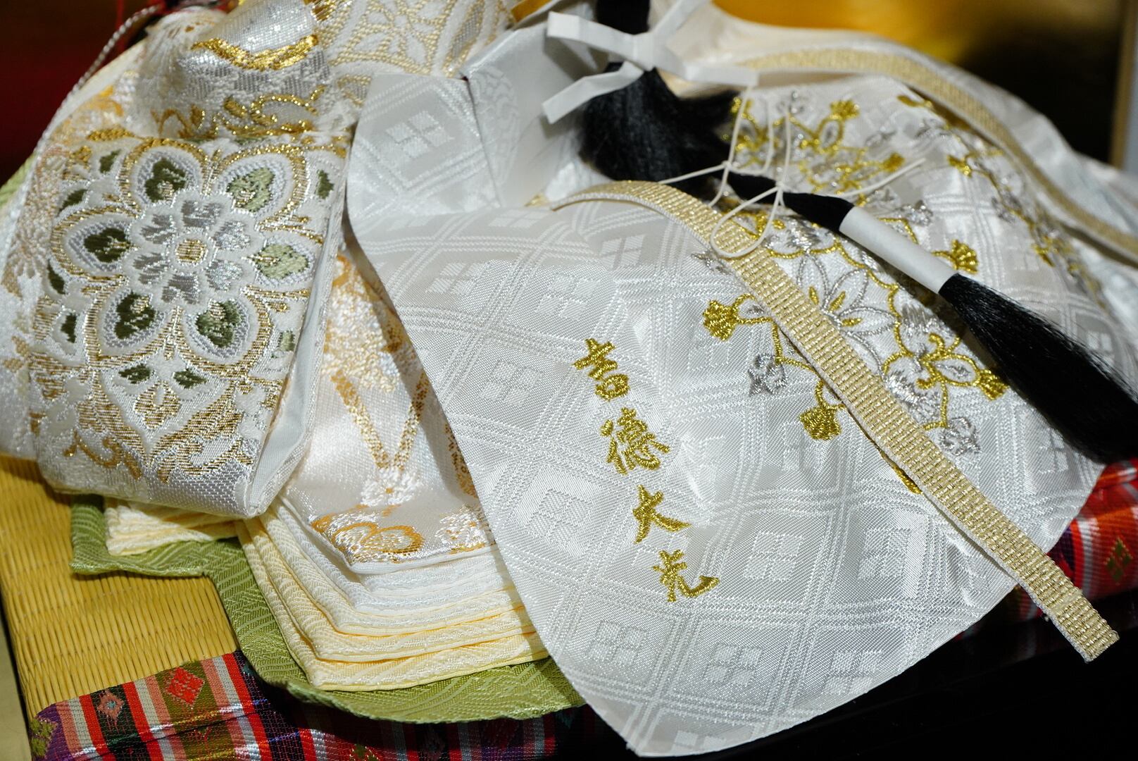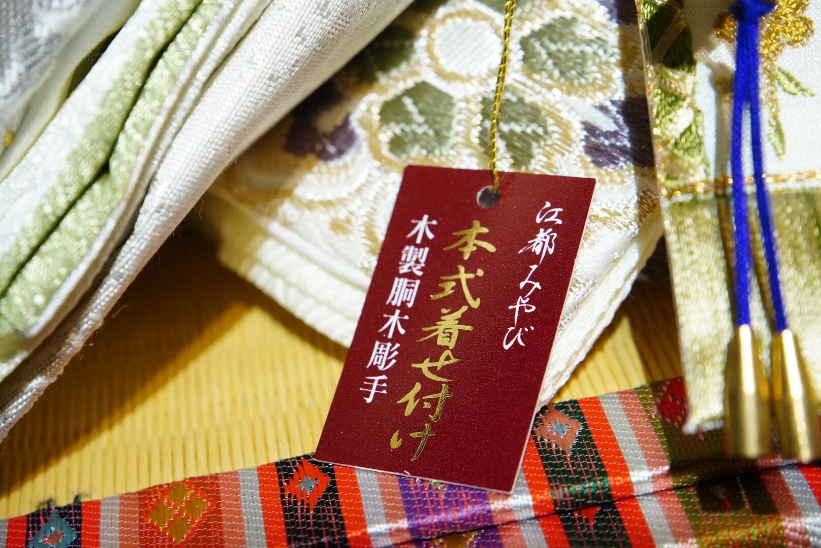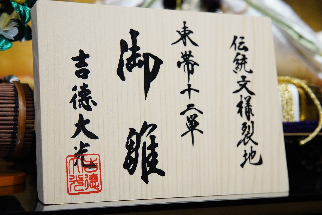 お殿様・お姫様の衣裳には、京都西陣織の帯地を贅沢に使用。細かな紋様と上品な光沢が重なり合い、格別の風格をまとっています。柔らかな色調でまとめられた衣裳は、華やかさの中に落ち着きを感じさせ、優雅な佇まいをより一層引き立てます。