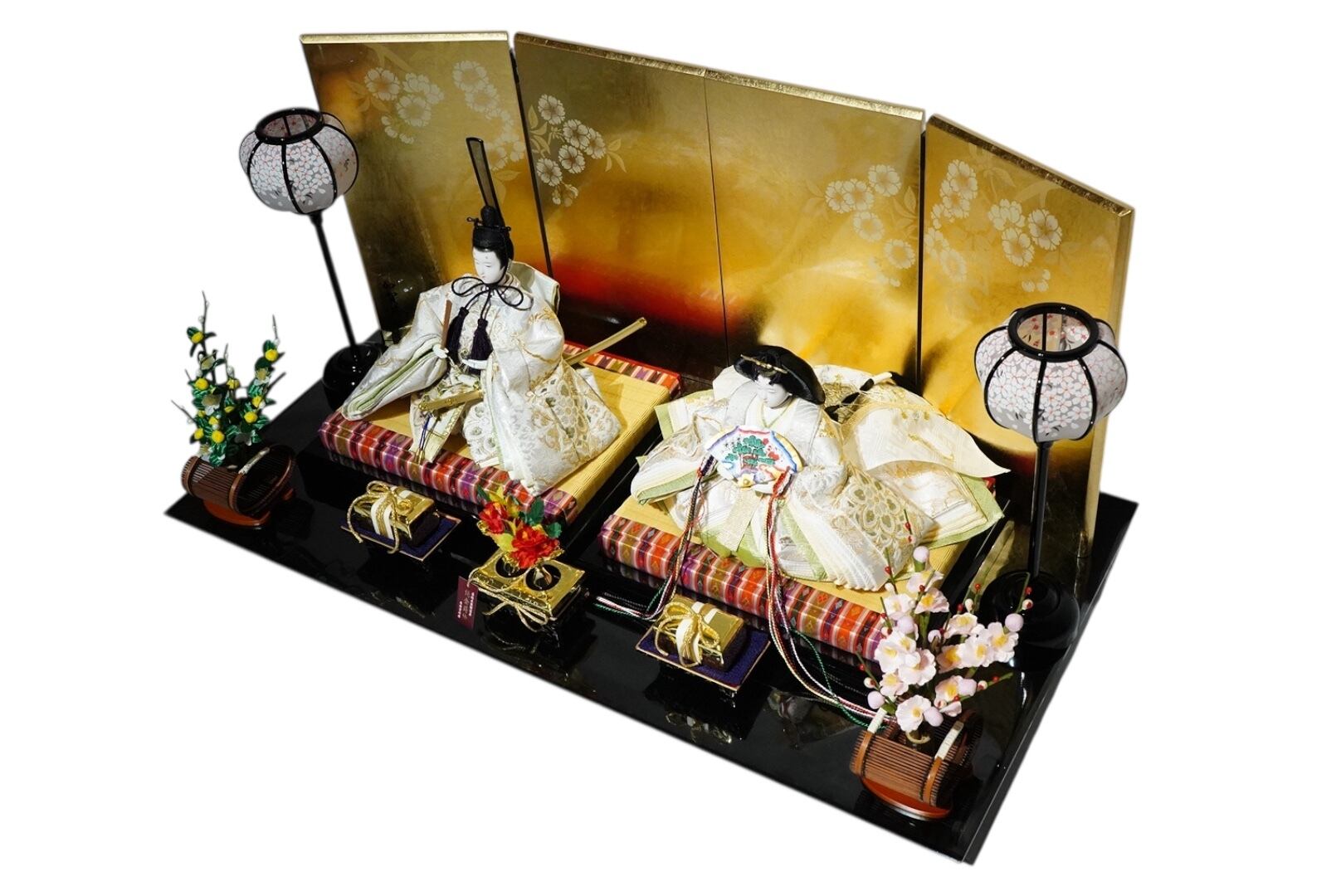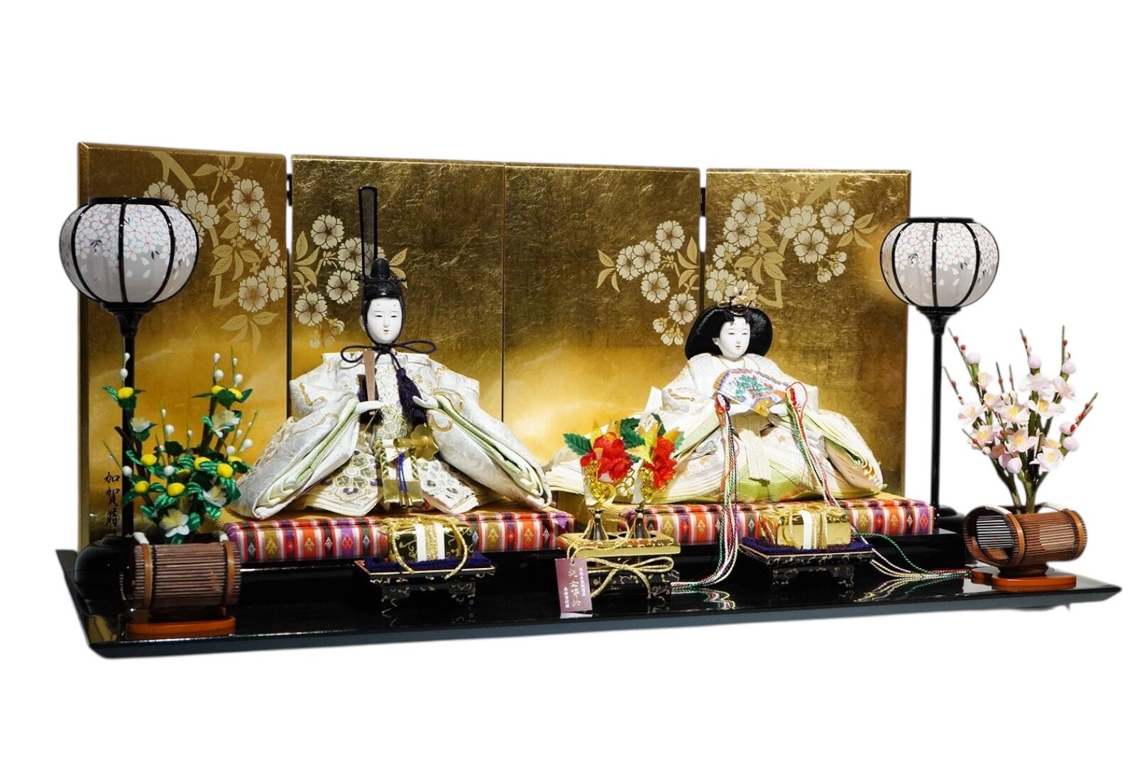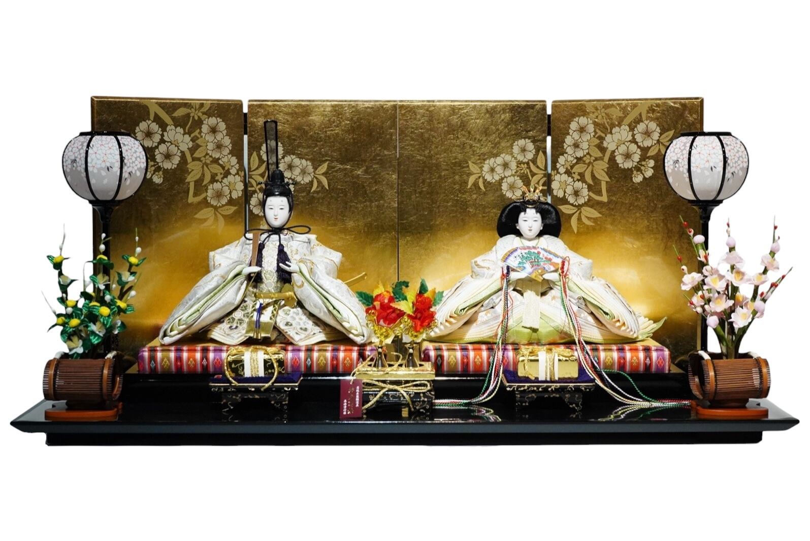 加賀蒔絵の屏風が華やかに輝き、桜文様が浮かび上がる上質な舞台に、木胴木手で仕立てられた気品あふれる親王が並ぶ豪華なひな飾りです。