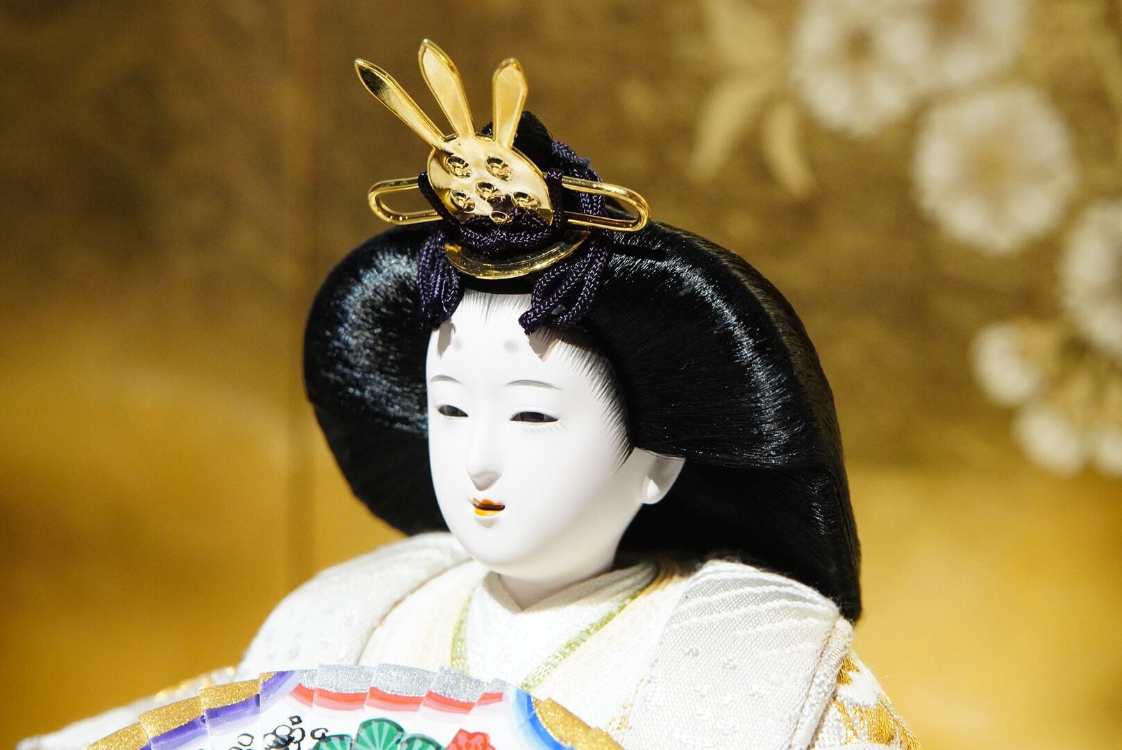 お道具には本漆仕様の純金蒔絵を施し、伝統技が息づく輝きが全体を格調高くまとめ上げています。左右の雪洞や花飾りも、上品な彩りでお人形の存在感を引き立てる美しいアクセントとなっています。