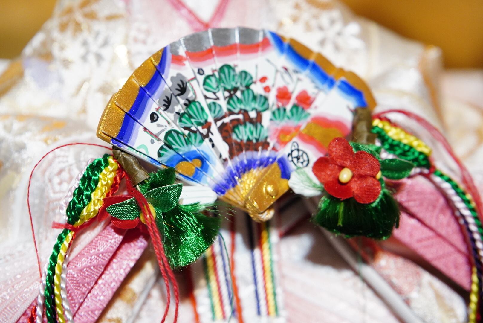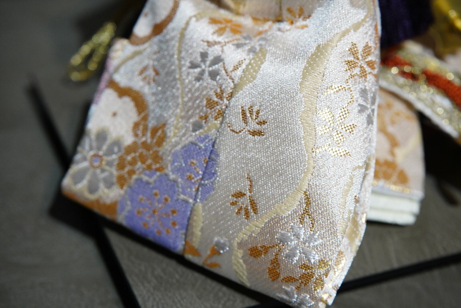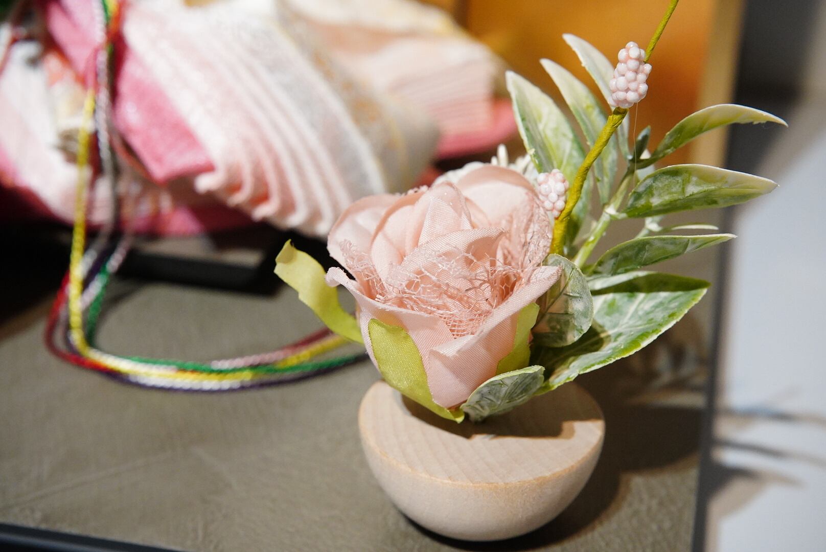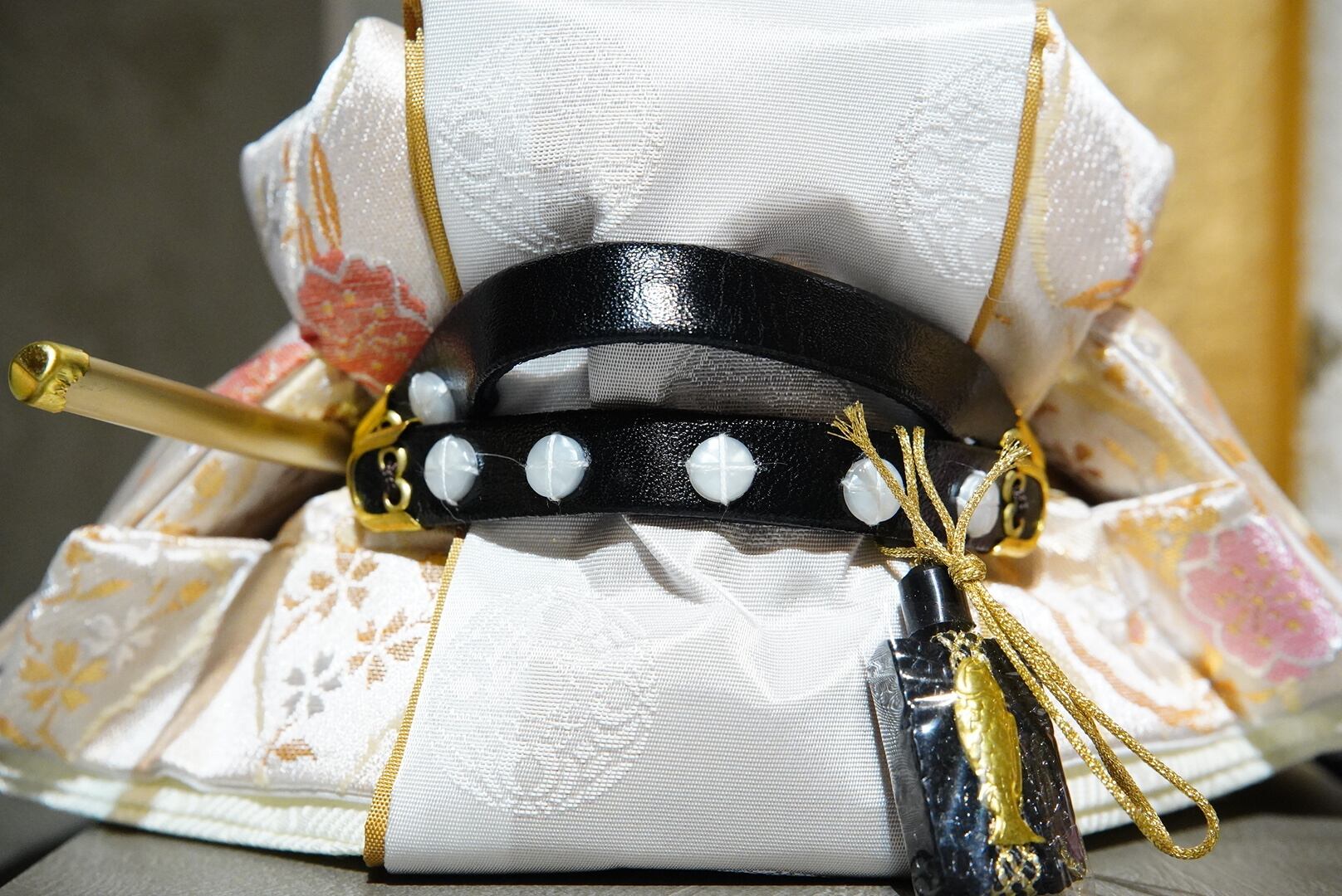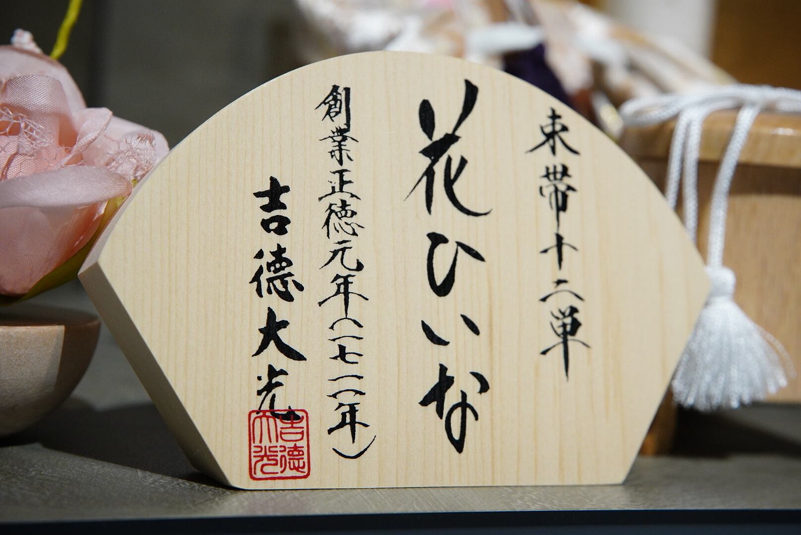 お殿様は淡い金襴の衣裳で端正な雰囲気に、お姫様は美しい多色の衣裳で華やぎをまといながらも気品ある表情が印象的です。両脇にあしらわれた桃の花飾りが彩りを添え、飾り台全体を可憐にまとめています。