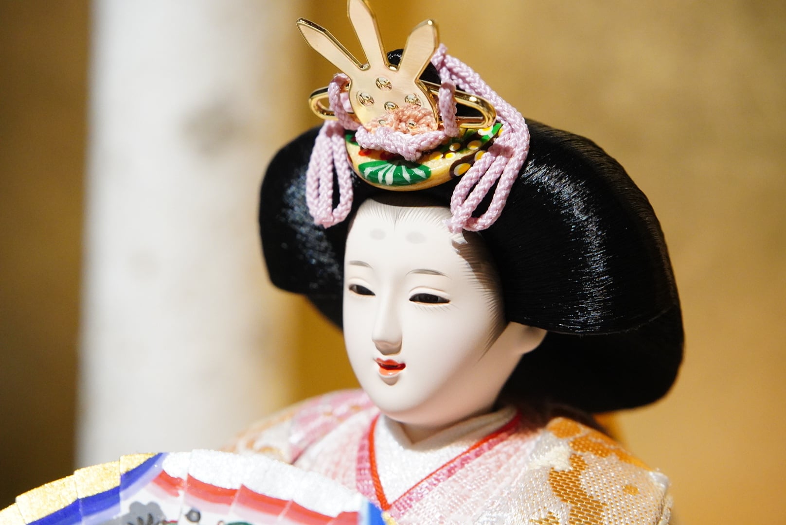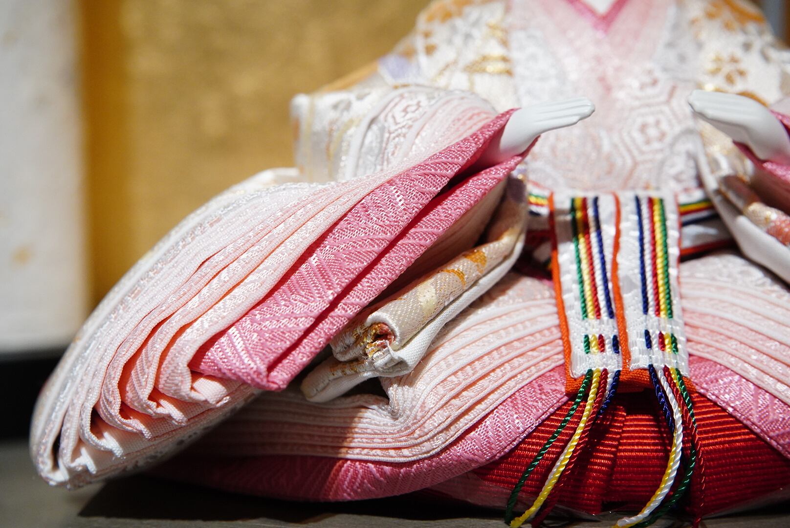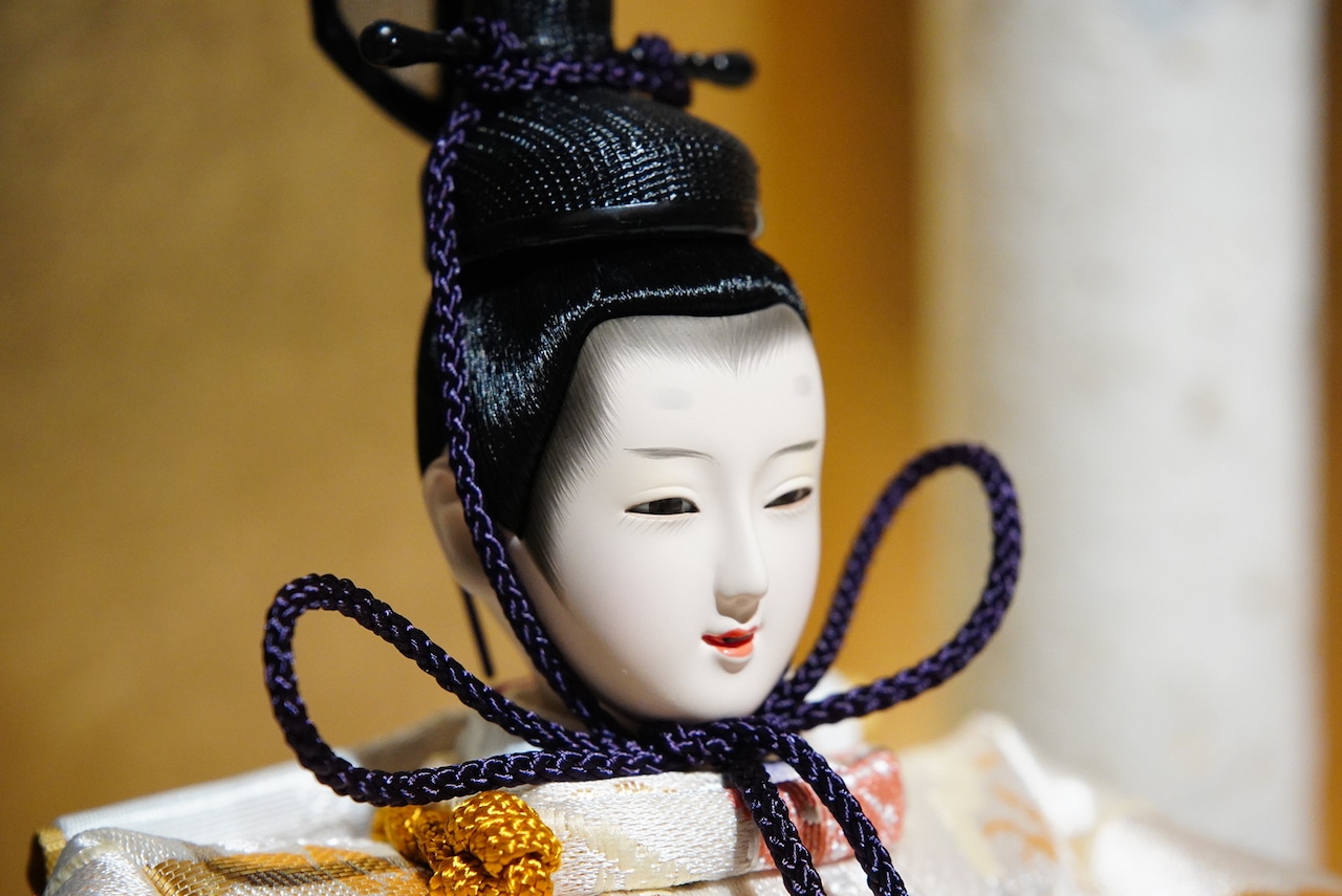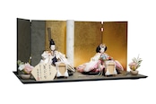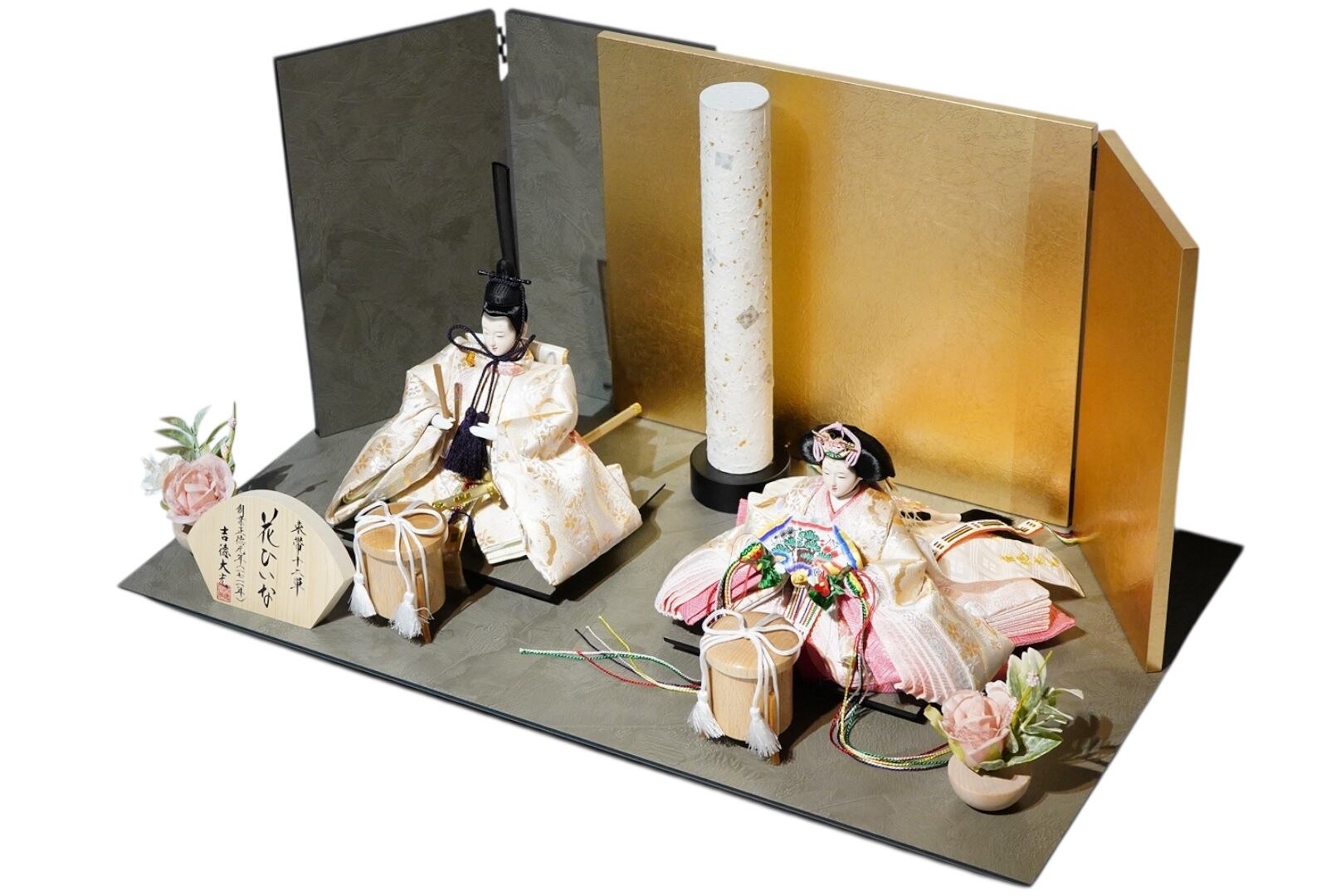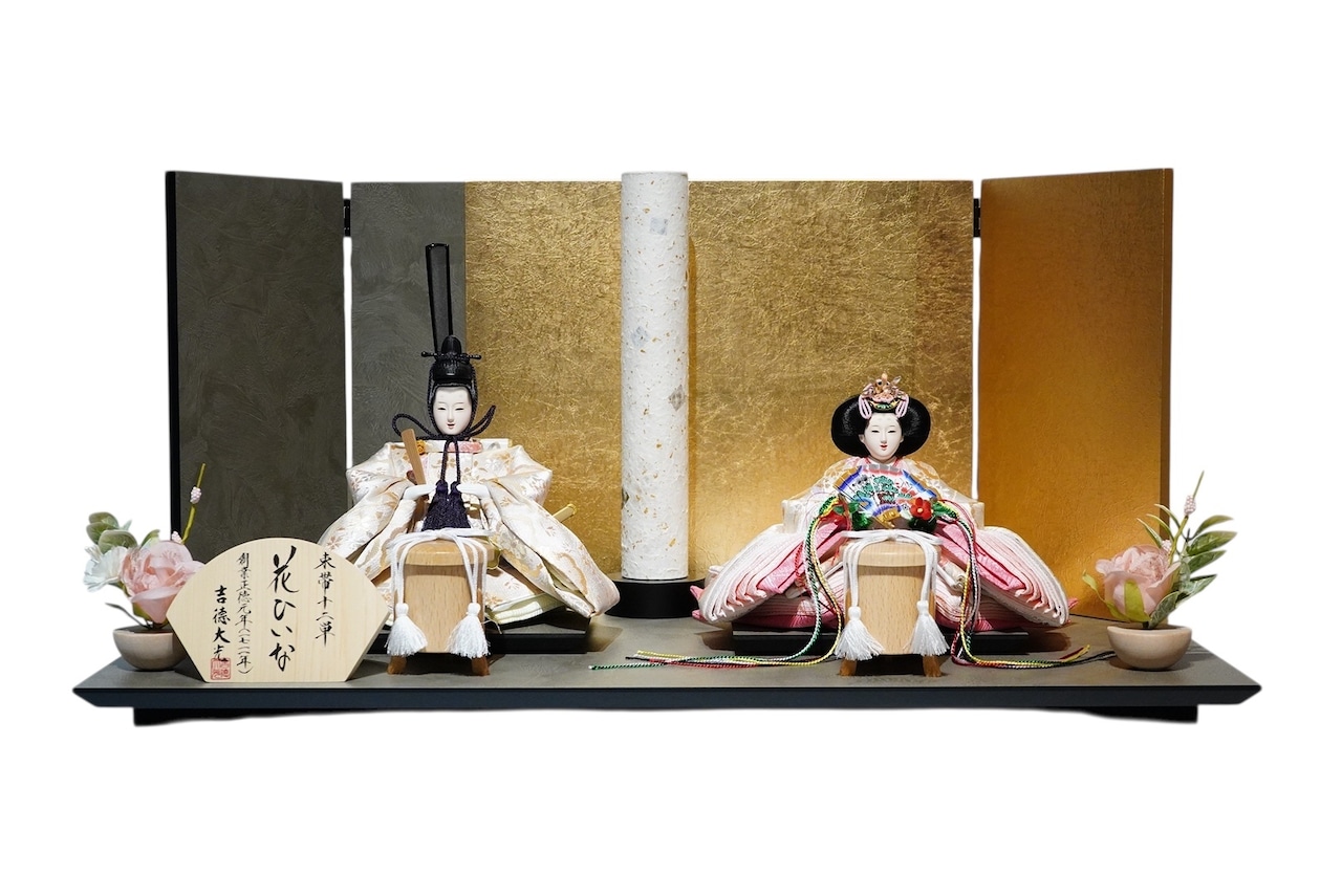 背景には金と落ち着いた色味の切り返しを合わせた屏風を用い、華やかさの中にも静かな品格を感じる佇まいに仕上げています。中央に配した白色の灯りが、奥行きを生むように優しくふたりを照らし、春の節句にふさわしい温かみを添えます。