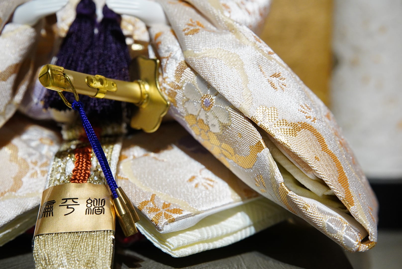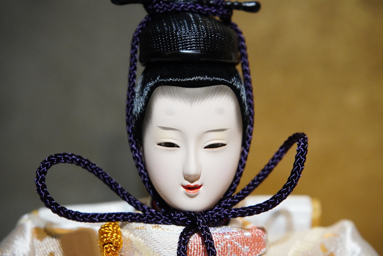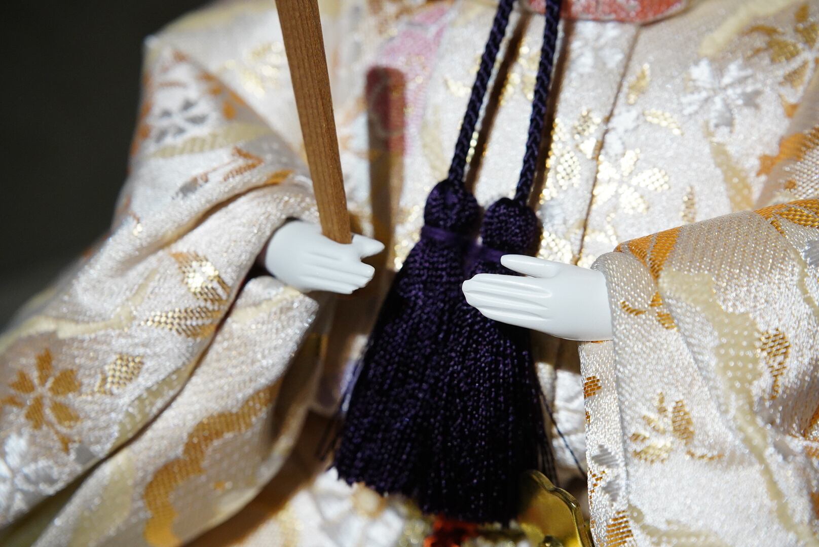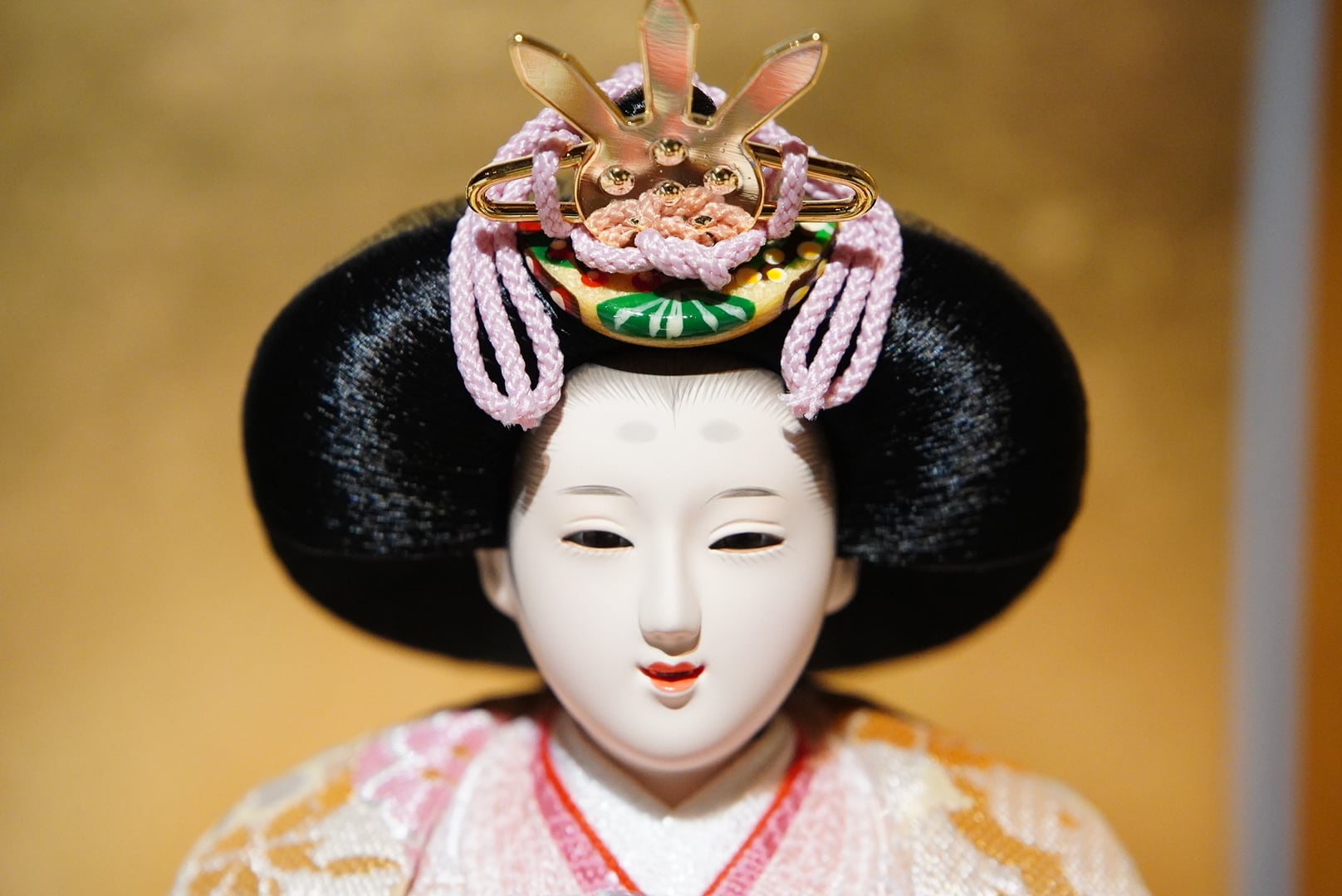 背景には金と落ち着いた色味の切り返しを合わせた屏風を用い、華やかさの中にも静かな品格を感じる佇まいに仕上げています。中央に配した白色の灯りが、奥行きを生むように優しくふたりを照らし、春の節句にふさわしい温かみを添えます。
