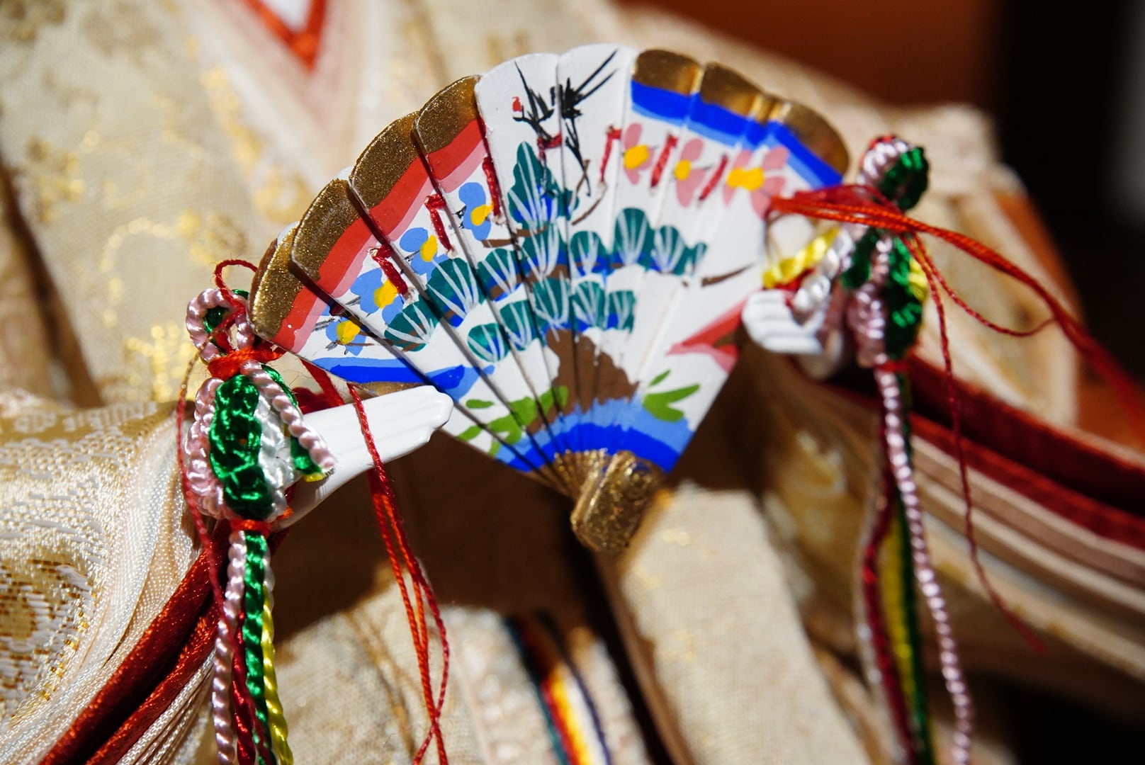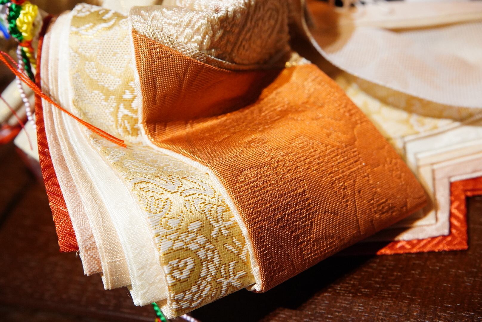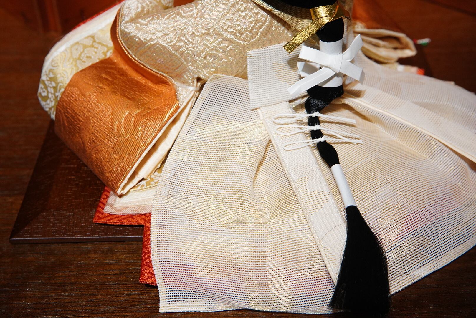 殿姫の衣装には、正絹ゴブラン織による切ばめ仕立てを採用。織りならではの立体感と上質な艶が、落ち着きの中にも確かな格の高さを感じさせます。穏やかで端正な表情が、品格ある空間を演出します。