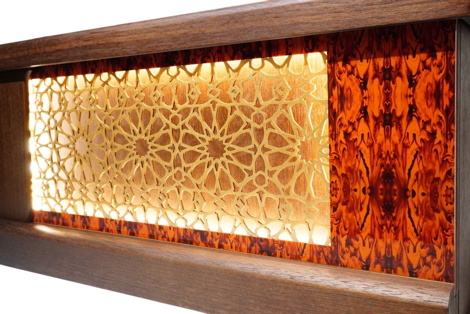 台座正面には、花文様をあしらった意匠板を配し、内部に組み込まれたLED照明が柔らかく灯ります。光に浮かび上がる花模様が奥行きを生み、右側と下部に施されたべっこう調の仕上げが、重厚で格調高いアクセントに。