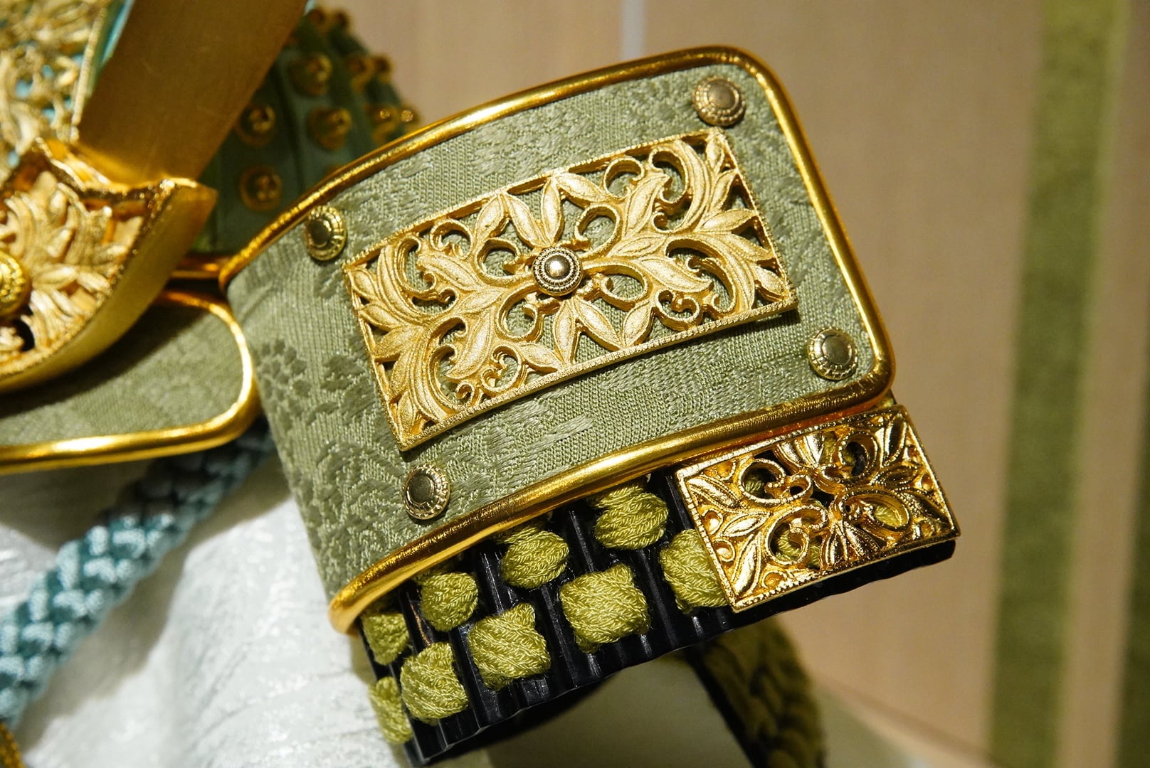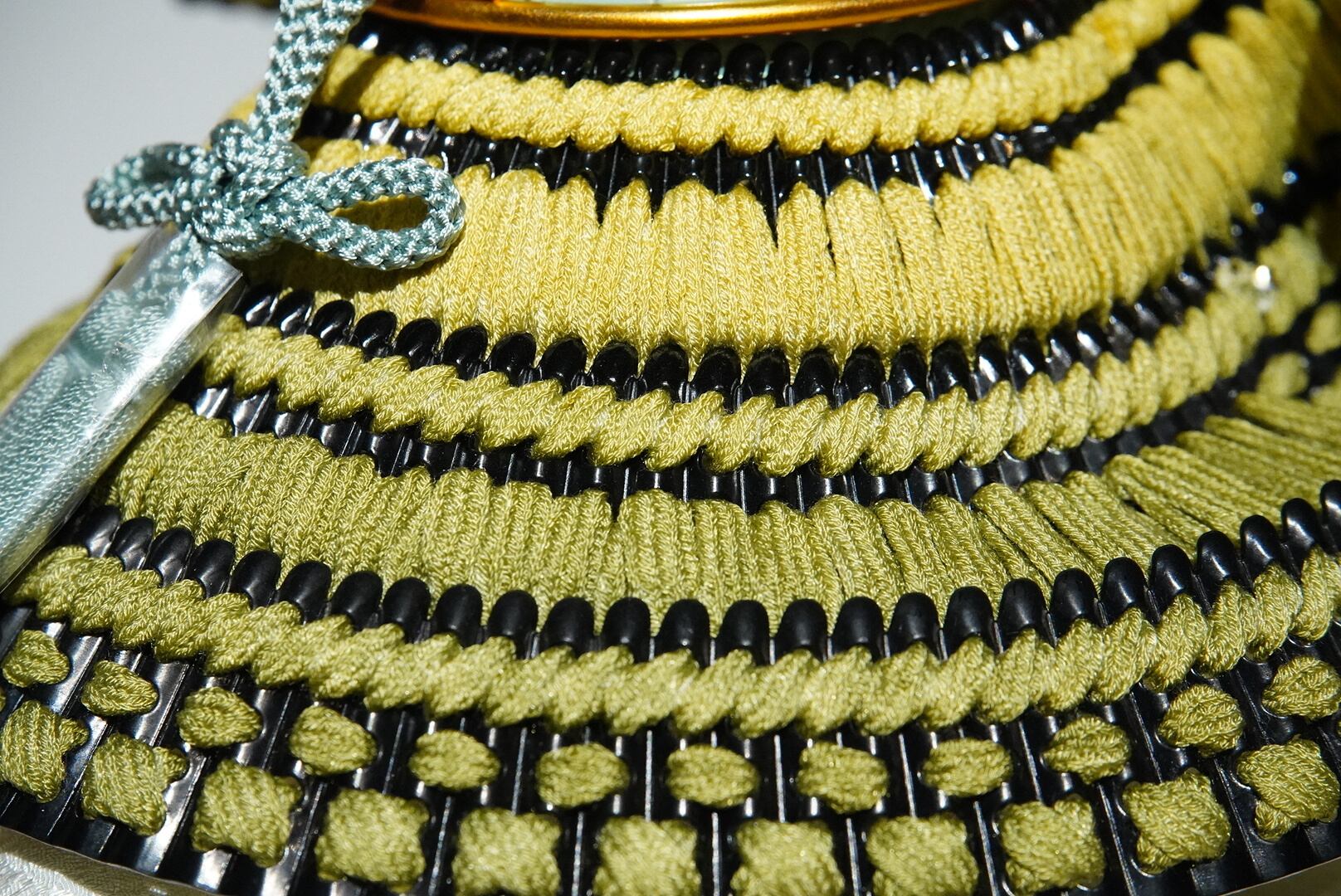 兜の縅(おどし)には、草木染によって丁寧に染め上げられた糸を使用。人工的な色味では表現できない、穏やかで深みのある色合いが、兜全体にやさしい品格をもたらします。時を経ても飽きのこない、自然素材ならではの表情が魅力です。