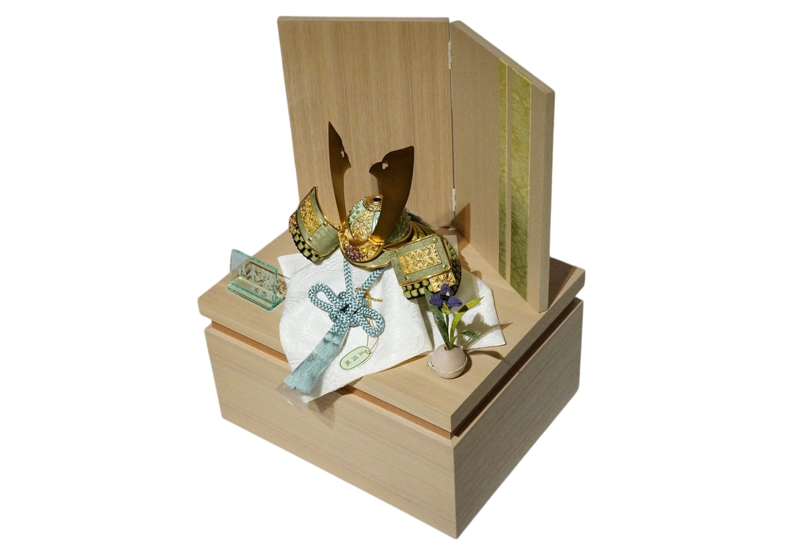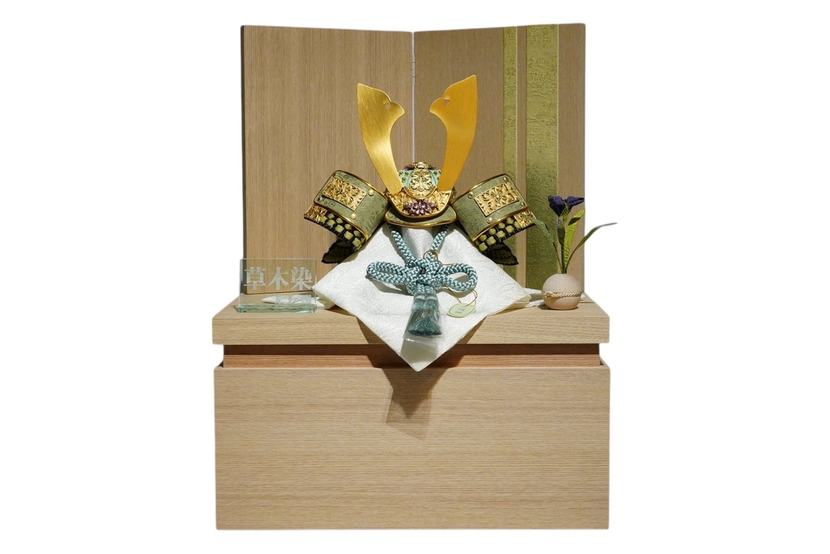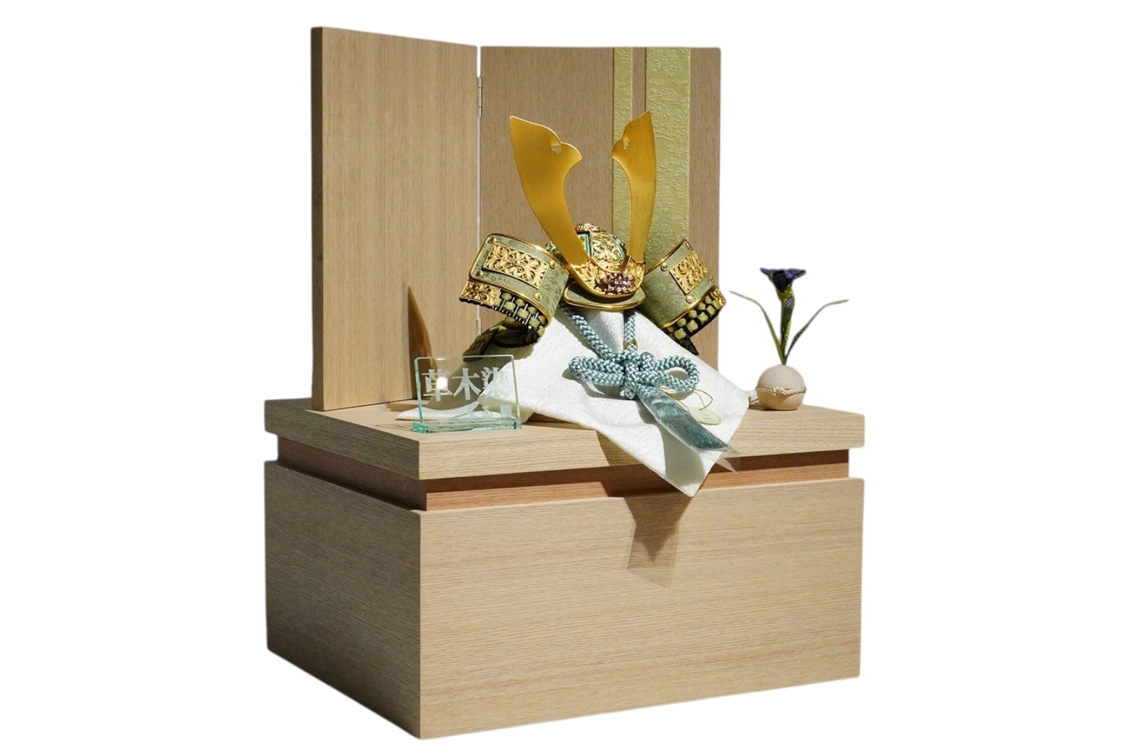 木目の美しい収納箱と、すっきりとした屏風が兜を包み込み、現代の住空間にも違和感なく馴染む設えに。飾るときの美しさと、収納時の実用性を兼ね備えた、洗練された兜飾りです。