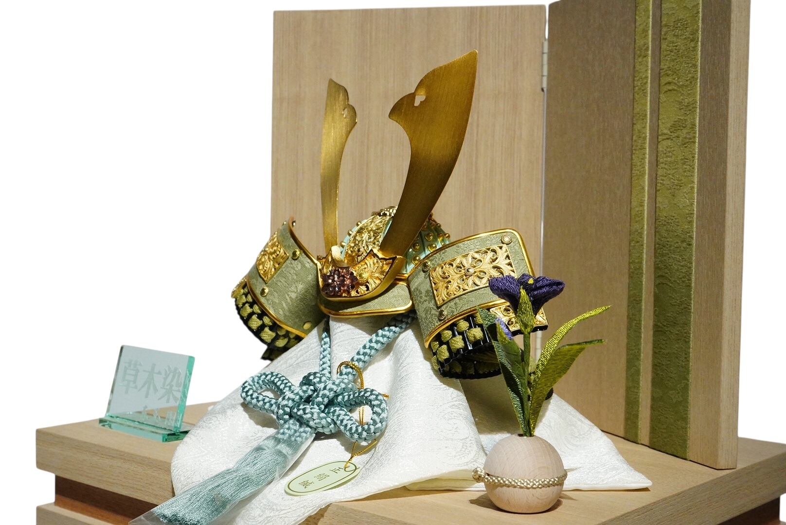 穏やかな美しさが印象的な東玉の御兜収納飾り。