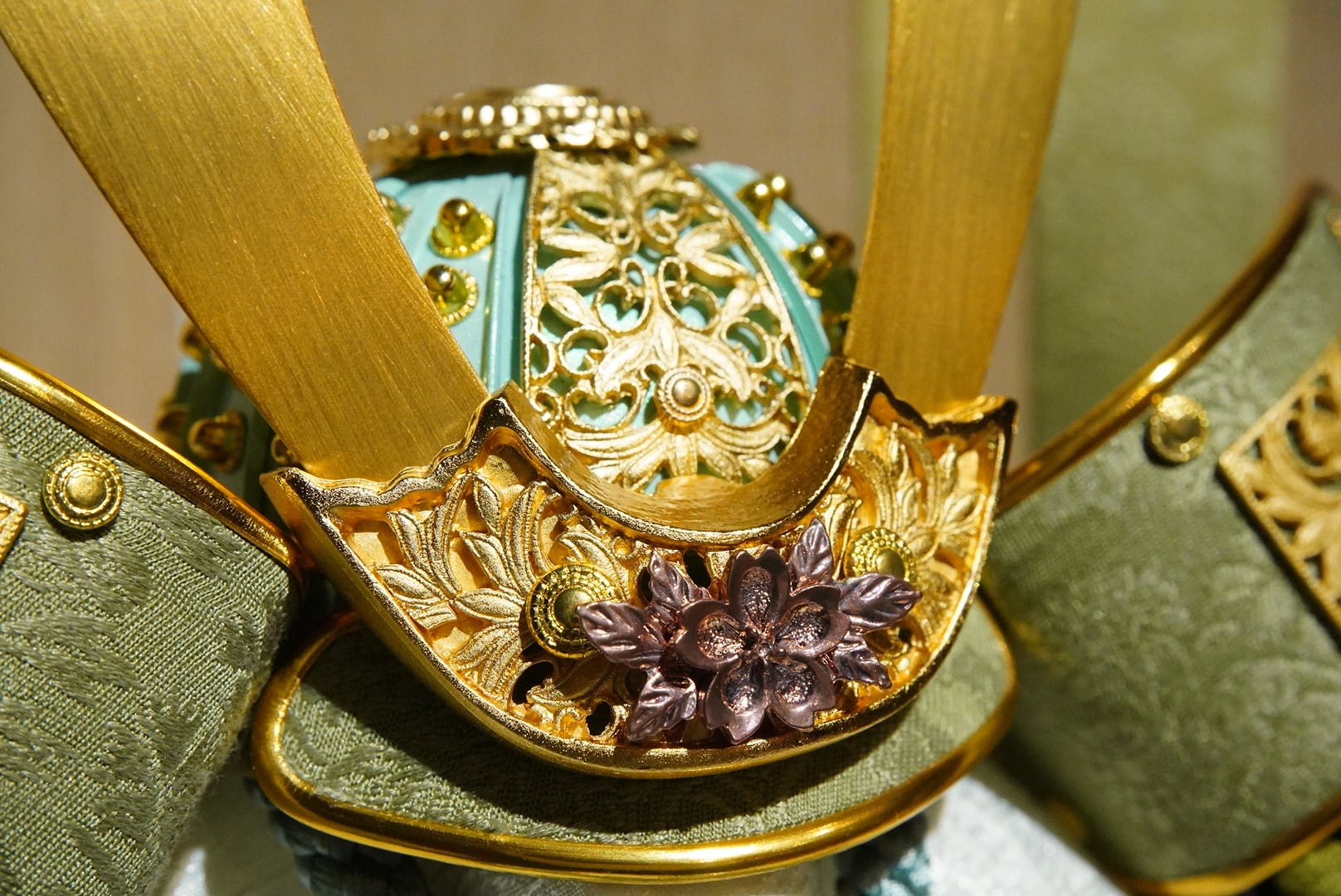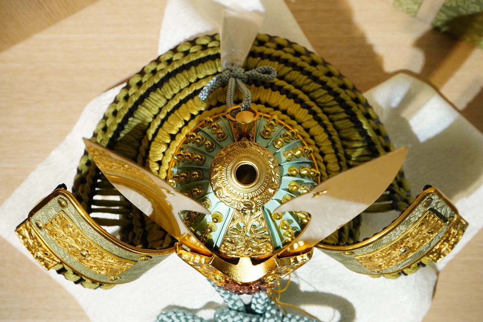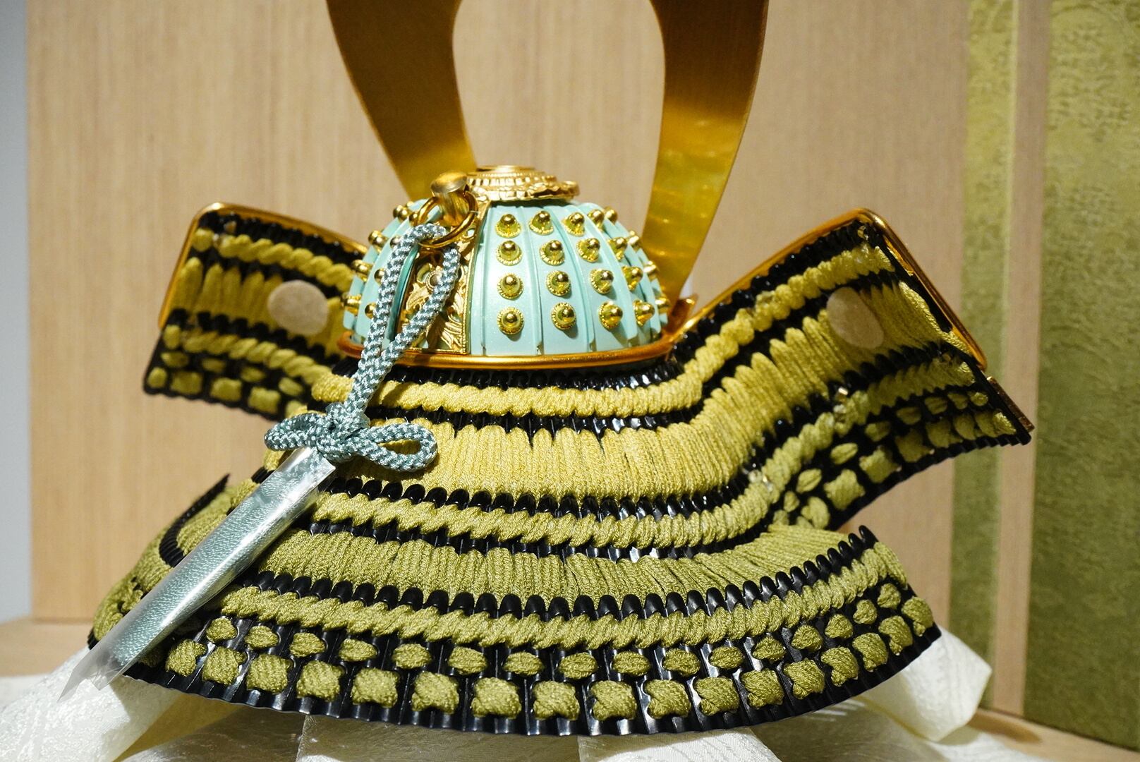 鍬形の穏やかな金色の輝きと、落ち着いた金具の装飾が調和し、華やかさを抑えた上質な存在感を演出。淡い色味の袱紗や組紐が、兜の表情をさらに引き立てています。