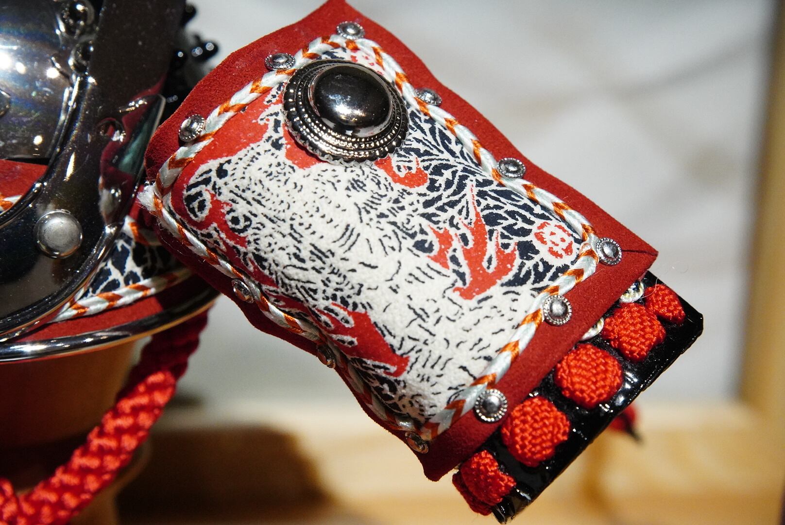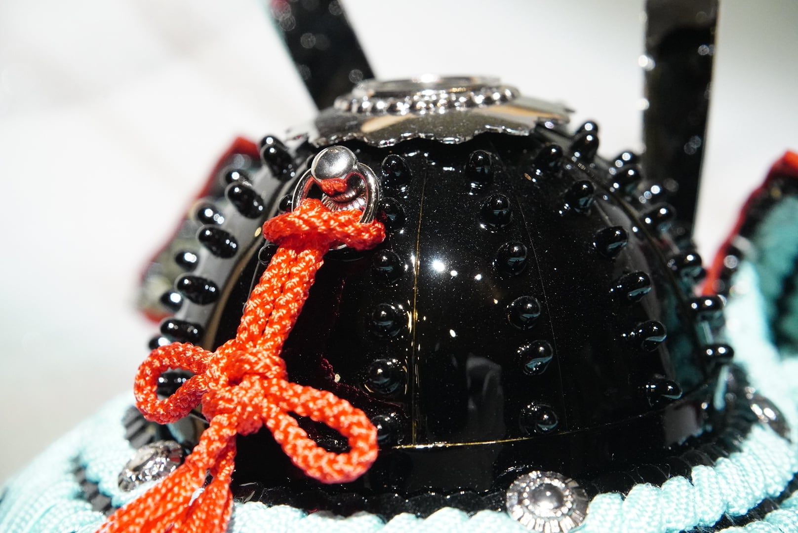 縅(おどし)には正絹を使用し、しなやかで艶やかな糸が兜を端正に引き締め、赤の色調が凛とした存在感を演出。力強さの中にも品格を備えた佇まいが印象的です。