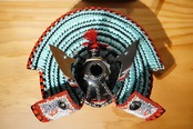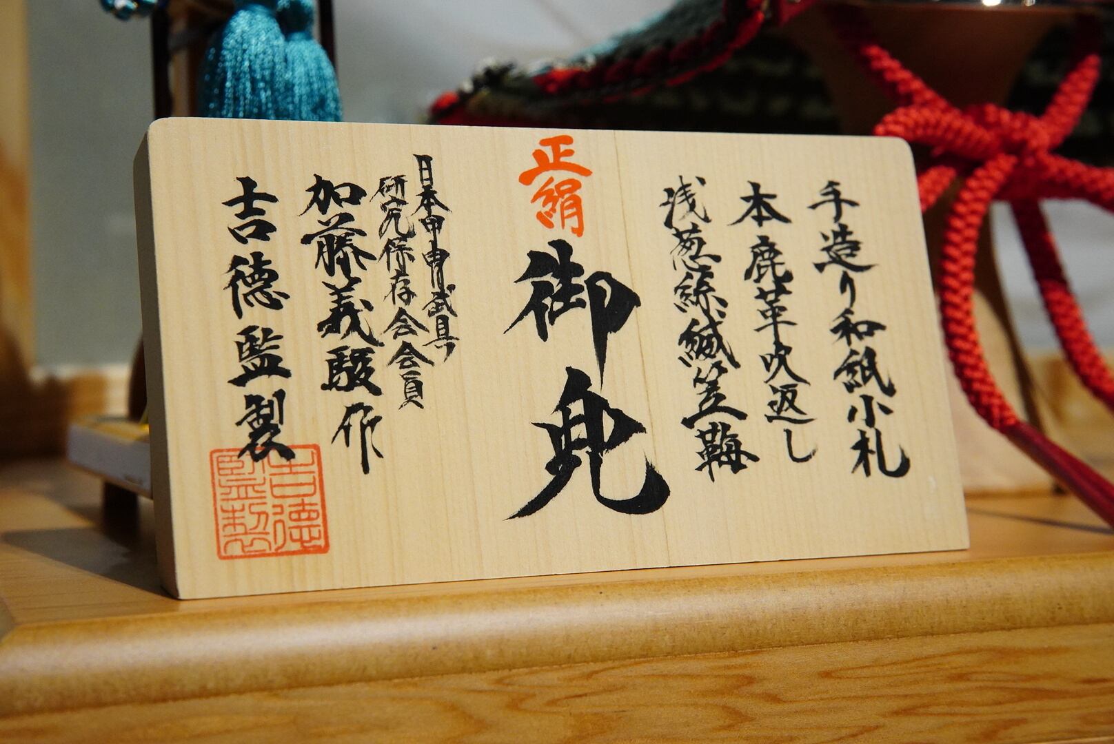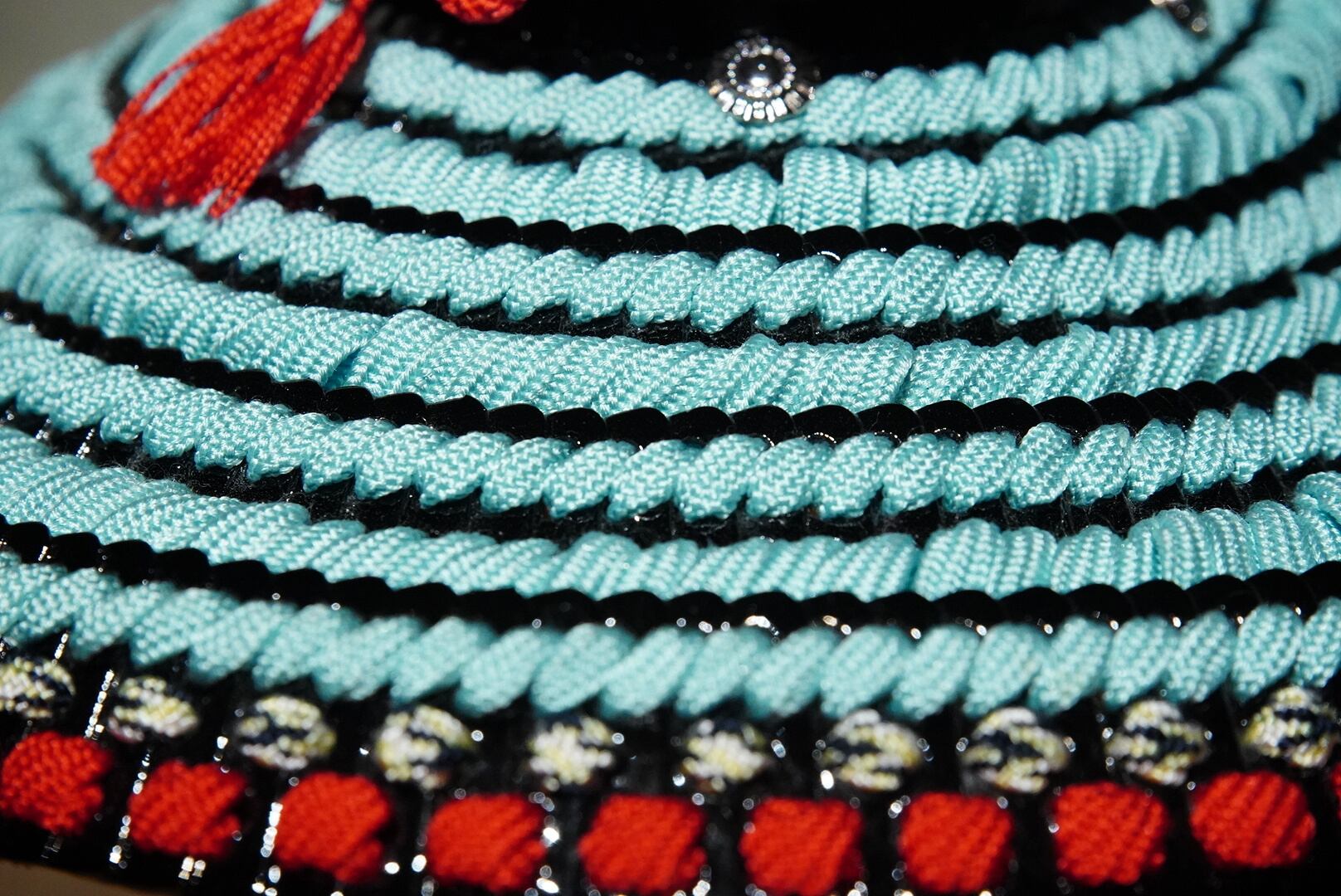 兜の小札には、職人の手仕事が息づく手造り和紙小札を使用。和紙ならではの柔らかな質感と繊細な表情が、兜全体に温もりと奥行きを与えています。吹き返しには本鹿革を用い、自然素材特有の深みのある風合いと、確かな重厚感を感じさせます。