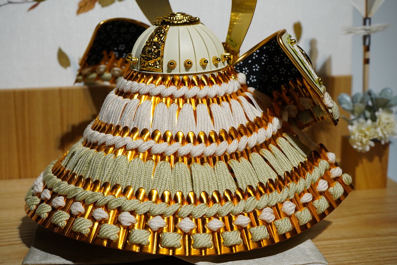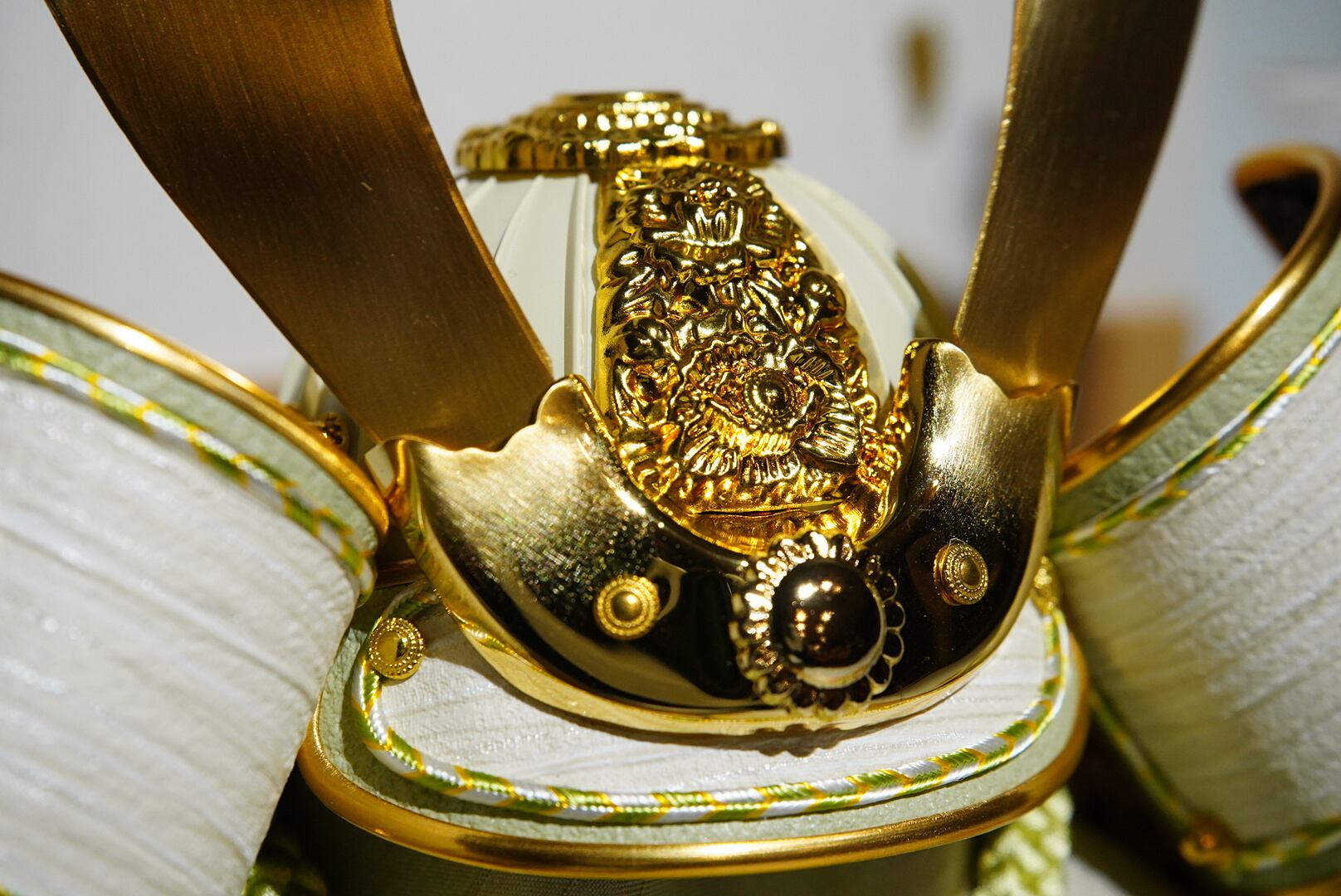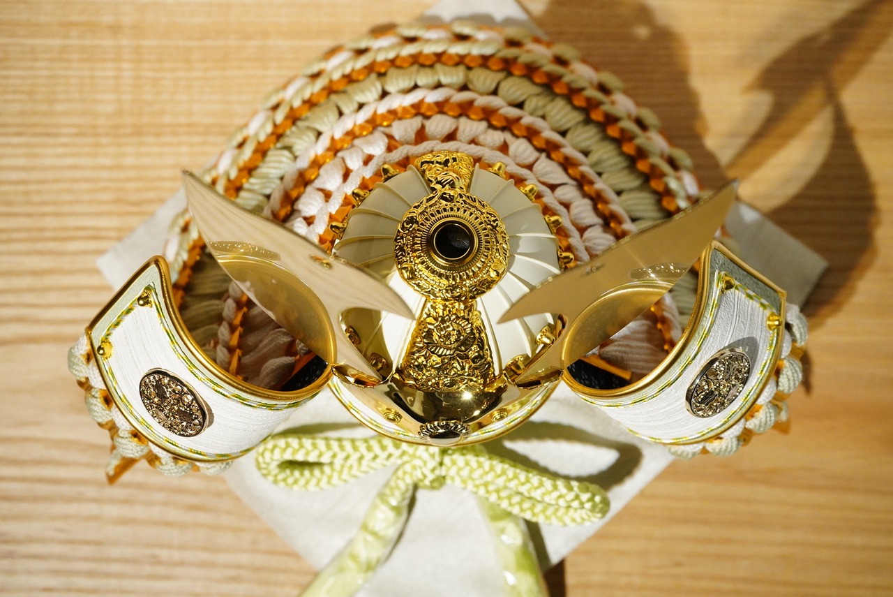 鍬形には穏やかな金色の輝きを施し、柔らかな光を受けて上品な存在感を放ちます。小札や金具は淡い色味でまとめられ、白を基調とした兜に自然に溶け込みながら、繊細な装飾がさりげなく高級感を演出しています。淡い若草色の組紐が、全体に清々しさと品の良いアクセントを添えています。