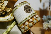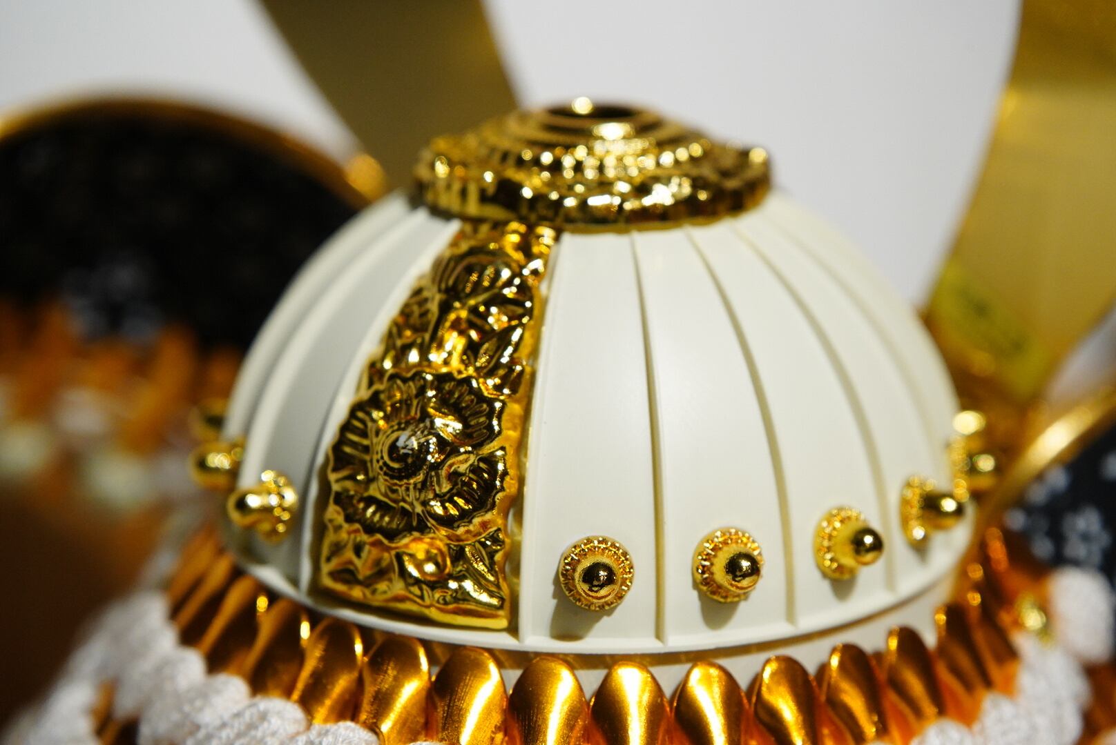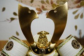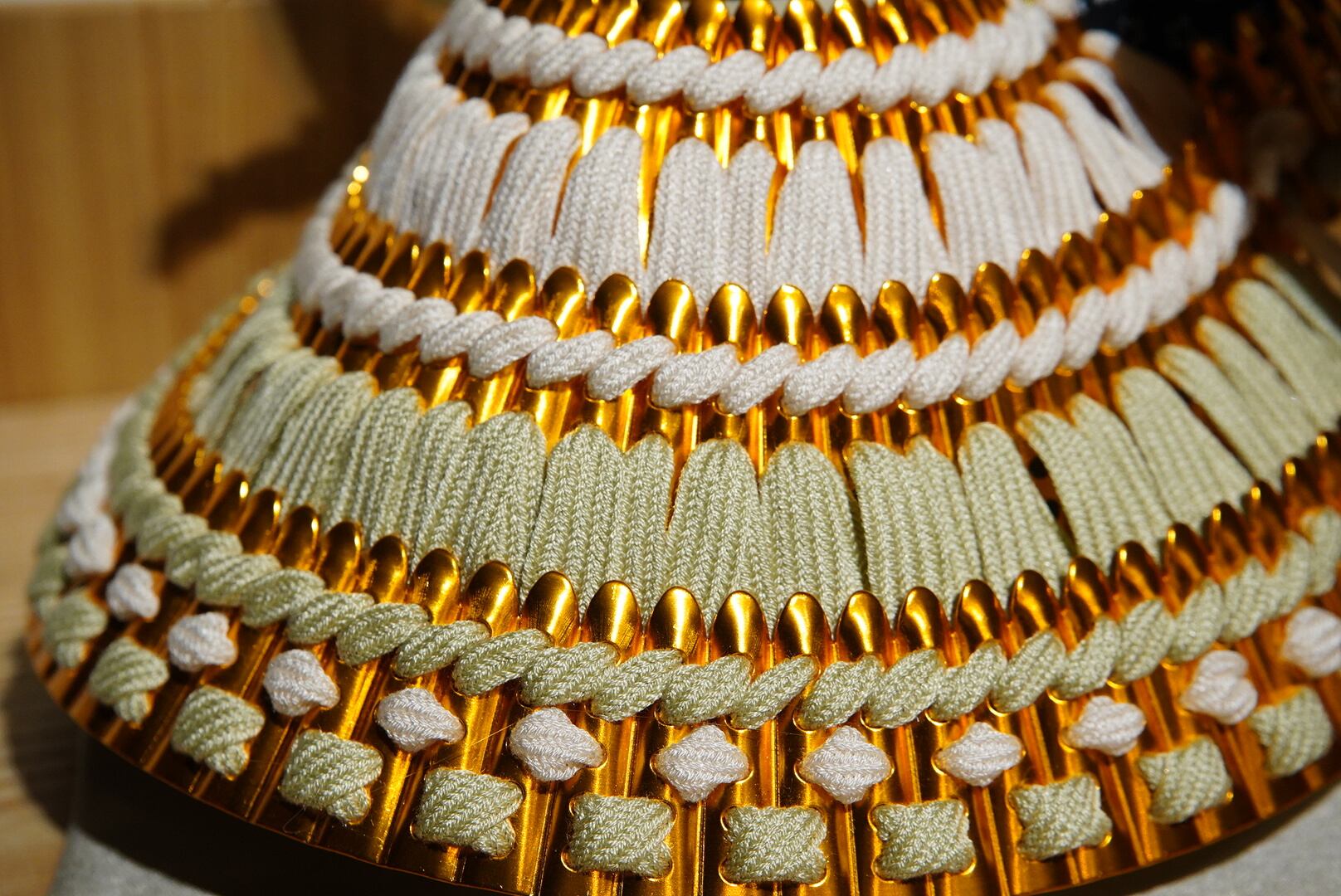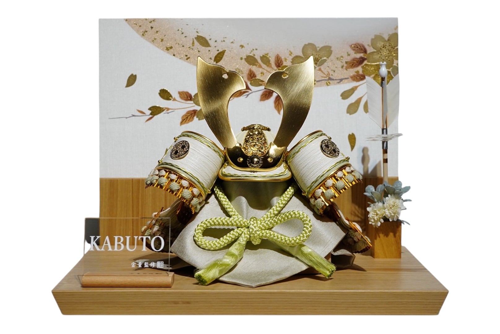 鍬形には穏やかな金色の輝きを施し、柔らかな光を受けて上品な存在感を放ちます。小札や金具は淡い色味でまとめられ、白を基調とした兜に自然に溶け込みながら、繊細な装飾がさりげなく高級感を演出しています。淡い若草色の組紐が、全体に清々しさと品の良いアクセントを添えています。
