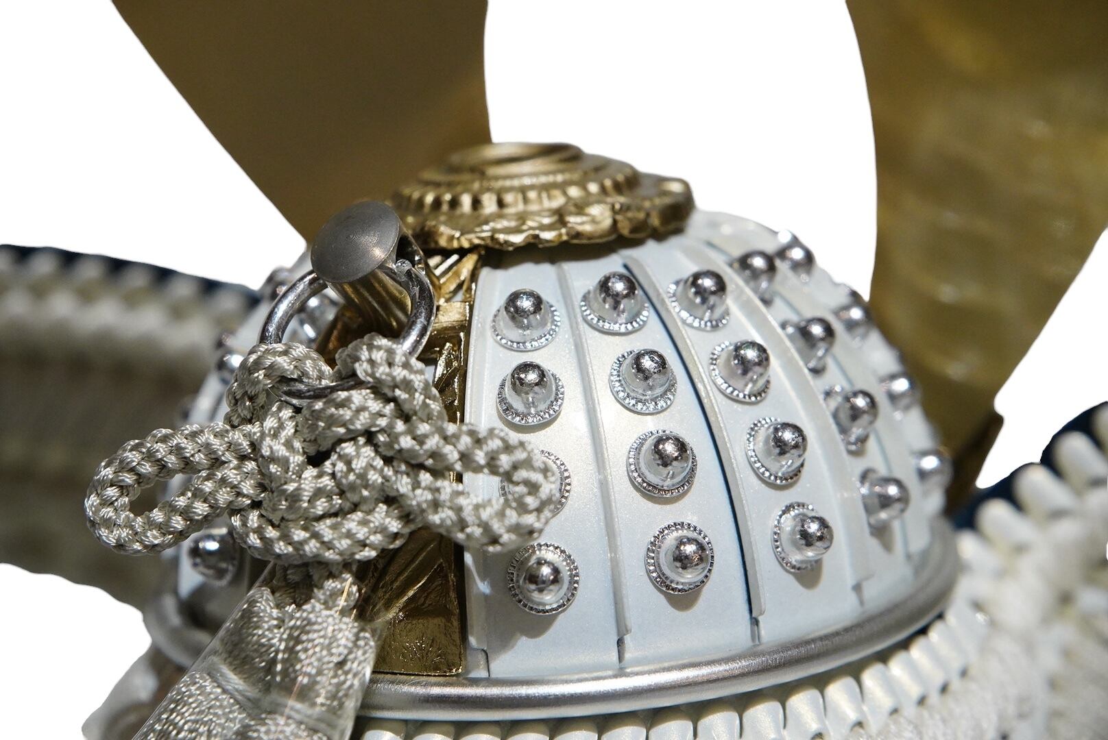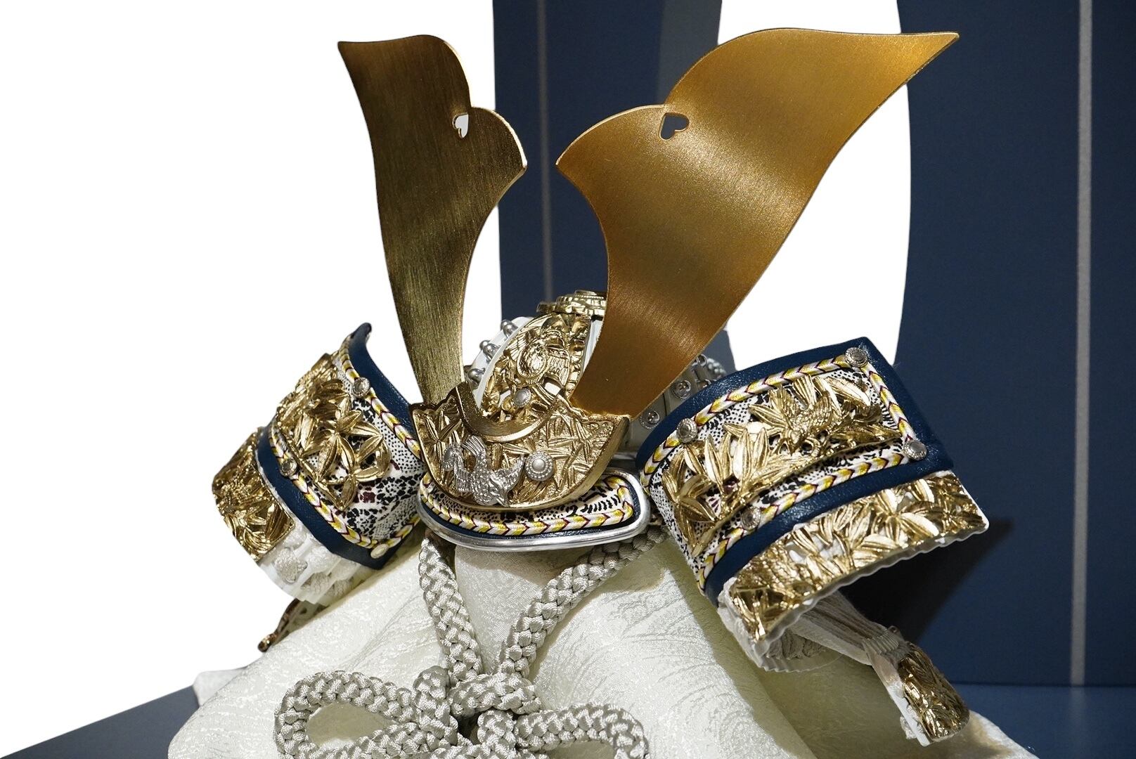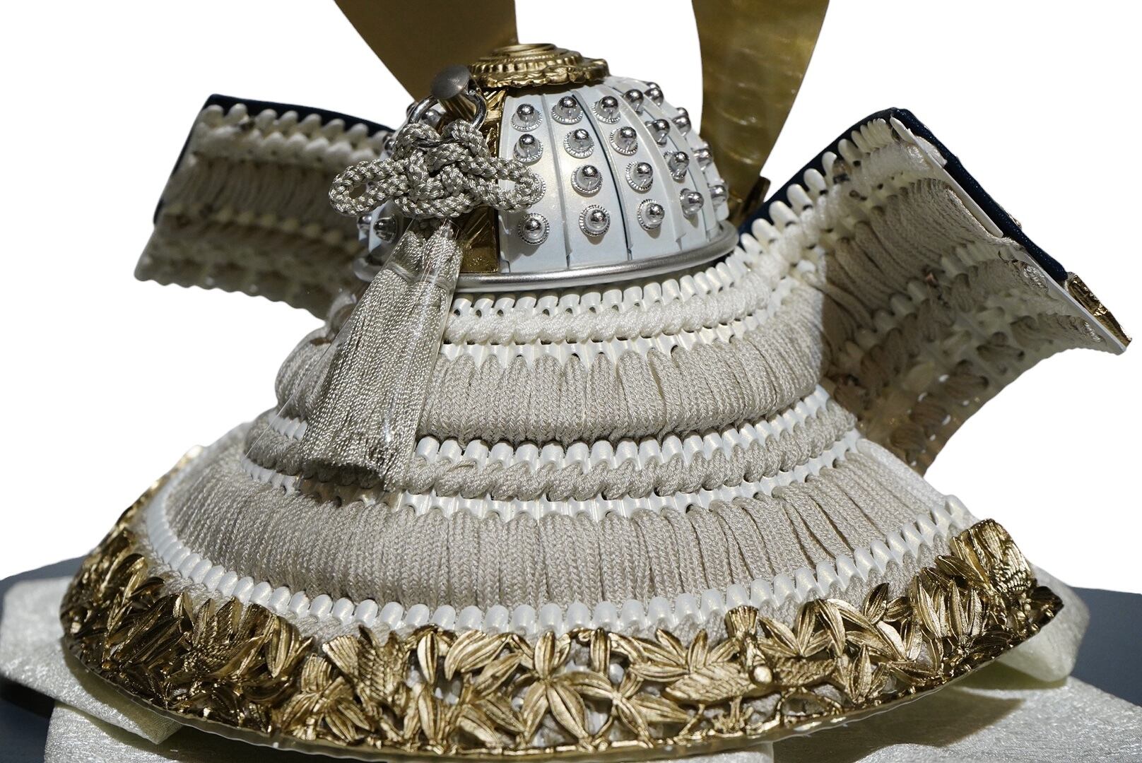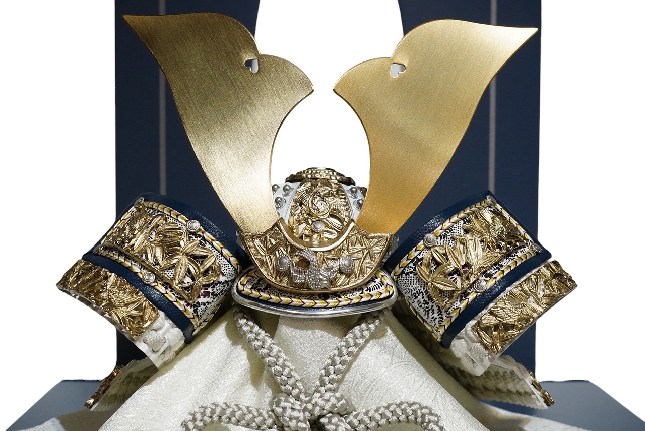 やわらかな金色に仕上げられた鍬形は、主張しすぎることなく上品な輝きを湛え、兜全体に落ち着きと格調をもたらします。