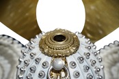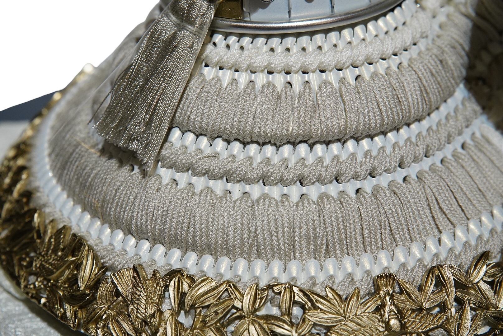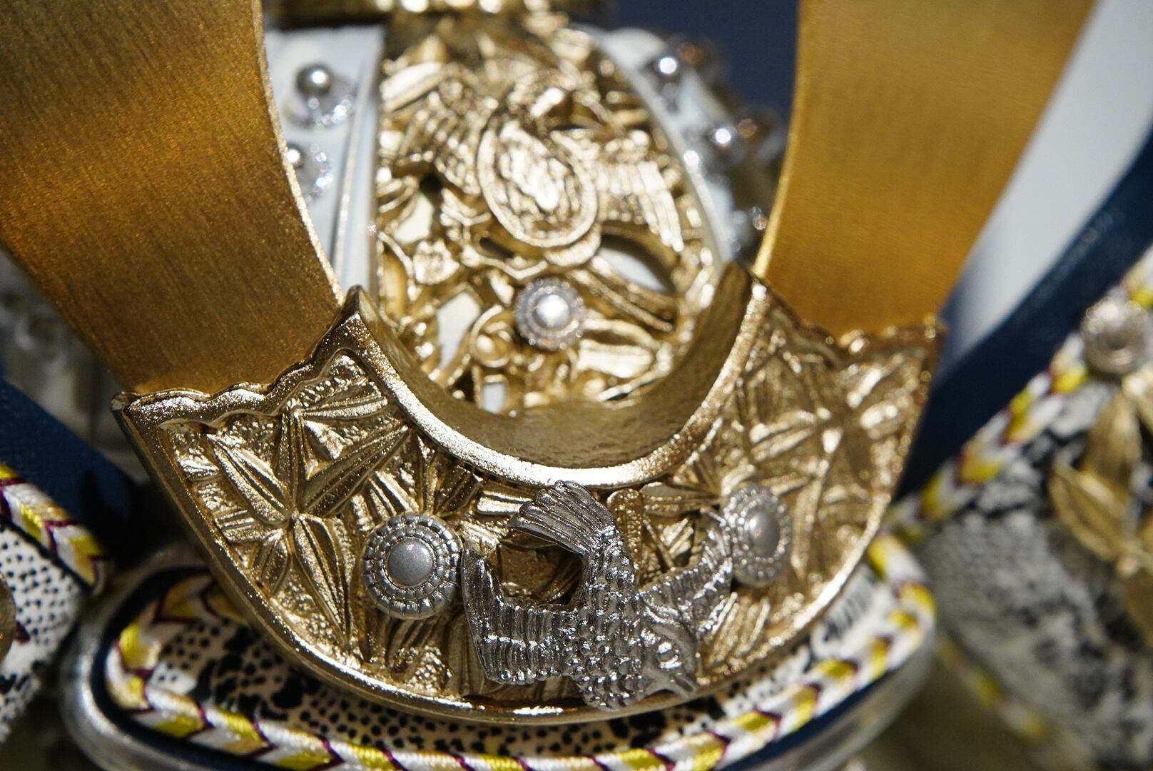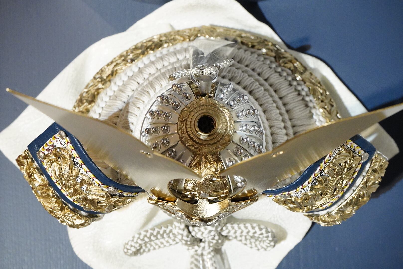 やわらかな金色に仕上げられた鍬形は、主張しすぎることなく上品な輝きを湛え、兜全体に落ち着きと格調をもたらします。
