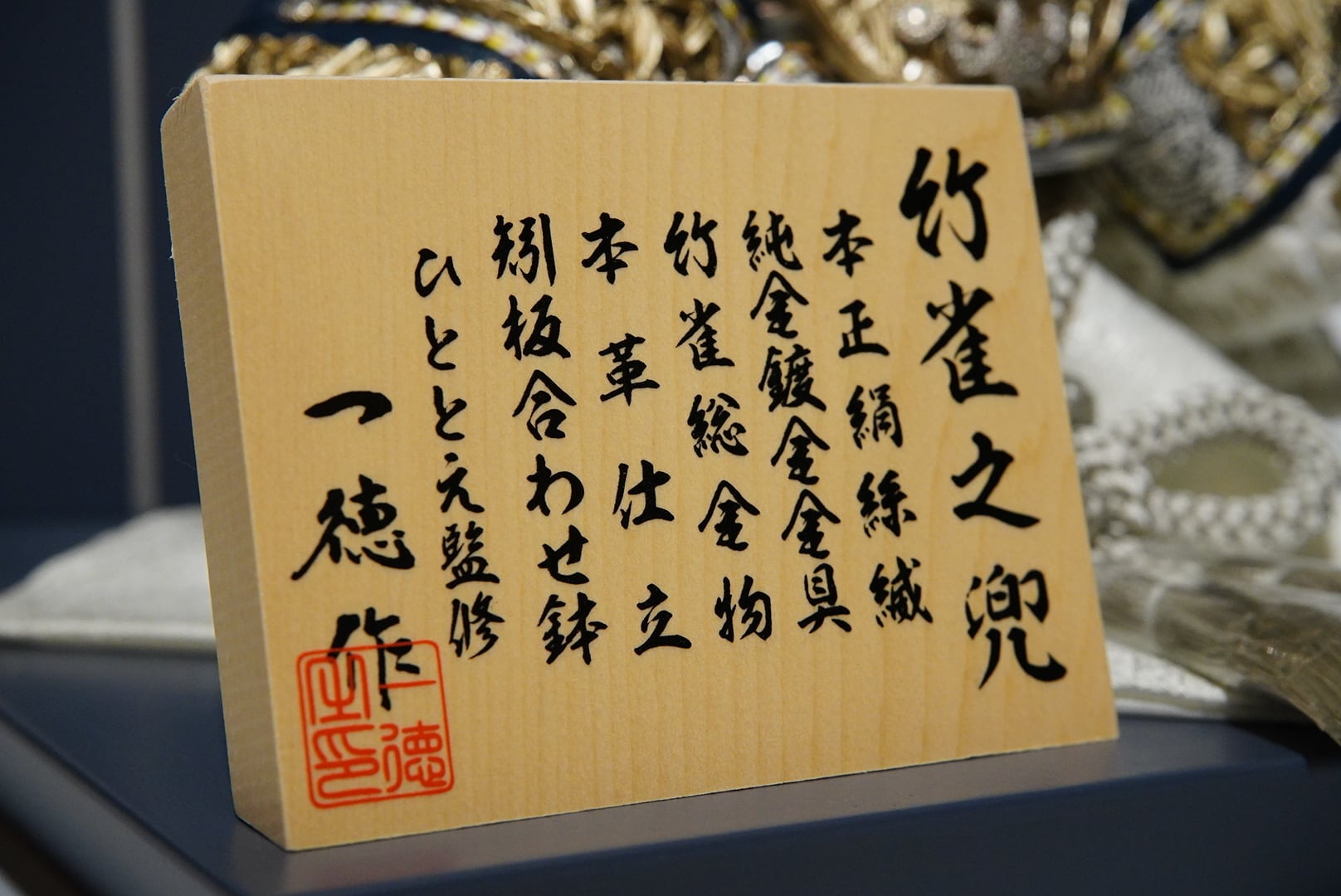 兜の金具には竹雀(たけすずめ)の文様をあしらい、竹の力強い成長と雀の家内安全・繁栄の願いを込めた、縁起の良い意匠に仕上げられています。