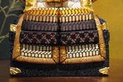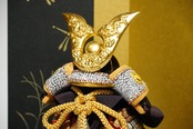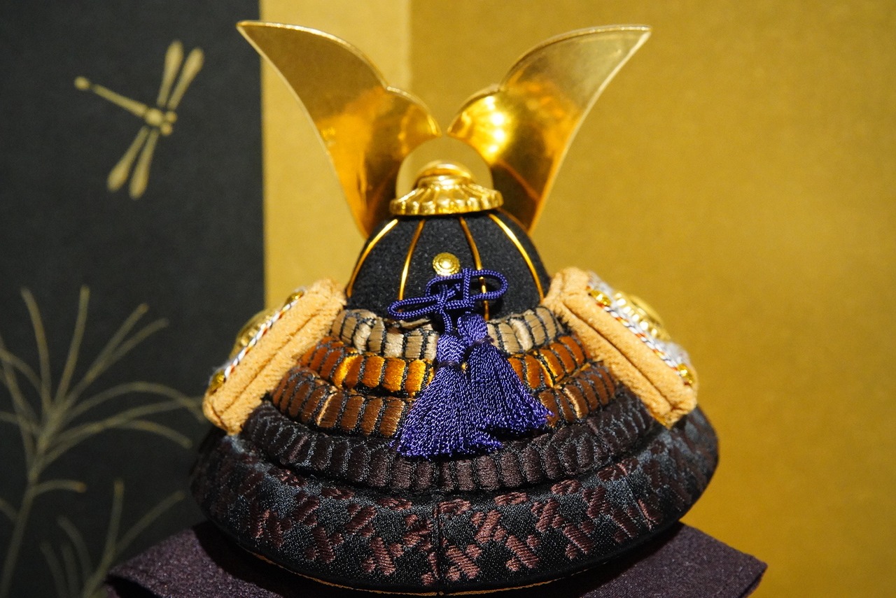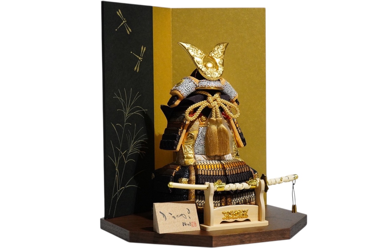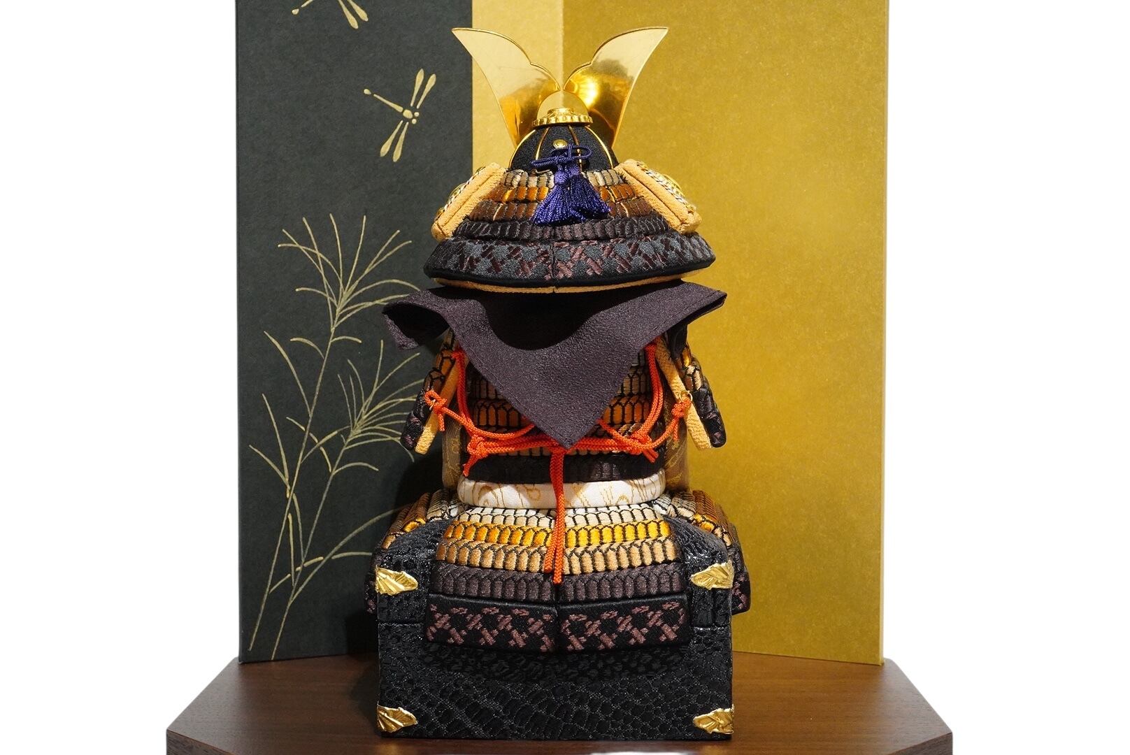 金と黒を基調に、洗練された配色でまとめられたひととえの木目込み鎧飾り。