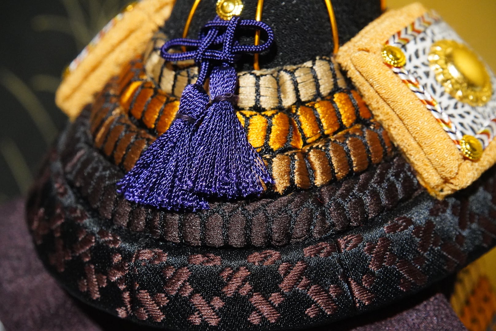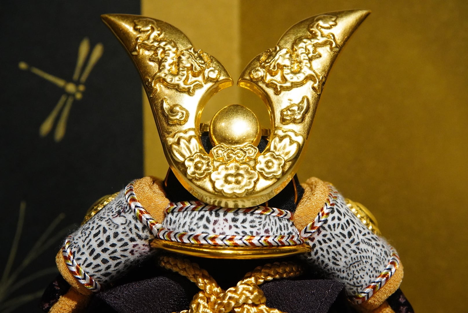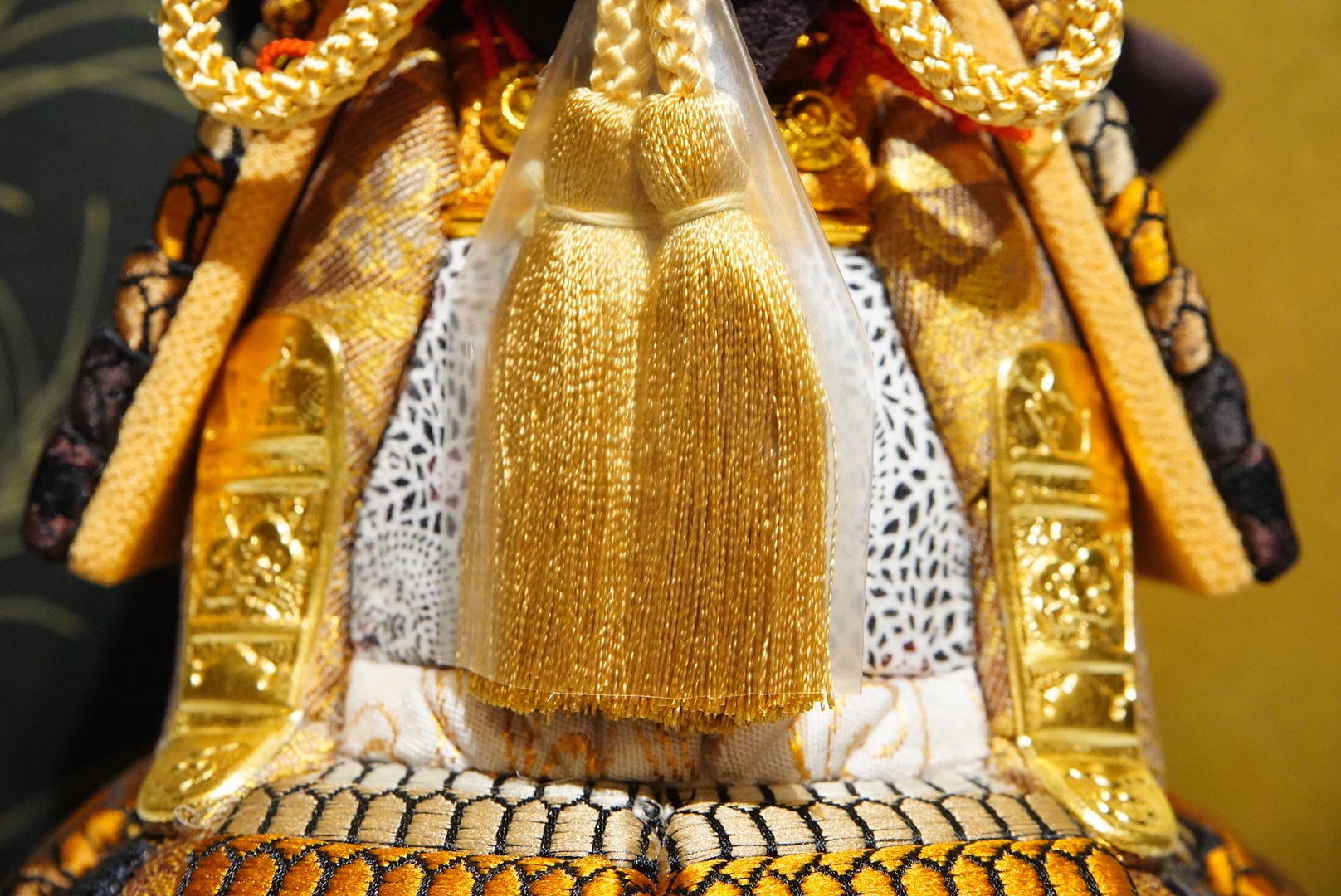 金と黒を基調に、洗練された配色でまとめられたひととえの木目込み鎧飾り。