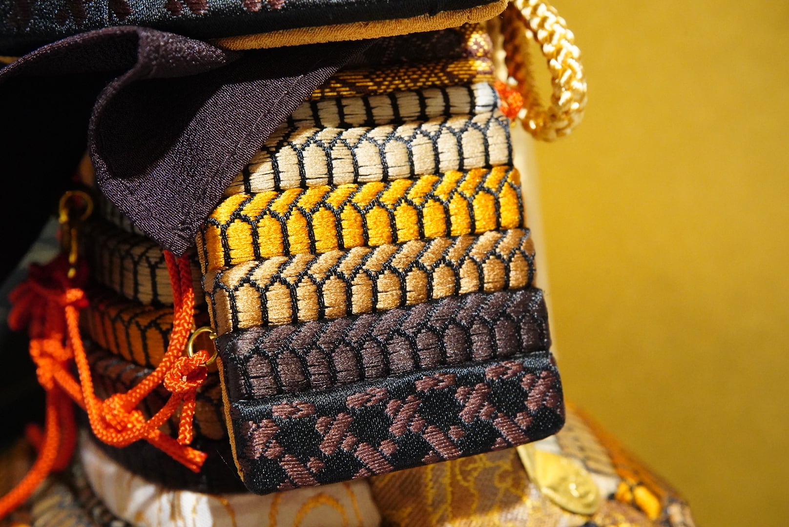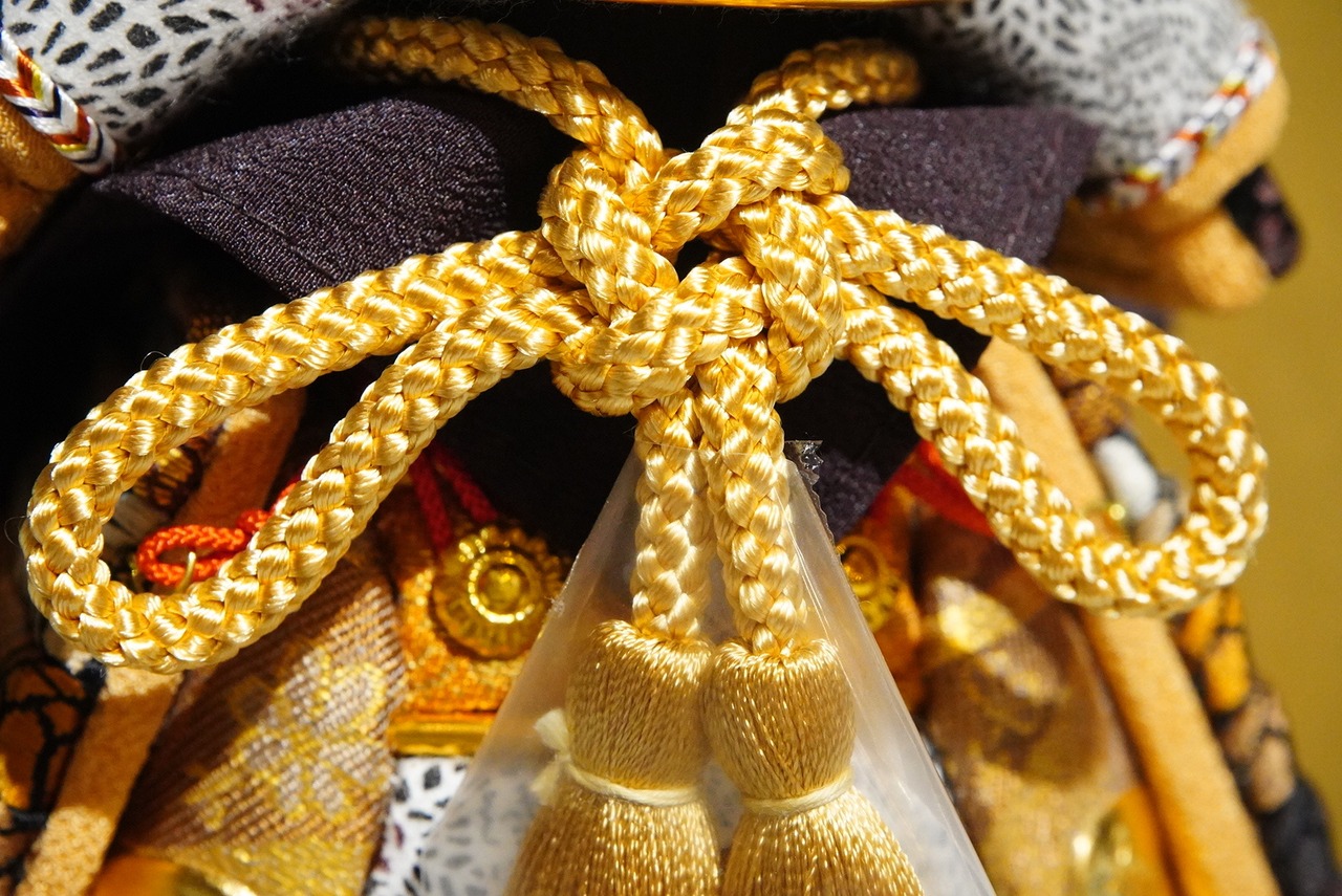 鎧の色合いと調和し、全体を引き締めながら、静かな華やかさを添えています。