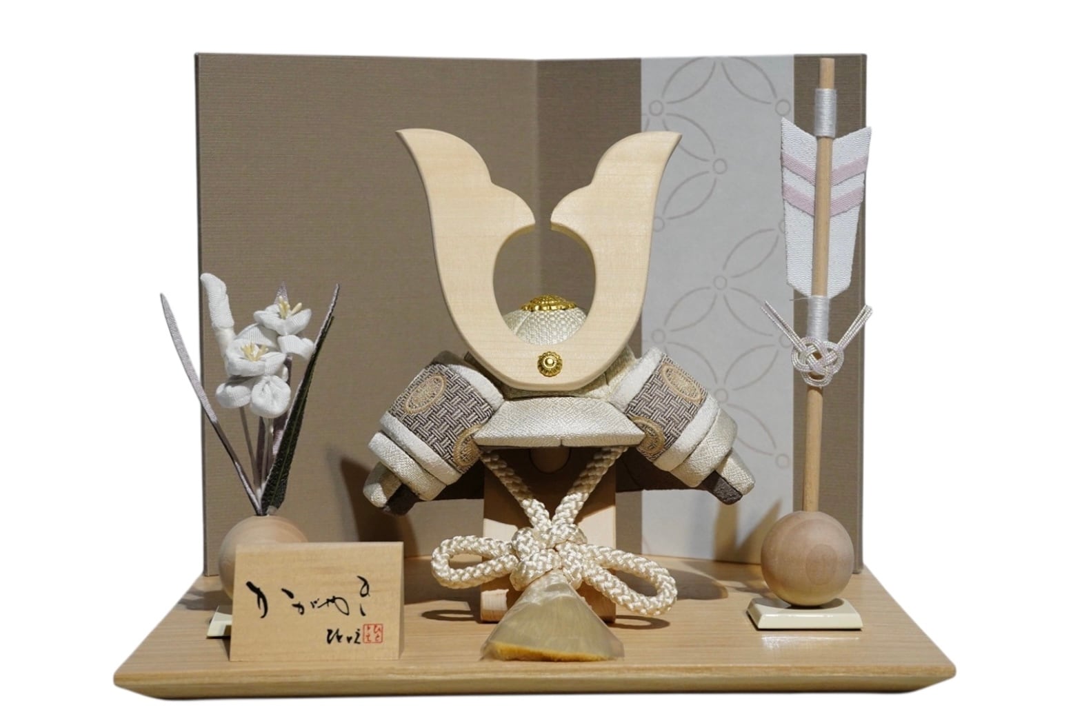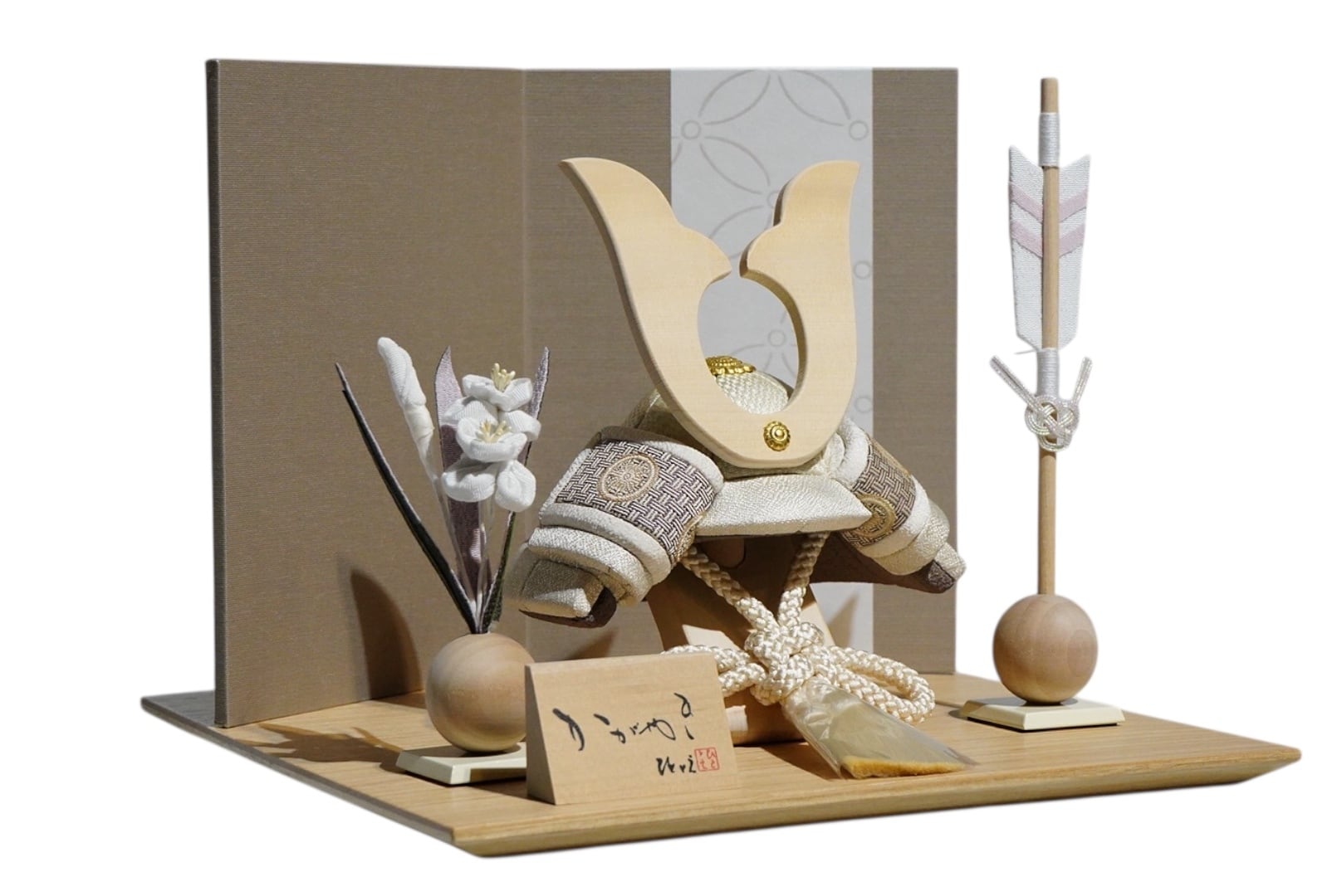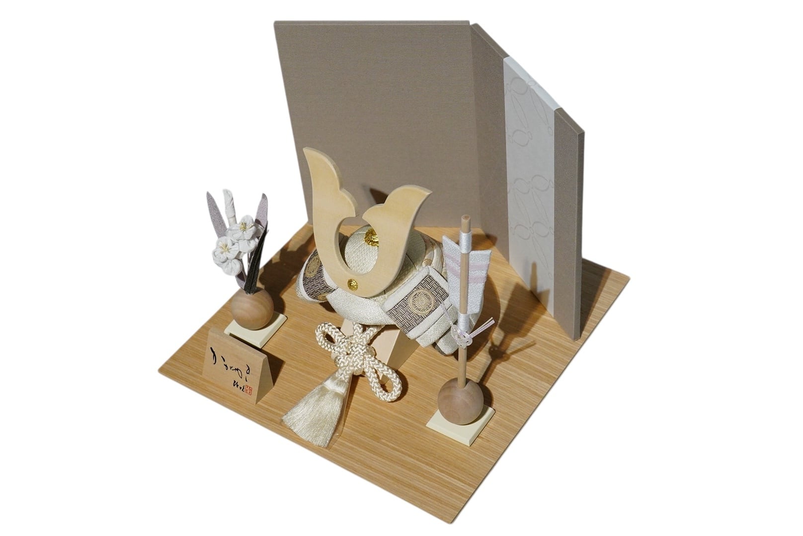 やさしい木の温もりと、洗練された意匠が調和する、ひととえの木目込み兜飾り。