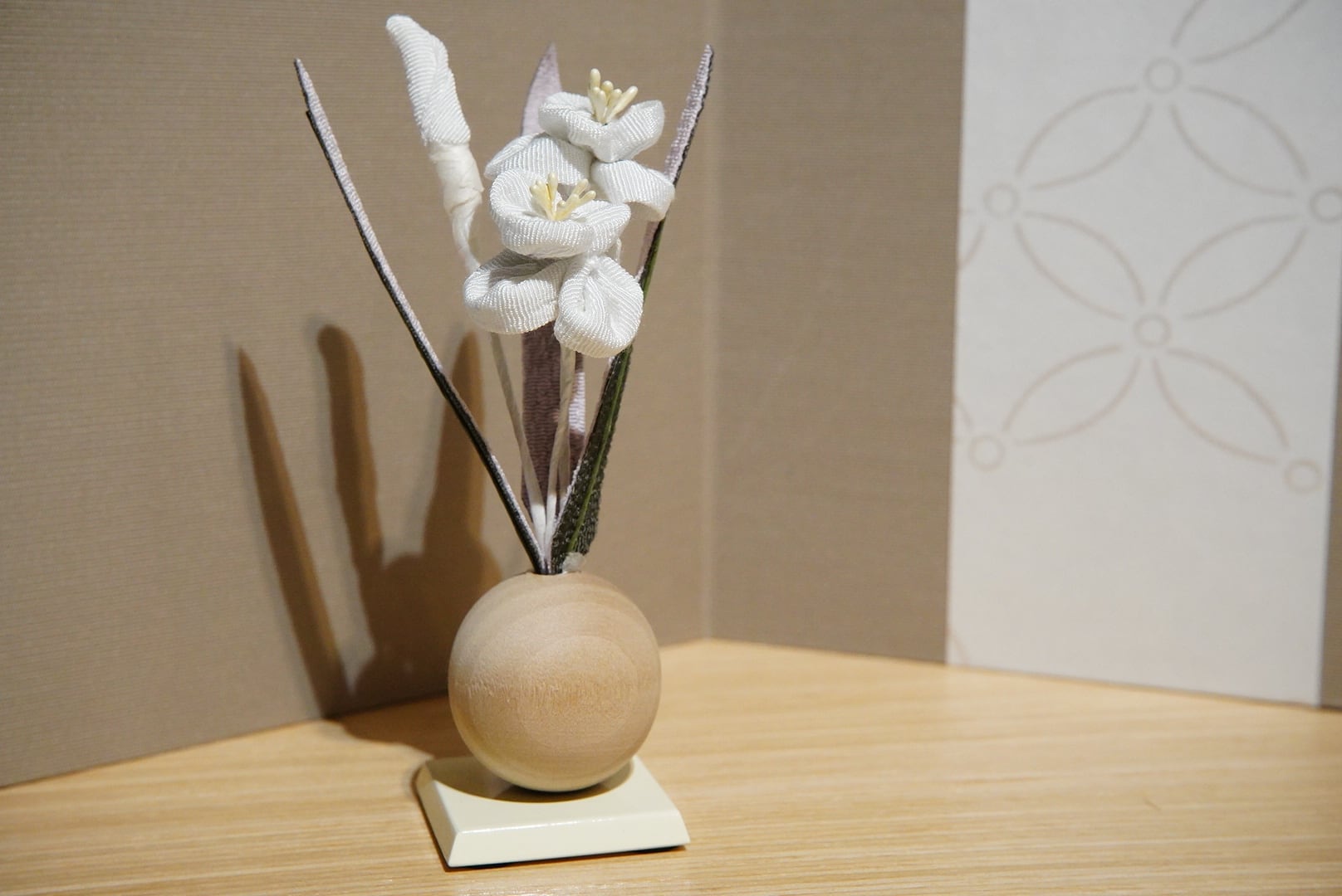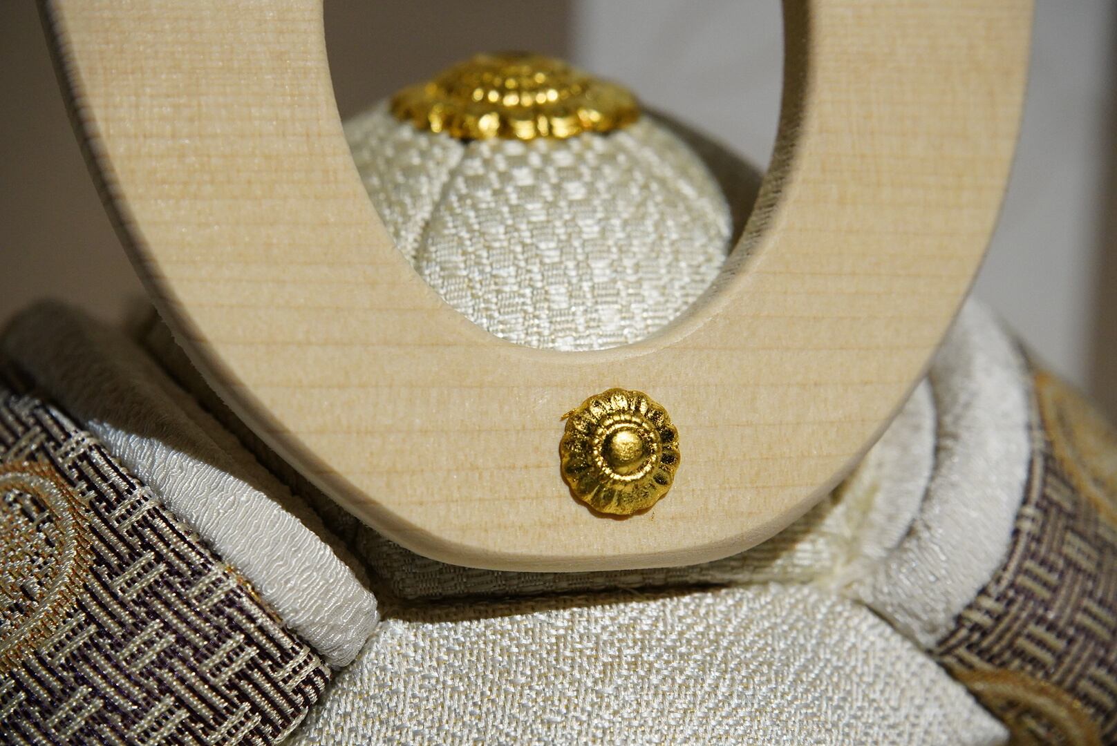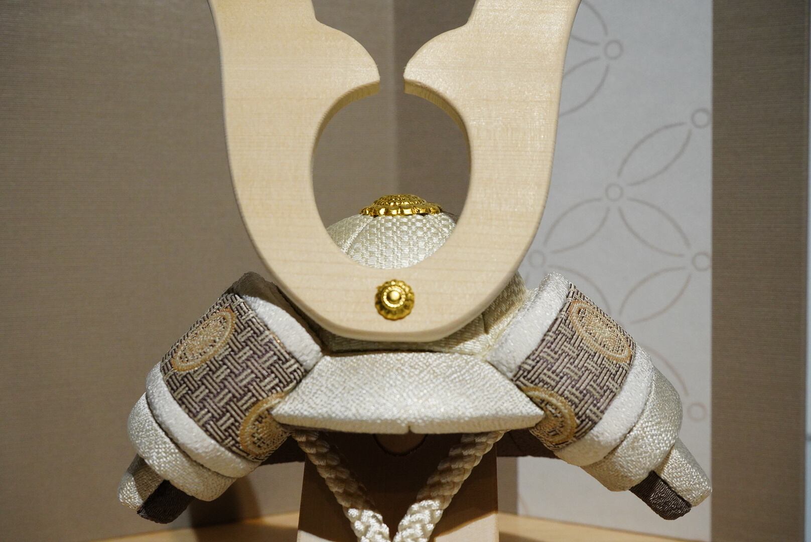 やさしい木の温もりと、洗練された意匠が調和する、ひととえの木目込み兜飾り。