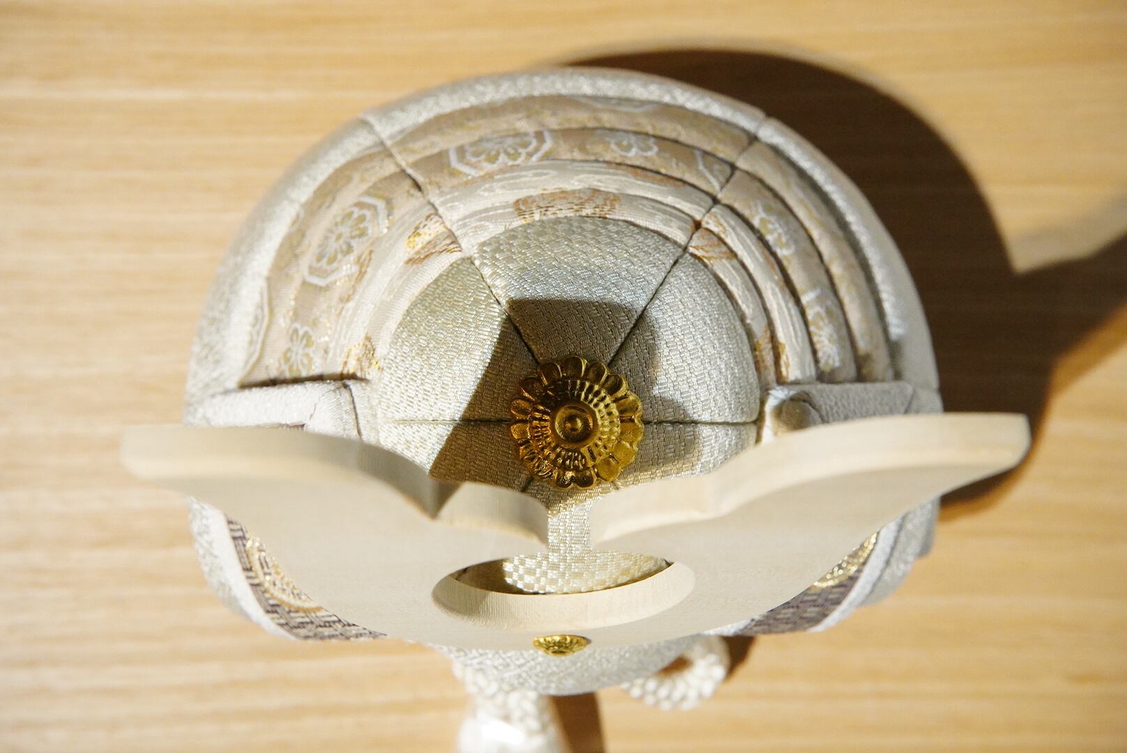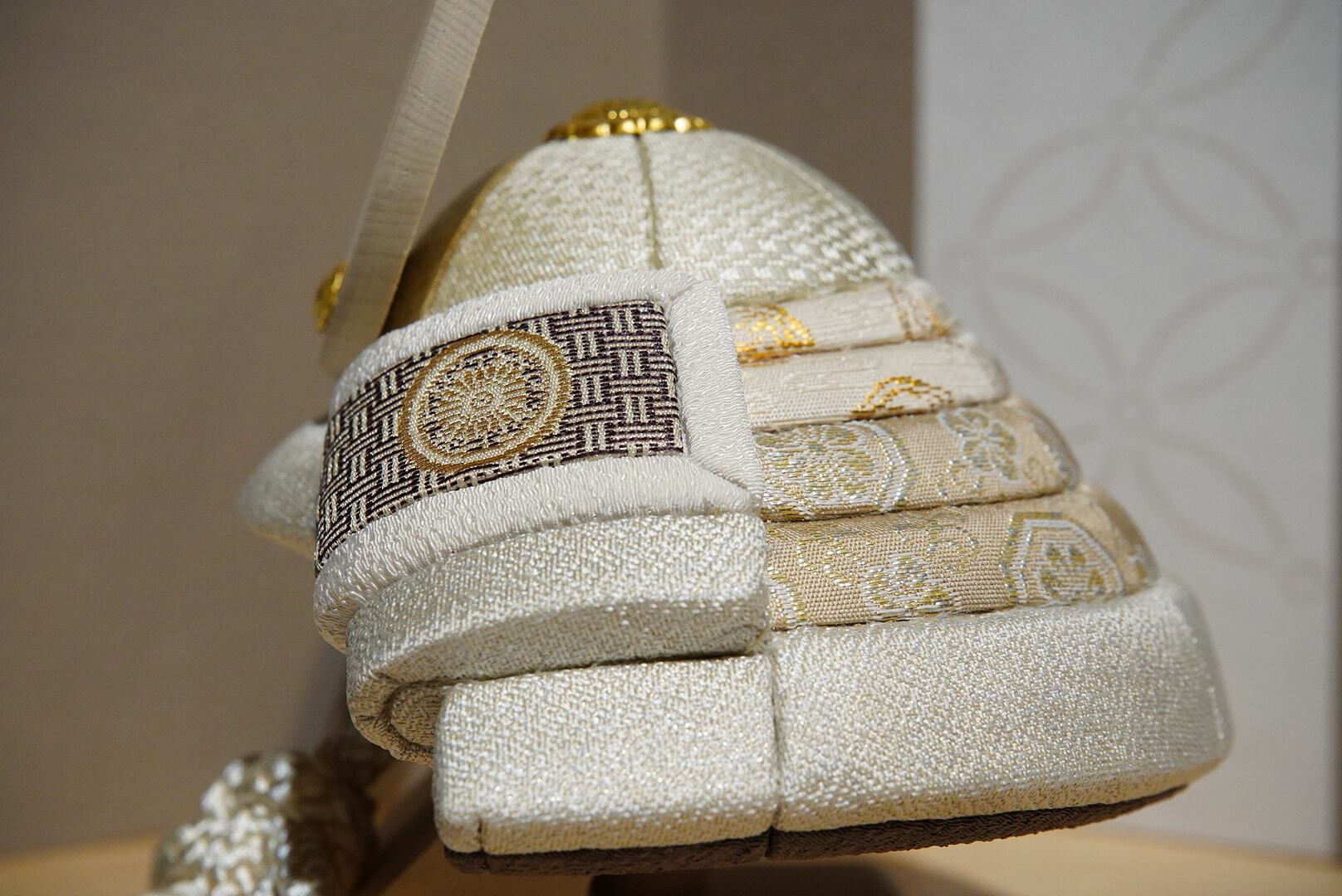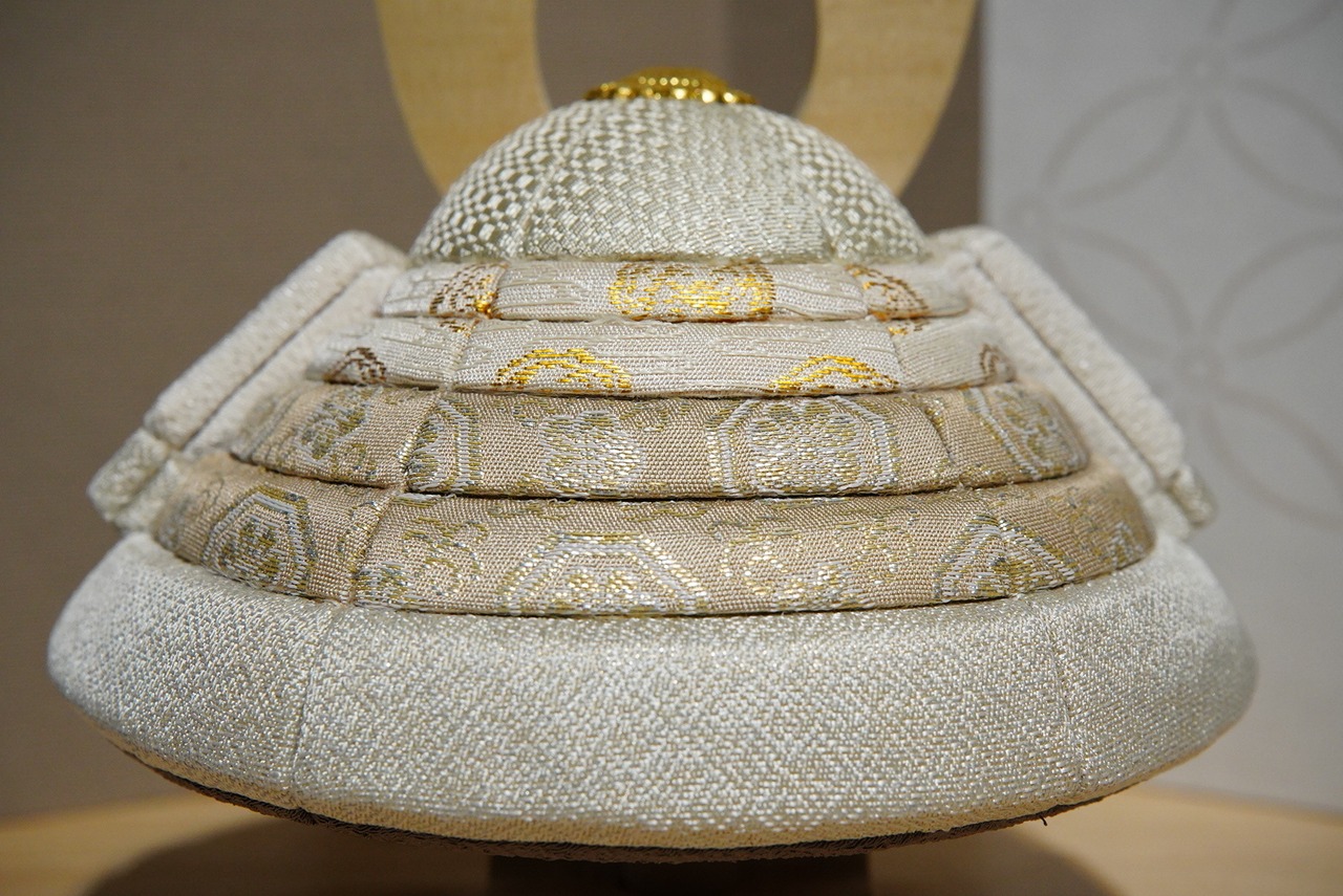 淡く上品な色合いでまとめられた兜は、伝統的な木目込み技法により、一つひとつ丁寧に仕立てられています。なめらかな曲線を描く兜鉢と、柔らかな風合いの裂地が織りなす佇まいは、凛としながらもどこか穏やか。現代の住空間にも自然と溶け込む、洗練された美しさが魅力です。