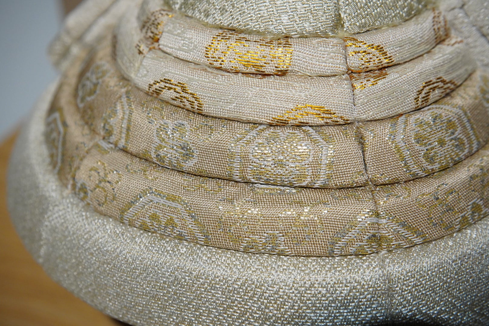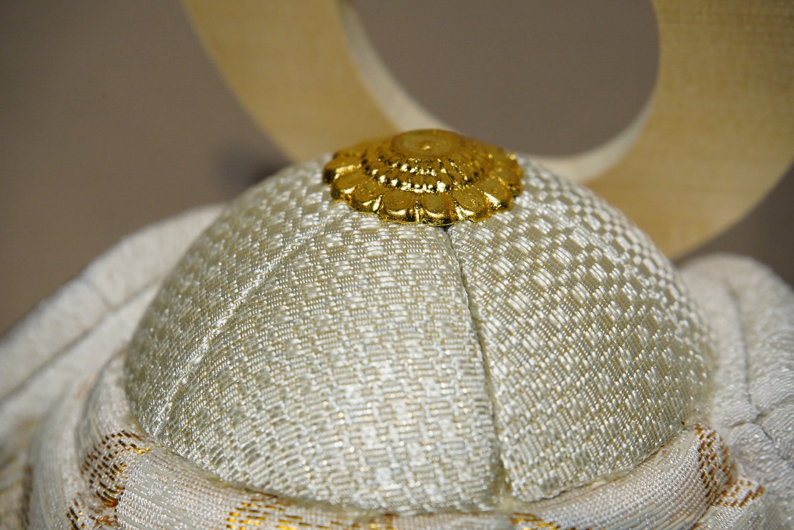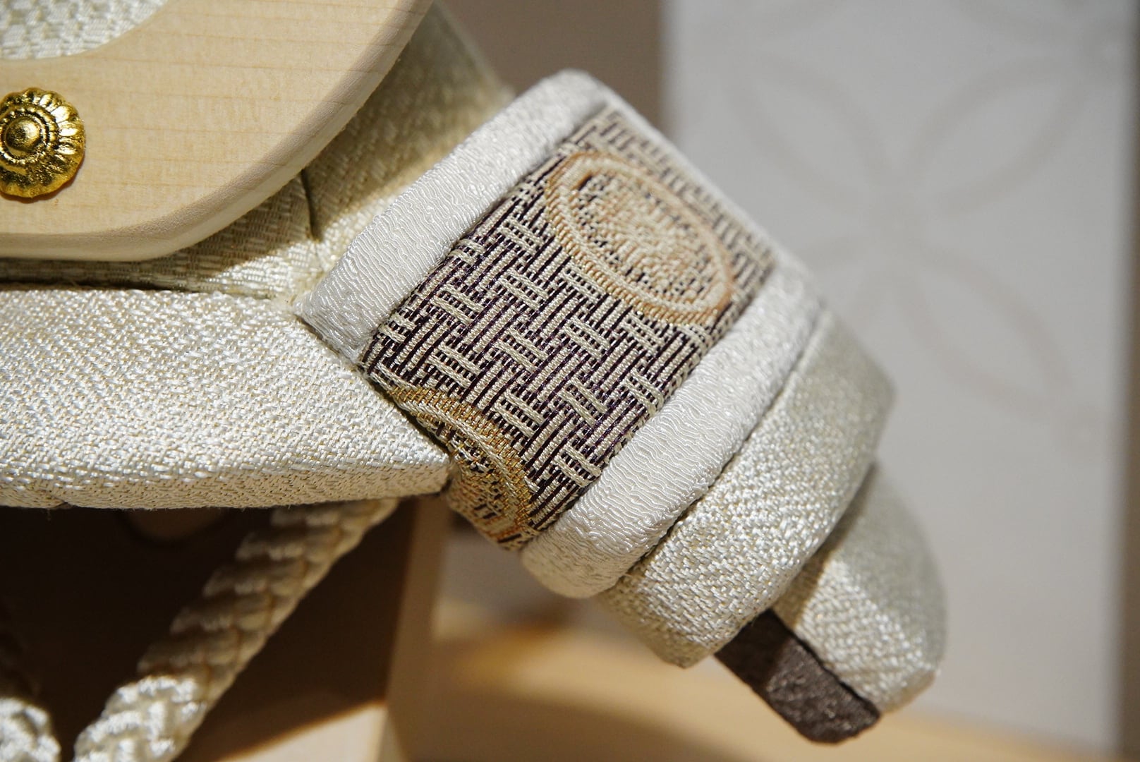 淡く上品な色合いでまとめられた兜は、伝統的な木目込み技法により、一つひとつ丁寧に仕立てられています。なめらかな曲線を描く兜鉢と、柔らかな風合いの裂地が織りなす佇まいは、凛としながらもどこか穏やか。現代の住空間にも自然と溶け込む、洗練された美しさが魅力です。