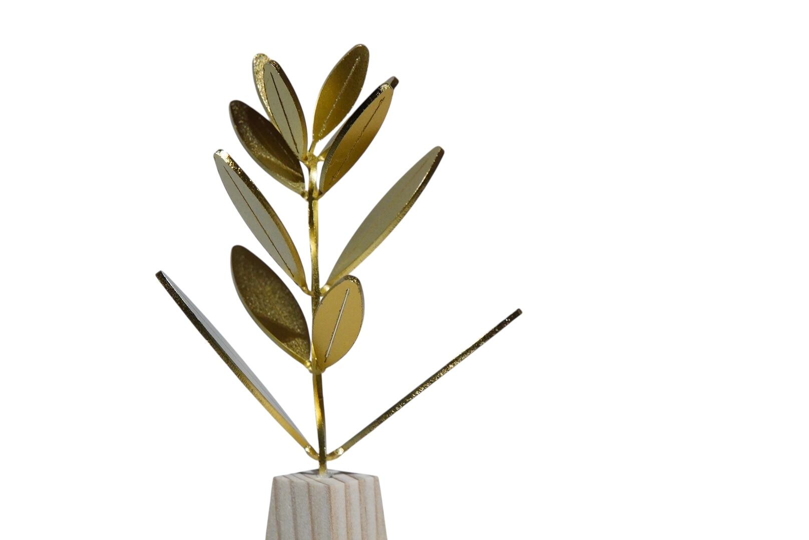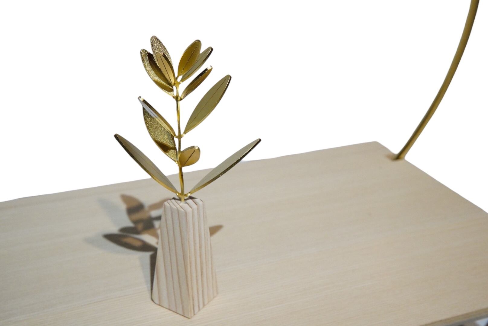 装飾を抑えたシンプルな構成ながらも、金属フレームの艶やかさと木目の台座が調和し、現代の住空間にも自然に溶け込む一品。