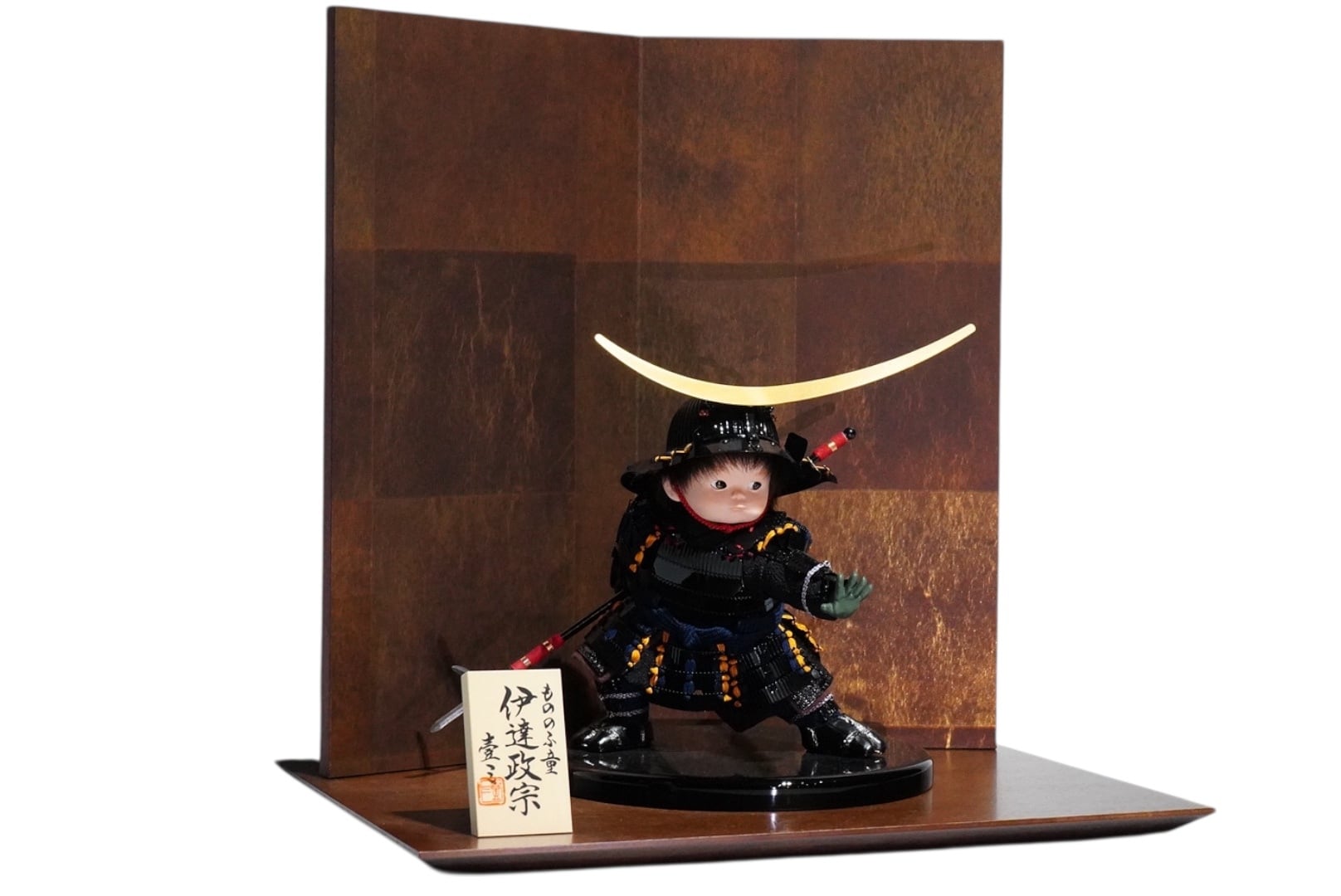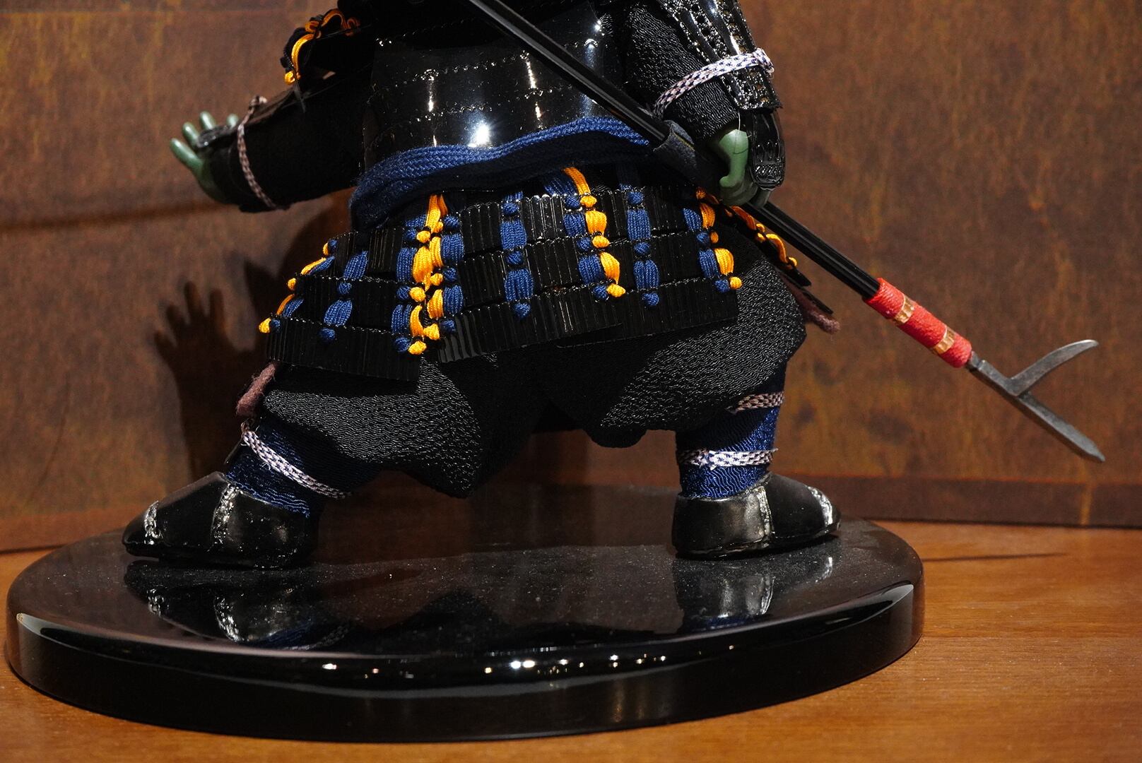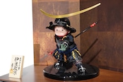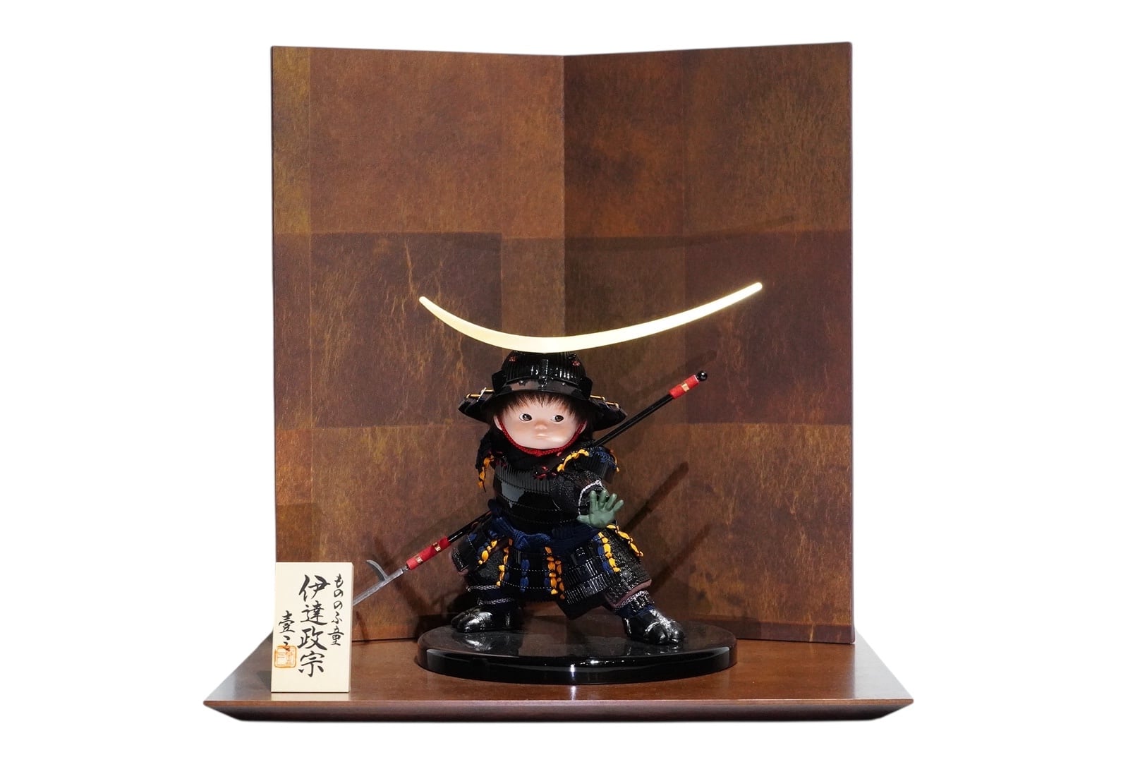 凛々しい眼差しとあどけなさをあわせ持つ面差しに、艶やかな黒鎧をまとい、躍動感あふれる構えで仕立てられています。