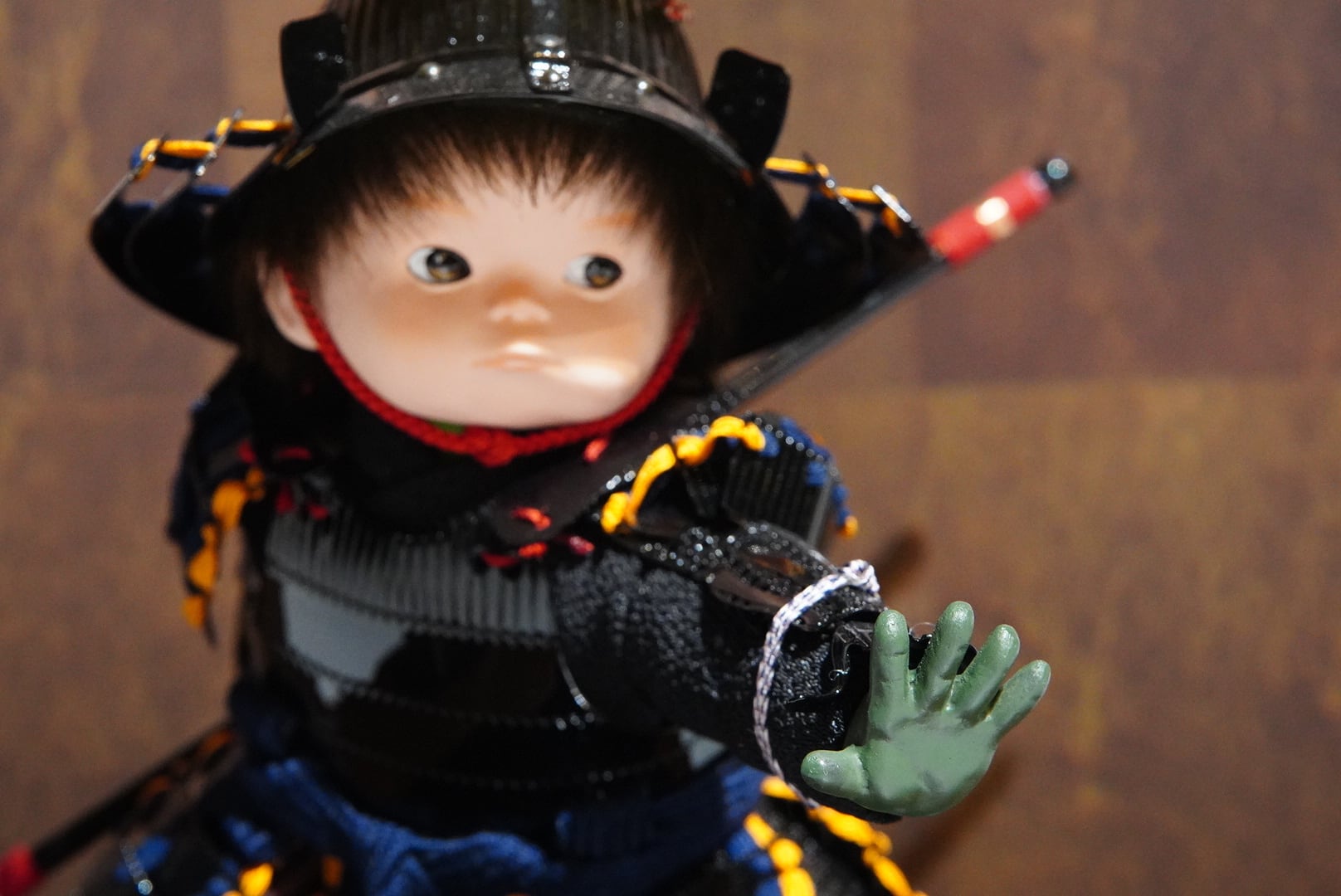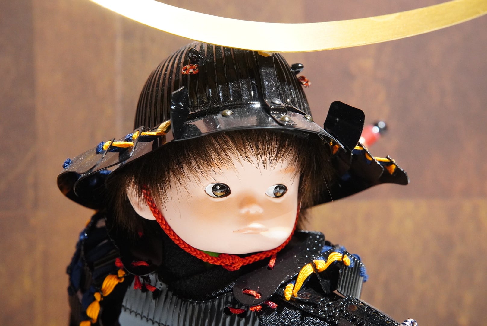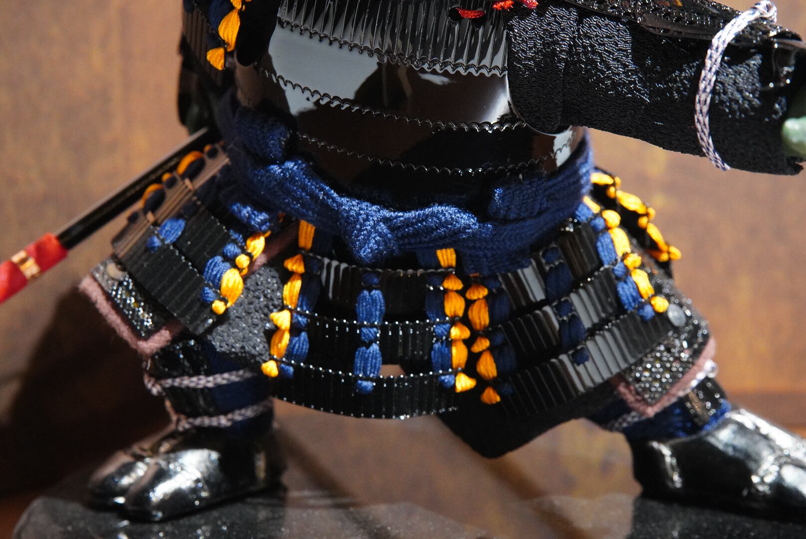 凛々しい眼差しとあどけなさをあわせ持つ面差しに、艶やかな黒鎧をまとい、躍動感あふれる構えで仕立てられています。