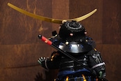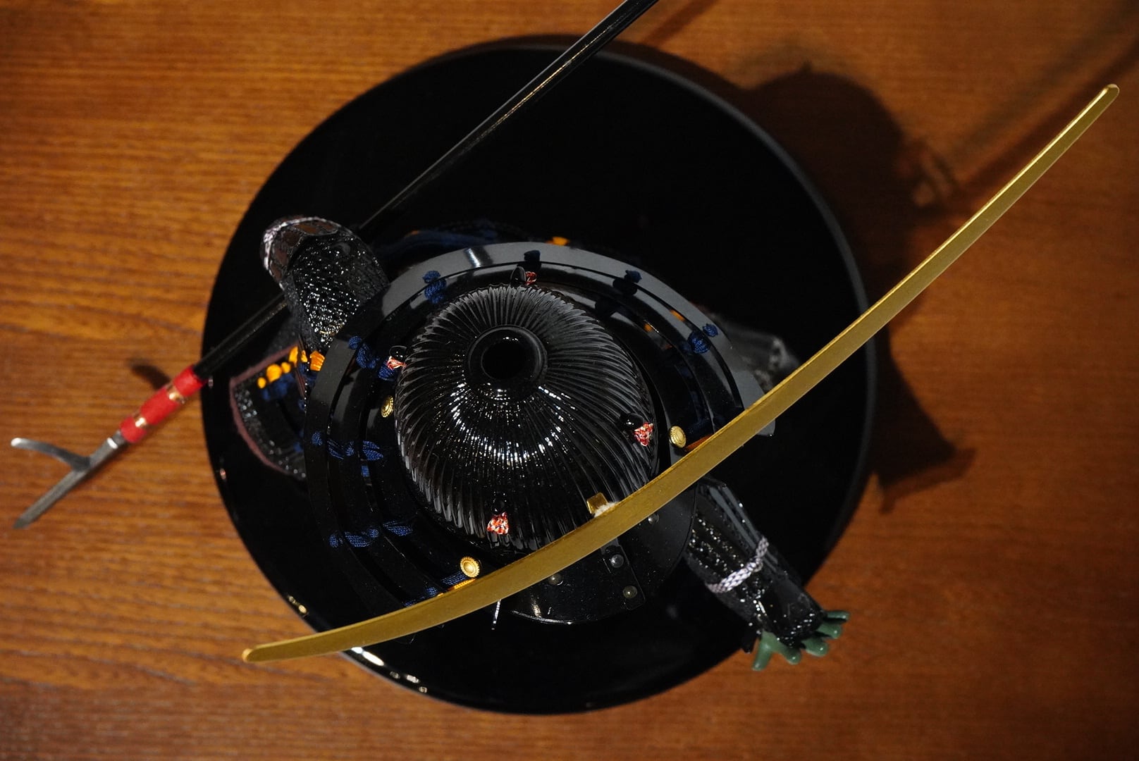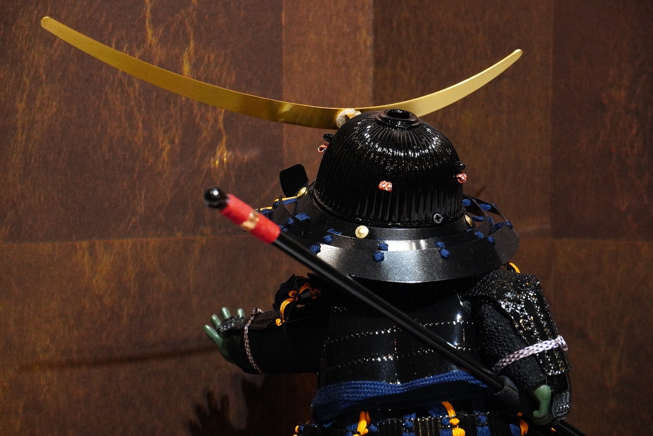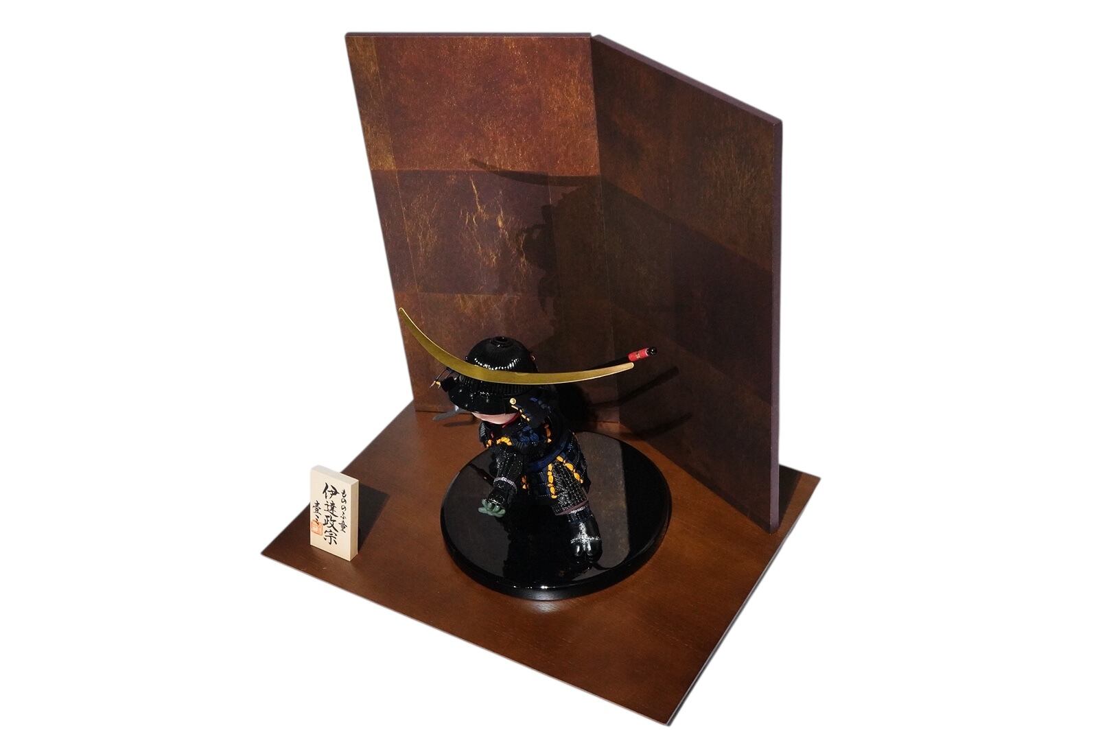 深い黒を基調とした甲冑に、さりげなく配された金や紺の威しが品格を添え、政宗公の象徴である弦月形の前立てがひときわ印象的に映えます。
