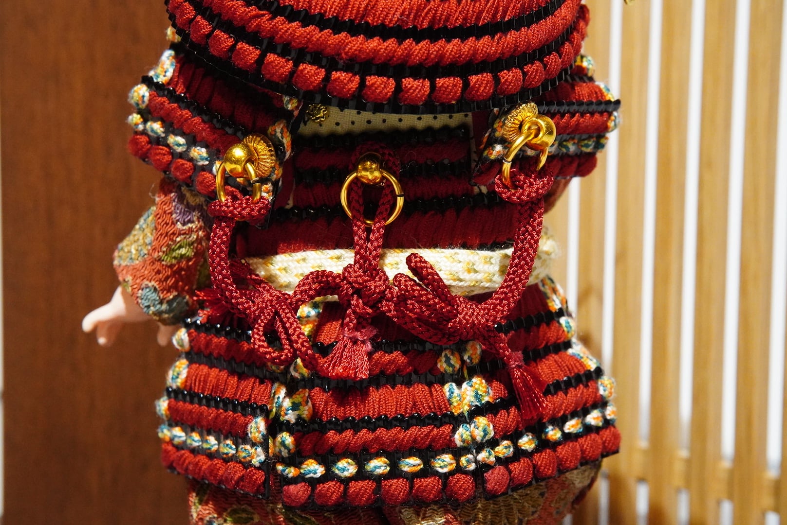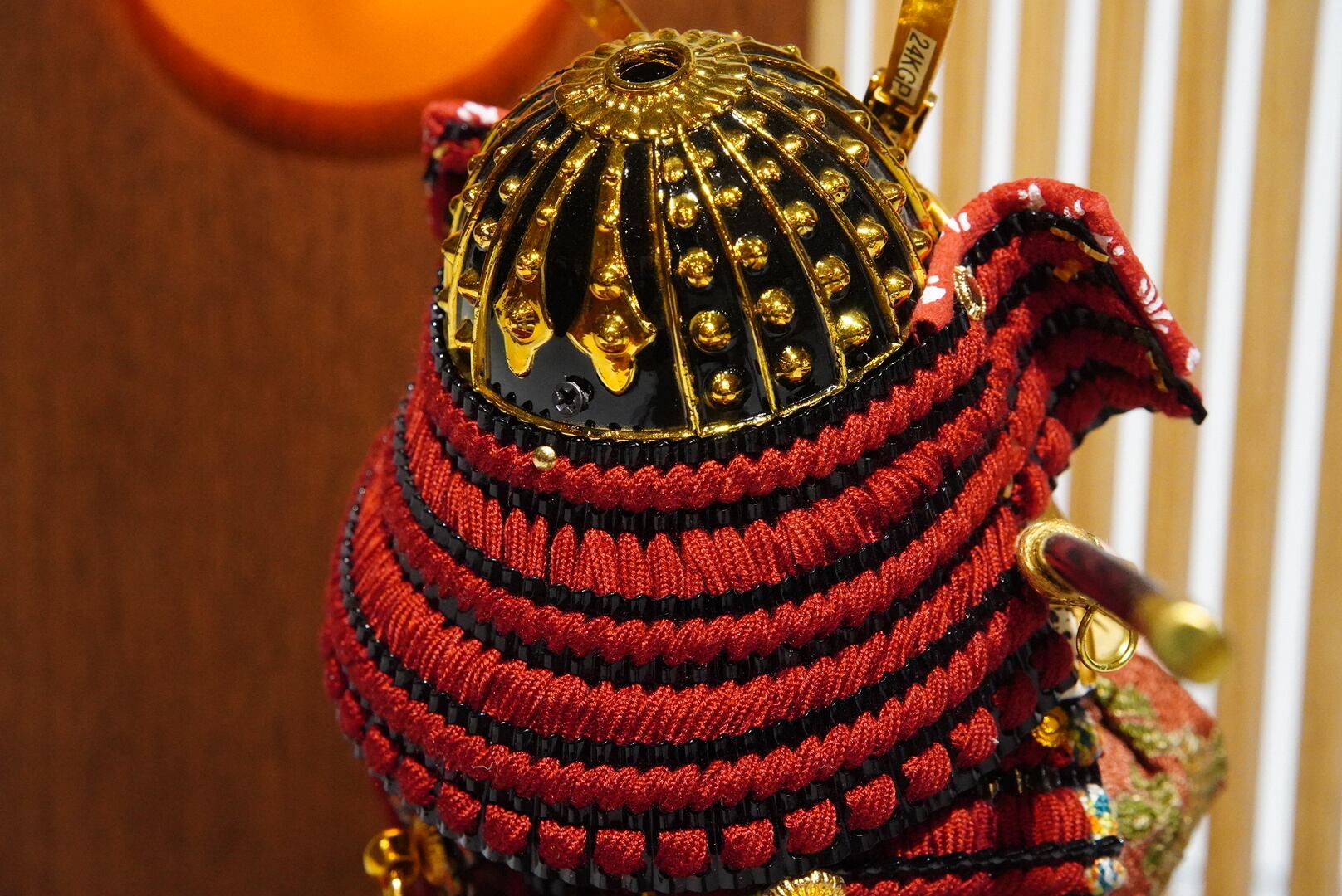 やわらかな面差しの若武者が、重厚な赤糸威の鎧をまとい、金の鍬形が美しく映える兜を戴いた姿は、気品と力強さを兼ね備えています。