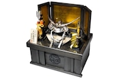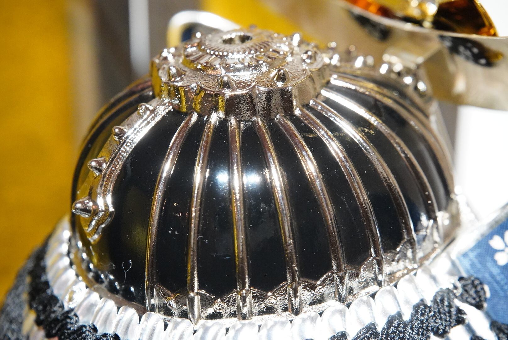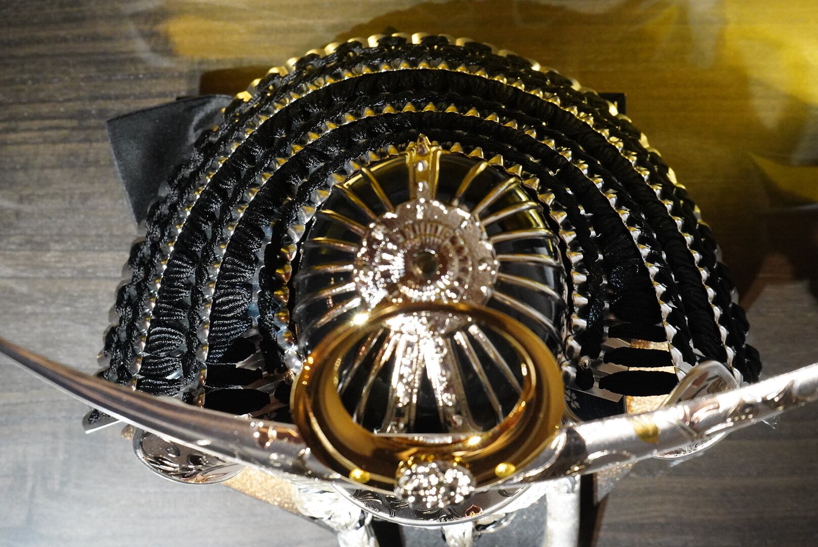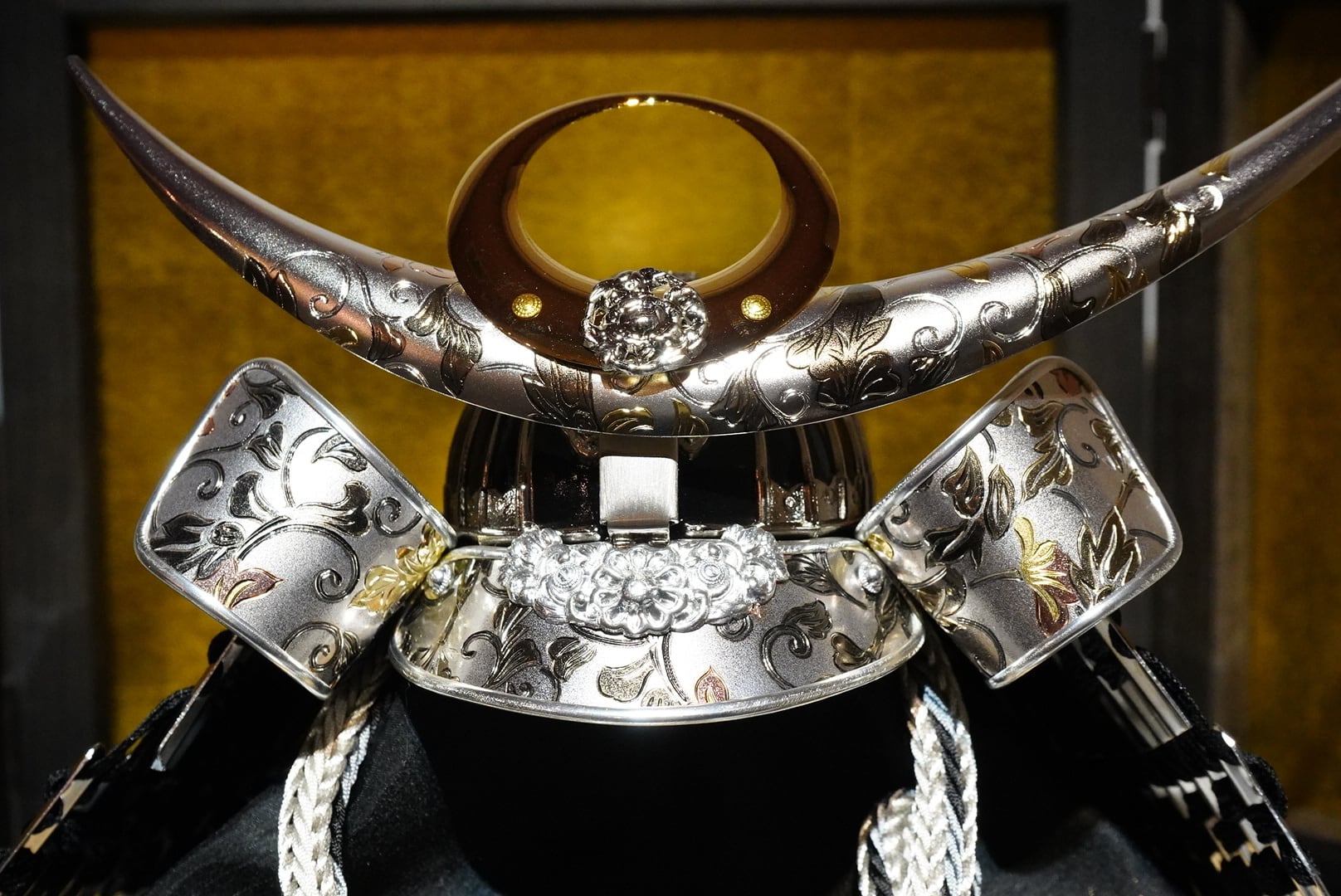 背景には温かみのある金屏風を配し、兜の陰影をやわらかく引き立てる上品な設え。