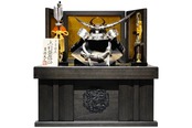 落ち着いた木目調の台座に、気品ある銀色の鍬形が美しく映える吉徳大光の兜飾り。